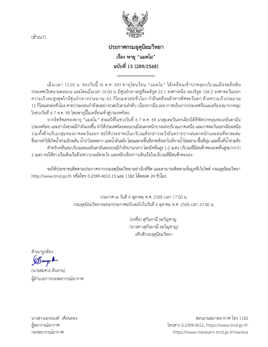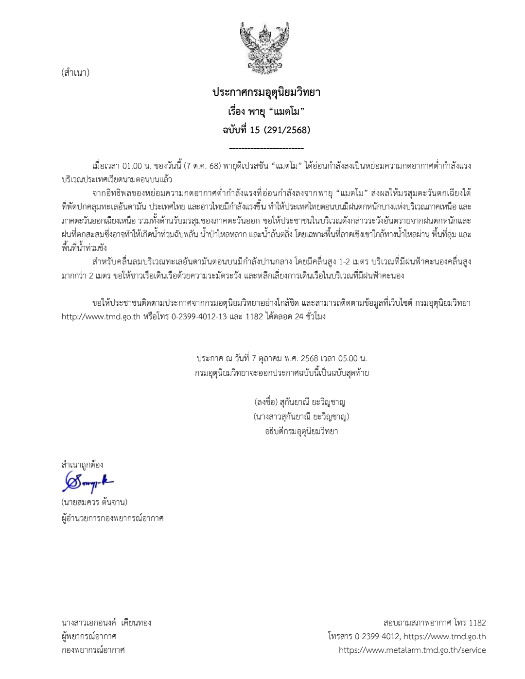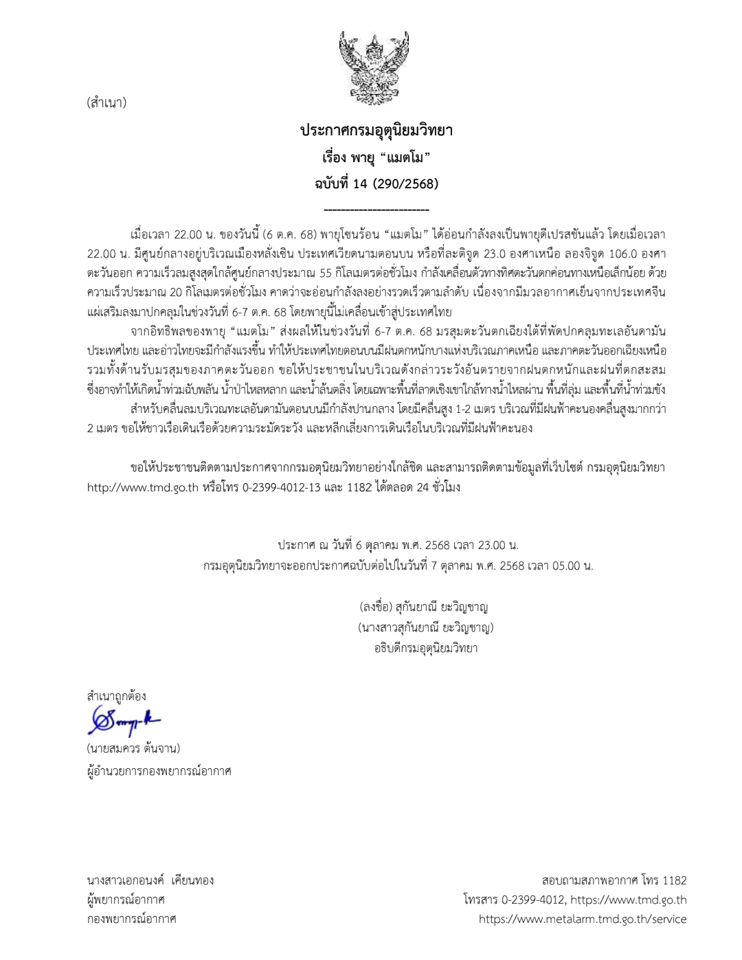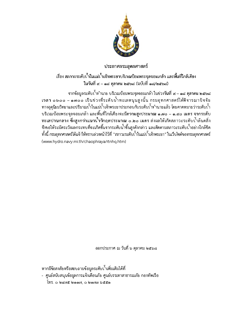 ประกาศกรมอุทกศาสตร์ เรื่อง สภาวะระดับน้ำในแม่น้ำเจ้าพระยา วันที่ 9 - 18 ต.ค. 2568