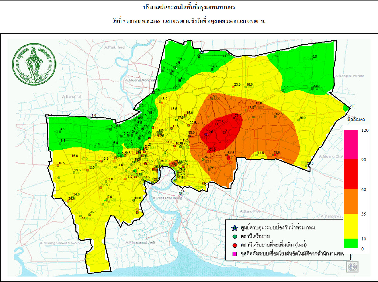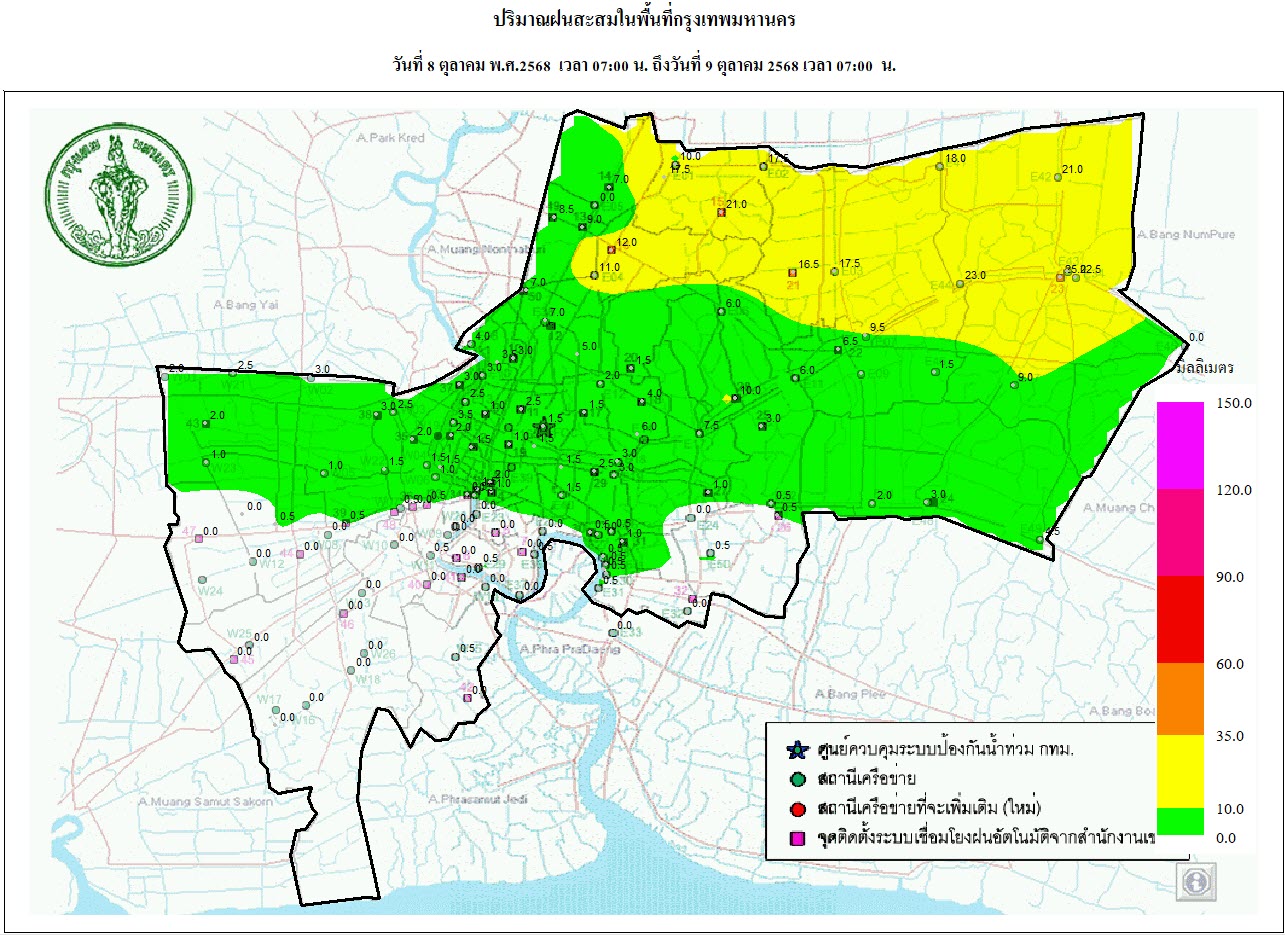 วันที่ 9 ตุลาคม 2568 เวลา 09.00 น. /พื้นที่ กทม. ไม่พบกลุ่มฝน / อุณหภูมิที่สำนักการระบายน้ำ 29 องศาเซลเซียส ความชื้นสัมพัทธ์ 80%
