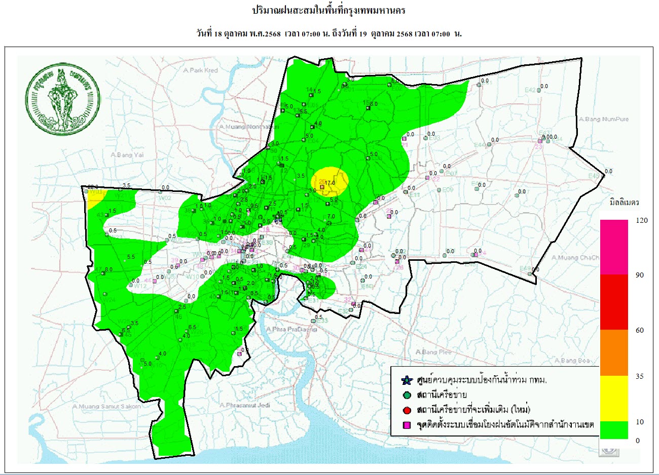 วันที่ 19 ตุลาคม 2568 เวลา 08.00 น. / พื้นที่ กทม. ไม่พบกลุ่มฝน / อุณหภุฒิที่สำนักการระบายน้ำ 28 องศาเซลเซียส ความชื้นสัมพัทธ์ 85%