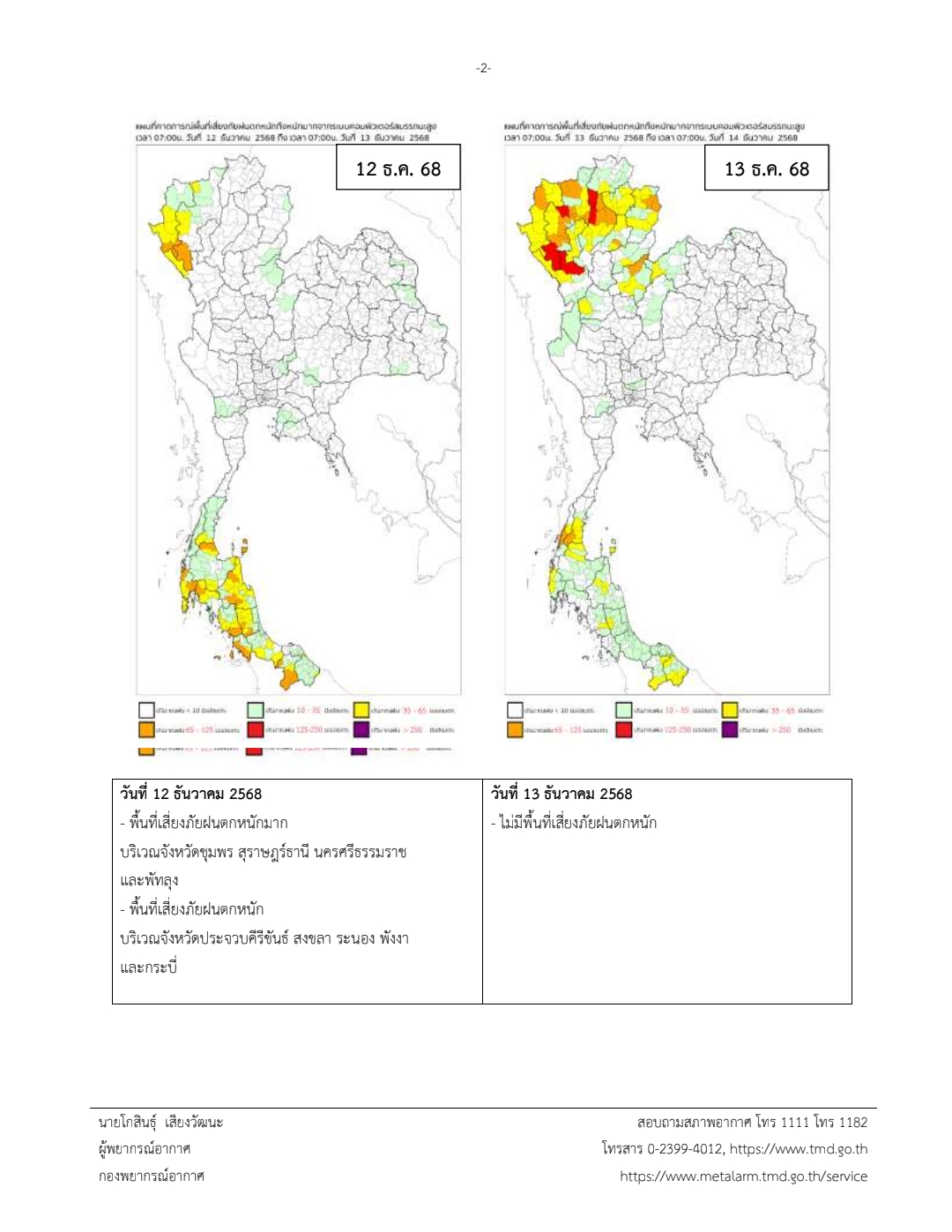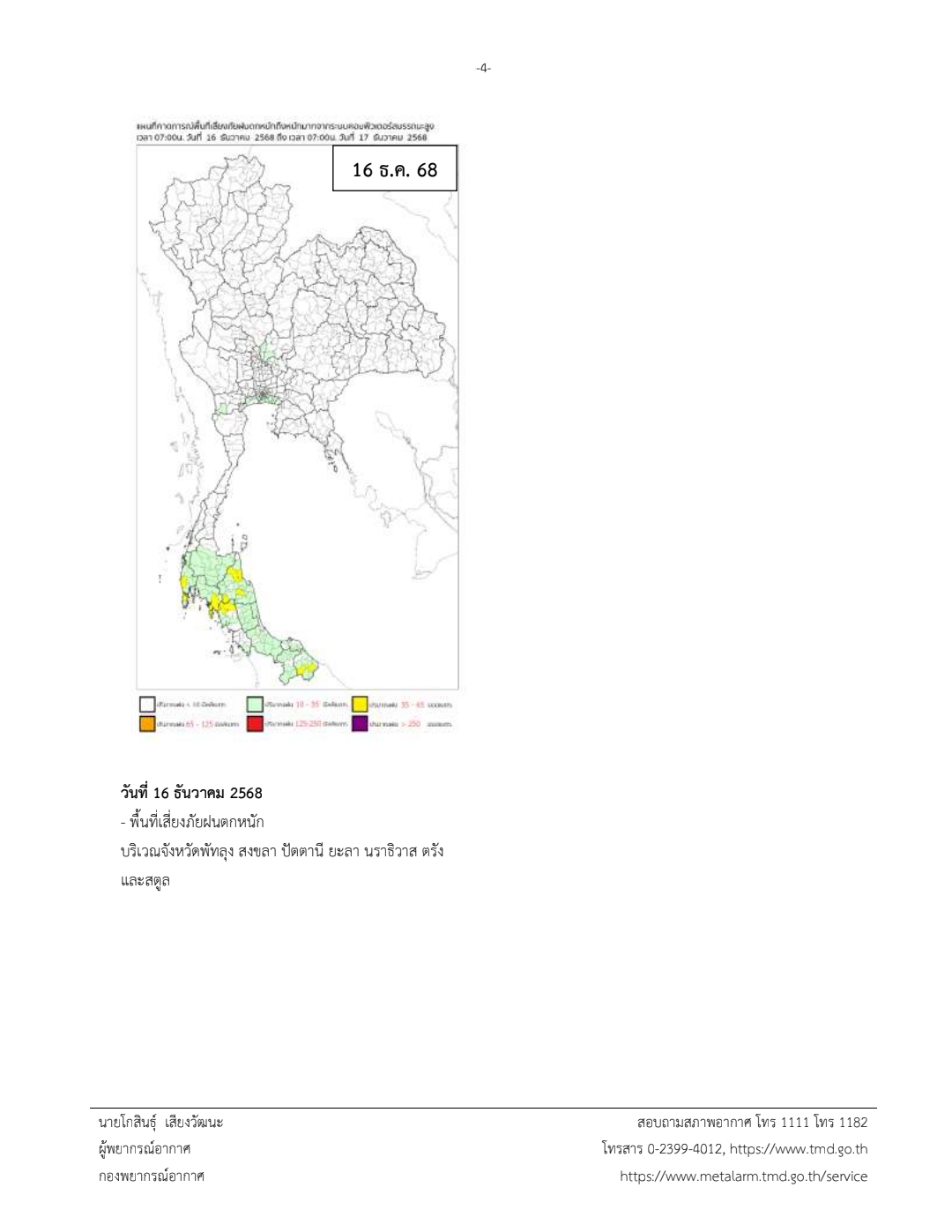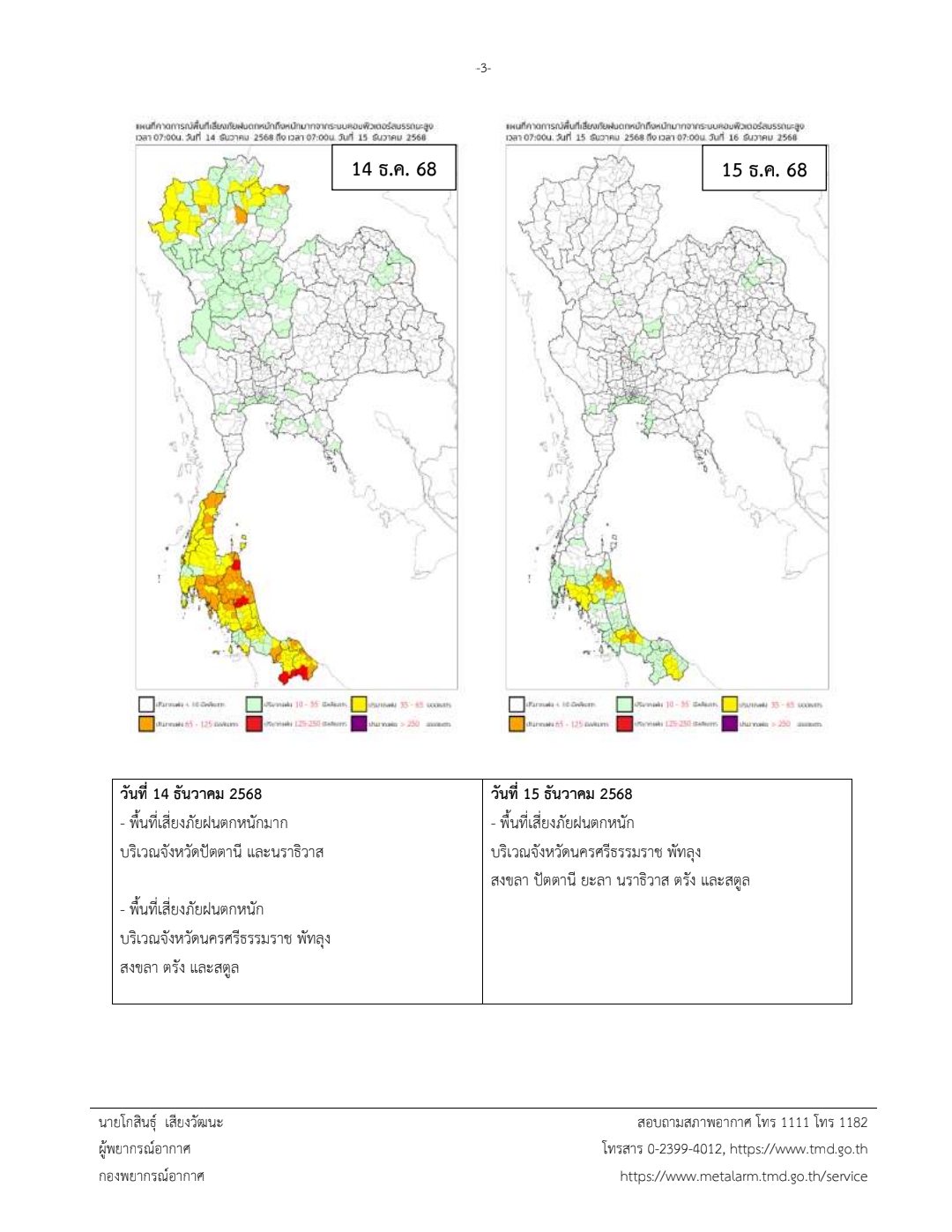 ประกาศกรมอุตุนิยมวิทยา เรื่อง ฝนตกหนักถึงหนักมากบริเวณภาคใต้ และคลื่นลมแรงบริเวณอ่าวไทย (มีผลกระทบตั้งแต่วันที่ 12-16 ธันวาคม 2568) ฉบับที่ 15