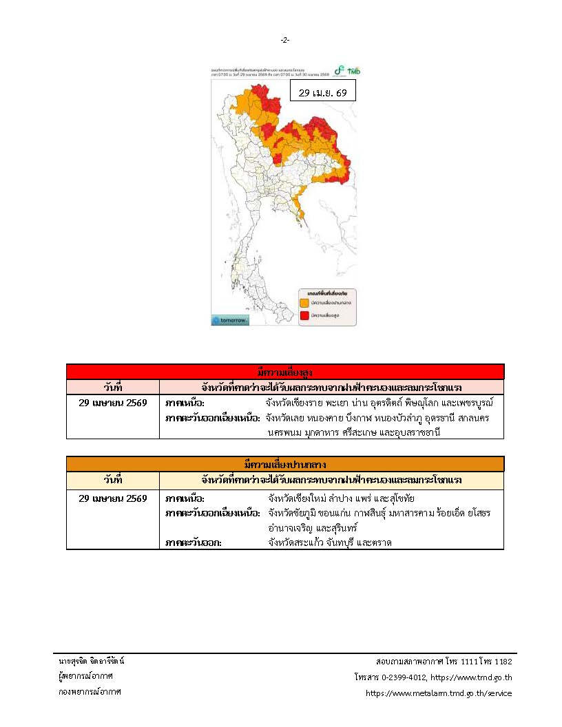 ประกาศกรมอุตุนิยมวิทยา เรื่อง พายุฤดูร้อนบริเวณประเทศไทยตอนบน (มีผลกระทบตั้งแต่วันที่ 29 เมษายน – 1 พฤษภาคม 2569) ฉบับที่ 2