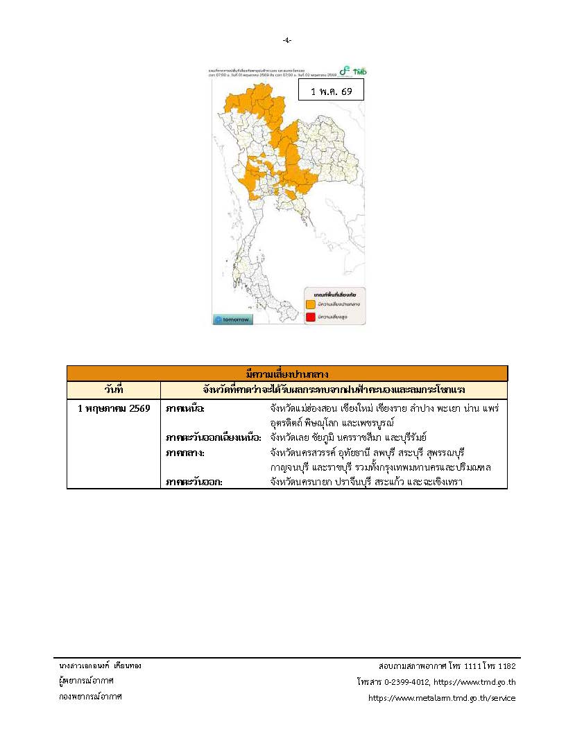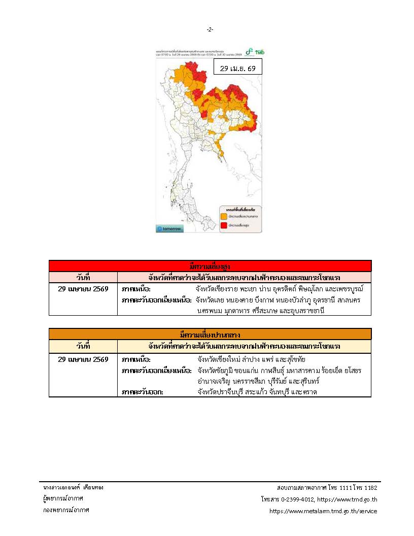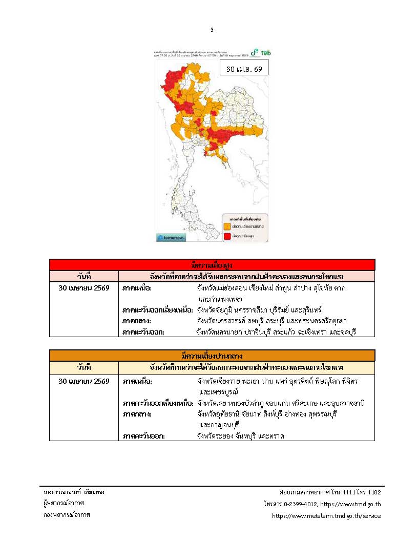 ประกาศกรมอุตุนิยมวิทยา เรื่อง พายุฤดูร้อนบริเวณประเทศไทยตอนบน (มีผลกระทบตั้งแต่วันที่ 29 เมษายน – 1 พฤษภาคม 2569) ฉบับที่ 3