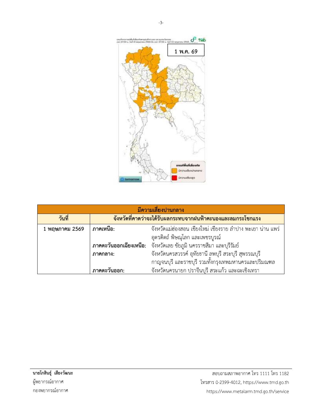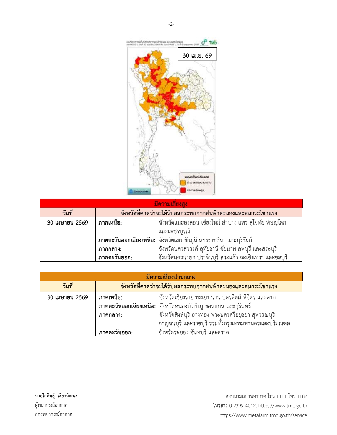 ประกาศกรมอุตุนิยมวิทยา เรื่อง พายุฤดูร้อนบริเวณประเทศไทยตอนบน (มีผลกระทบจนถึงวันที่ 1 พฤษภาคม 2569) ฉบับที่ 7