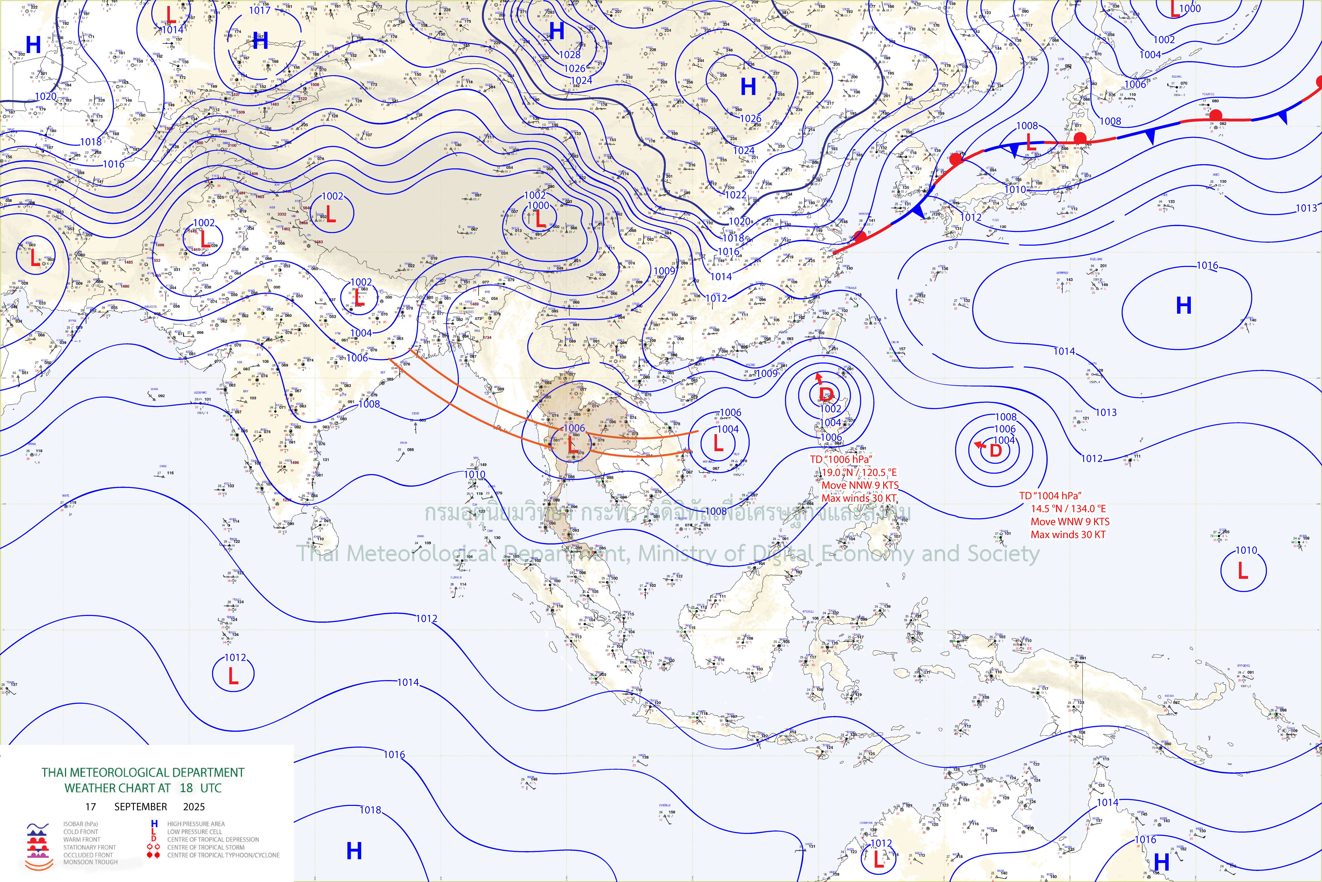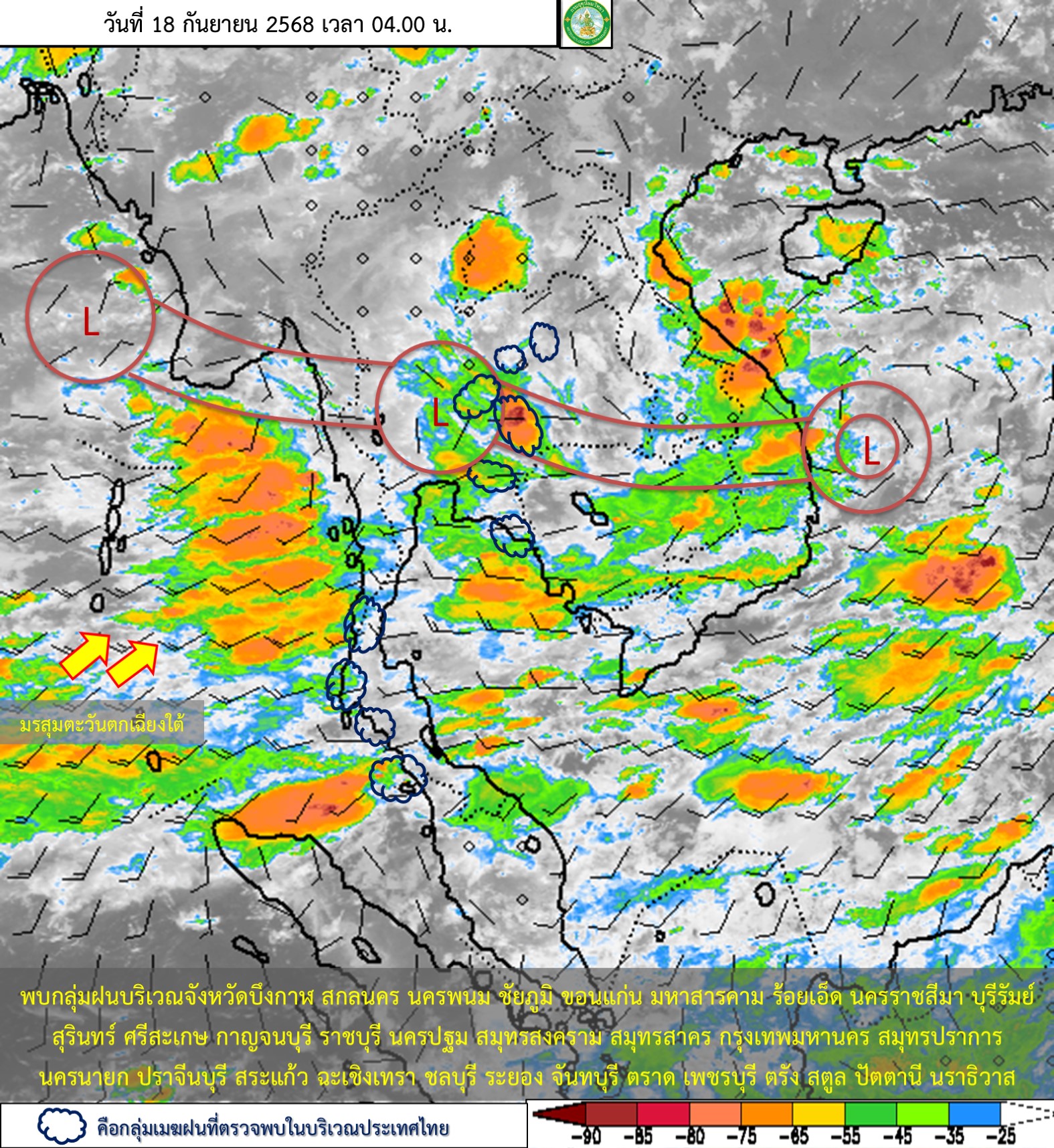 ลักษณะอากาศทั่วไป : พยากรณ์อากาศ 24 ชั่วโมงข้างหน้า ประเทศไทยมีฝนเพิ่มขึ้นและมีฝนตกหนักบางแห่ง และมีฝนตกหนักมากในภาคตะวันออก โดยเฉพาะบริเวณจังหวัดอำนาจเจริญ อุบลราชธานี จันทบุรี และตราด ขอให้ประชาชนบริเวณดังกล่าวระวังอันตรายจากฝนตกหนักถึงหนักมากและฝนที่ตกสะสม ซึ่งอาจทำให้เกิดน้ำท่วมฉับพลันและน้ำป่าไหลหลาก โดยเฉพาะพื้นที่ลาดเชิงเขาใกล้ทางน้ำไหลผ่านและพื้นที่ลุ่ม เนื่องจากร่องมรสุมพาดผ่านภาคกลาง ภาคตะวันออก และภาคตะวันออกเฉียงเหนือตอนล่าง เข้าสู่หย่อมความกดอากาศต่ำกำลังแรงบริเวณทะเลจีนใต้ ประกอบกับมรสุมตะวันตกเฉียงใต้ที่พัดปกคลุมทะเลอันดามัน ประเทศไทย และอ่าวไทยมีกำลังแรงขึ้น สำหรับบริเวณทะเลอันดามันตอนบนมีคลื่นสูงประมาณ 2 เมตร ส่วนทะเลอันดามันตอนล่างและอ่าวไทยตอนบนมีคลื่นสูง 1-2 เมตร บริเวณที่มีฝนฟ้าคะนองคลื่นสูงมากกว่า 2 เมตร ขอให้ชาวเรือเดินเรือด้วยความระมัดระวังและหลีกเลี่ยงการเดินเรือในบริเวณที่มีฝนฟ้าคะนอง อนึ่ง พายุดีเปรสชันบริเวณประเทศฟิลิปปินส์ได้เคลื่อนตัวลงสู่ทะเลจีนใต้ตอนบนแล้ว คาดว่าจะทวีกำลังแรงขึ้นเป็นพายุโซนร้อน และมีแนวโน้มจะเคลื่อนขึ้นฝั่งบริเวณประเทศจีนตอนใต้ ในช่วงวันที่ 19-20 กันยายน 2568 โดยพายุนี้ไม่เคลื่อนเข้าประเทศไทย