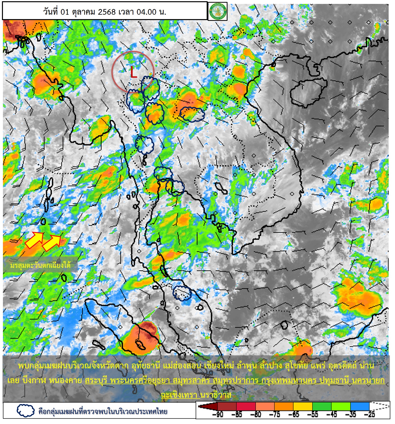 ลักษณะอากาศทั่วไป : พยากรณ์อากาศ 24 ชั่วโมงข้างหน้า ประเทศไทยยังคงมีฝนตกหนักบางแห่ง โดยเฉพาะบริเวณจังหวัดแม่ฮ่องสอน เชียงใหม่ เชียงราย ลำพูน ลำปาง พะเยา น่าน อุตรดิตถ์ สุโขทัย และตาก ขอให้ประชาชนในบริเวณดังกล่าวระวังอันตรายจากฝนตกหนักและฝนที่ตกสะสม ซึ่งอาจทำให้เกิดน้ำท่วมฉับพลัน น้ำป่าไหลหลาก และน้ำล้นตลิ่ง โดยเฉพาะพื้นที่ลาดเชิงเขาใกล้ทางน้ำไหลผ่าน พื้นที่ลุ่ม และพื้นที่น้ำท่วมขัง เนื่องจากมีลมตะวันออกและลมตะวันออกเฉียงใต้พัดปกคลุมภาคตะวันออกเฉียงเหนือ ในขณะที่มรสุมตะวันตกเฉียงใต้ที่พัดปกคลุมทะเลอันดามัน ประเทศไทย และอ่าวไทยมีกำลังอ่อนลง สำหรับคลื่นลมบริเวณทะเลอันดามันและอ่าวไทยมีกำลังปานกลาง โดยทะเลอันดามันตอนบนมีคลื่นสูงประมาณ 2 เมตร ส่วนทะเลอันดามันตอนล่างมีคลื่นสูง 1-2 เมตร บริเวณที่มีฝนฟ้าคะนองคลื่นสูงมากกว่า 2 เมตร ขอให้ชาวเรือเดินเรือด้วยความระมัดระวัง และหลีกเลี่ยงการเดินเรือในบริเวณที่มีฝนฟ้าคะนอง
