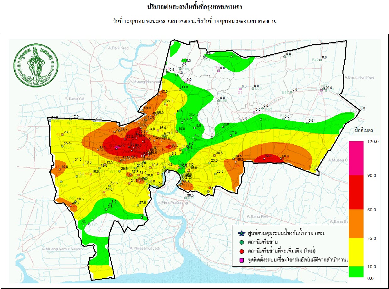 ในรอบ 24 ชั่วโมงที่ผ่านมา (07.00 น.) : พื้นที่กรุงเทพมหานครมีฝนปานกลางถึงหนัก ปริมาณฝนรวมสูงสุดที่จุดวัดคลองบางเชือกหนัง เขตภาษีเจริญ 92.5 มม. จุดวัดปากคลองตลาด เขตพระนคร 86.5 มม. จุดวัดสถานีสูบน้ำคลองมอญ เขตบางกอกน้อย 83.5 มม. จุดวัดสำนักงานเขตป้อมปราบศัตรูพ่าย 82.5 มม. จุดวัดสถานีสูบน้ำคลองบางกอกใหญ่ เขตบางกอกใหญ่ 79.5 มม.
