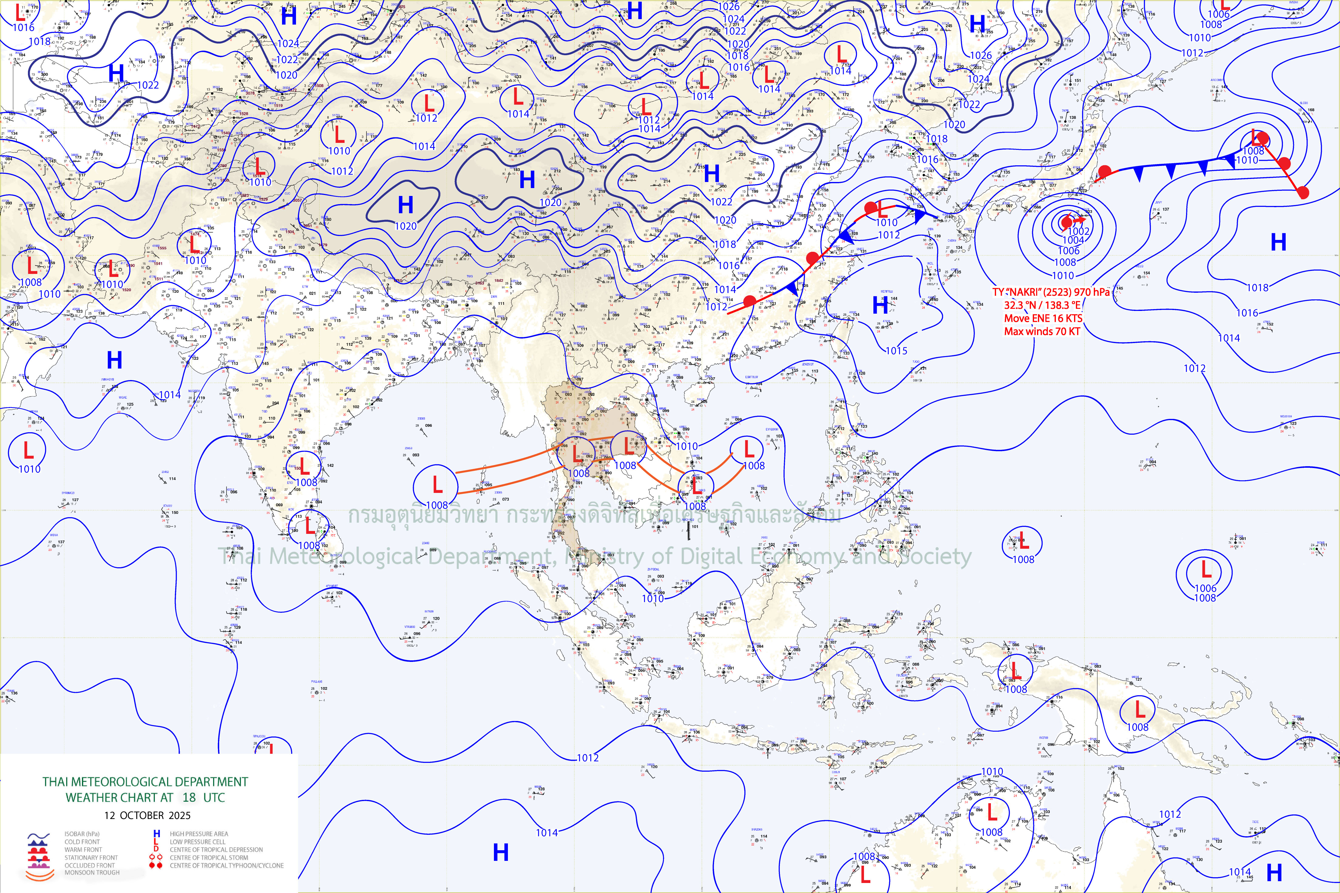 ลักษณะอากาศทั่วไป : พยากรณ์อากาศ 24 ชั่วโมงข้างหน้า ภาคตะวันออกเฉียงเหนือตอนล่าง ภาคกลางตอนล่าง รวมทั้งกรุงเทพมหานครและปริมณฑล ภาคตะวันออก และภาคใต้มีฝนตกหนักบางพื้นที่ เนื่องจากร่องมรสุมพาดผ่านภาคตะวันออกเฉียงเหนือตอนล่าง ภาคกลางตอนล่าง ภาคตะวันออก และภาคใต้ตอนบน ประกอบกับมรสุมตะวันตกเฉียงใต้ ยังคงพัดปกคลุมทะเลอันดามัน ภาคใต้ตอนล่าง และอ่าวไทย ขอให้ประชาชนในบริเวณดังกล่าวระวังอันตรายจากฝนตกหนักและฝนที่ตกสะสมไว้ด้วย สำหรับบริเวณทะเลอันดามันและอ่าวไทยมีคลื่นสูงประมาณ 1 เมตร บริเวณที่มีฝนฟ้าคะนองคลื่นสูงมากกว่า 2 เมตร ขอให้ชาวเรือเดินเรือด้วยความระมัดระวัง และหลีกเลี่ยงการเดินเรือในบริเวณที่มีฝนฟ้าคะนองไว้ด้วย