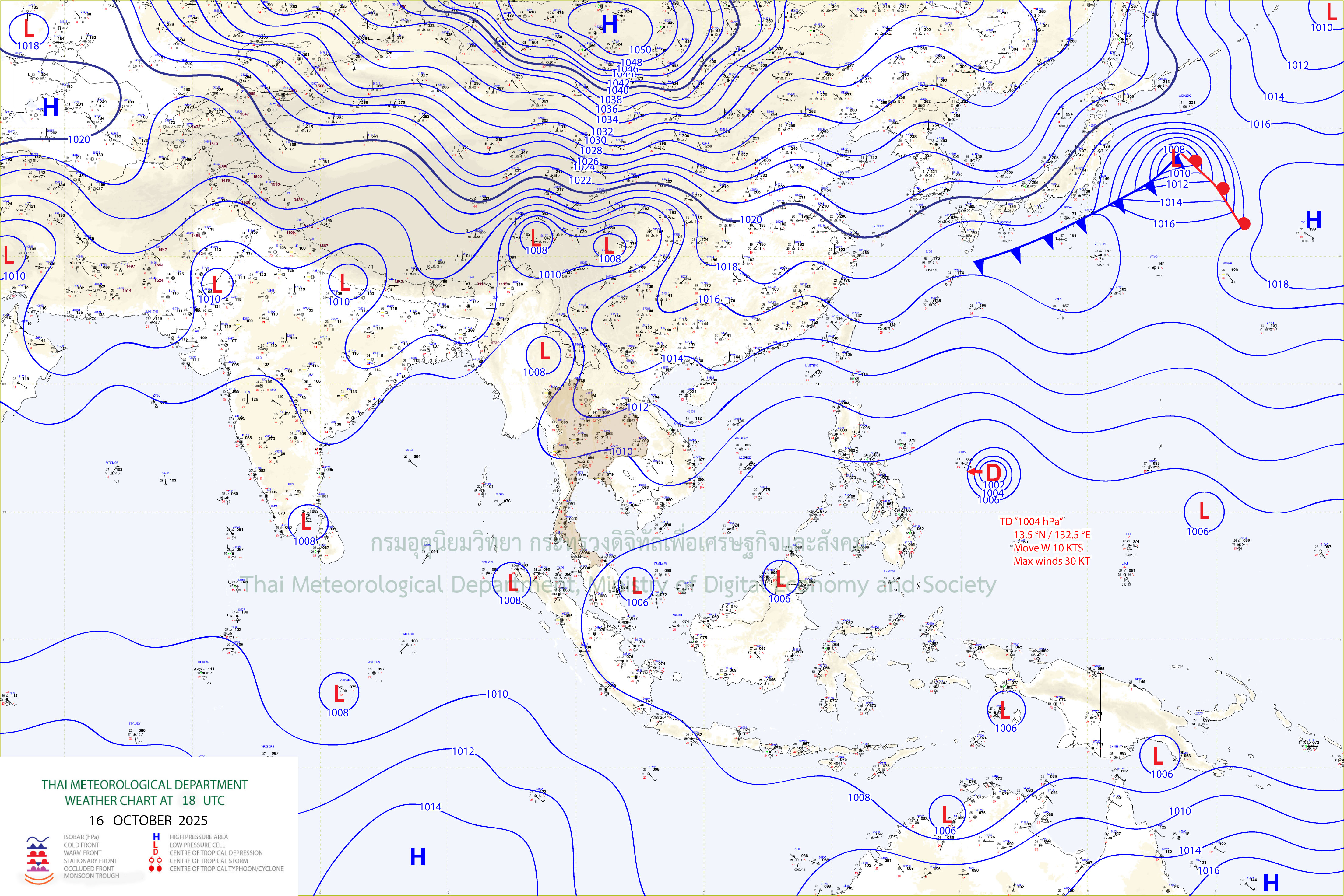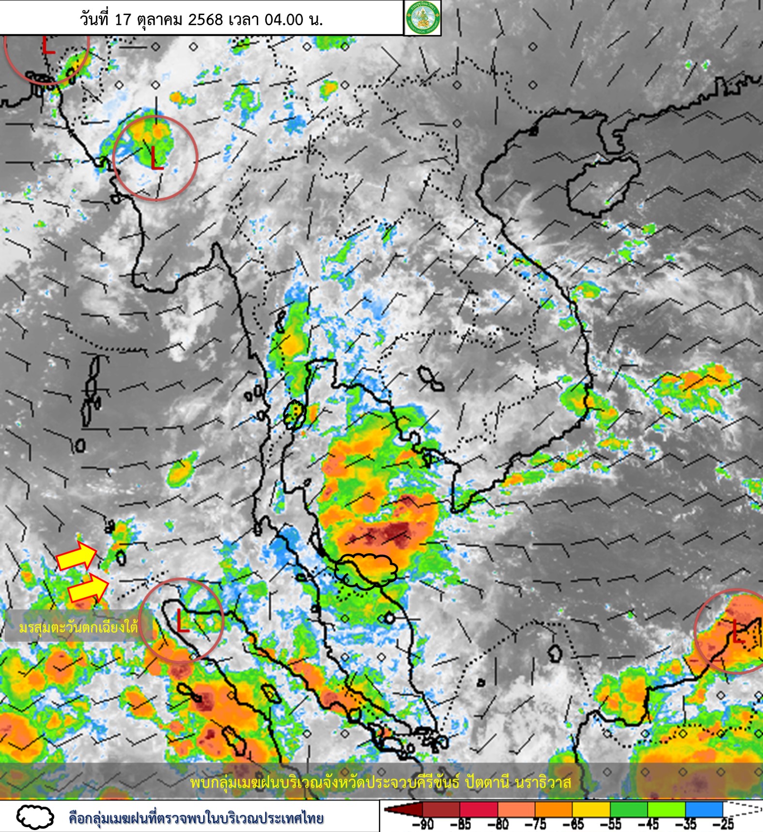 ลักษณะอากาศทั่วไป : พยากรณ์อากาศ 24 ชั่วโมงข้างหน้า ประเทศไทยตอนบนมียังคงมีฝนฟ้าคะนองเกิดขึ้นได้ สำหรับภาคใต้มีฝนฟ้าคะนองหลายพื้นที่ และฝนตกหนักบางแห่ง เนื่องจากลมตะวันออกและลมตะวันออกเฉียงใต้พัดปกคลุมประเทศไทย อ่าวไทย และทะเลอันดามัน ขอให้ประชาชนในบริเวณภาคใต้ระวังอันตรายจากฝนฟ้าคะนอง ฝนตกหนัก และฝนที่ตกสะสม รวมทั้งเพิ่มความระมัดระวังในการสัญจรผ่านบริเวณที่มีน้ำท่วมขังในระยะนี้ไว้ด้วย สำหรับบริเวณทะเลอันดามันและอ่าวไทยมีคลื่นสูงประมาณ 1 เมตร บริเวณที่มีฝนฟ้าคะนองคลื่นสูงมากกว่า 2 เมตร ขอให้ชาวเรือเดินเรือด้วยความระมัดระวัง และหลีกเลี่ยงการเดินเรือในบริเวณที่มีฝนฟ้าคะนองไว้ด้วย อนึ่ง พายุดีเปรสชัน บริเวณมหาสมุทรแปซิฟิก ด้านตะวันออกของประเทศฟิลิปปินส์ มีแนวโน้มจะทวีกำลังแรงขึ้น คาดว่า จะเคลื่อนลงทะเลจีนใต้ในช่วงวันที่ 18 – 19 ตุลาคม 2568