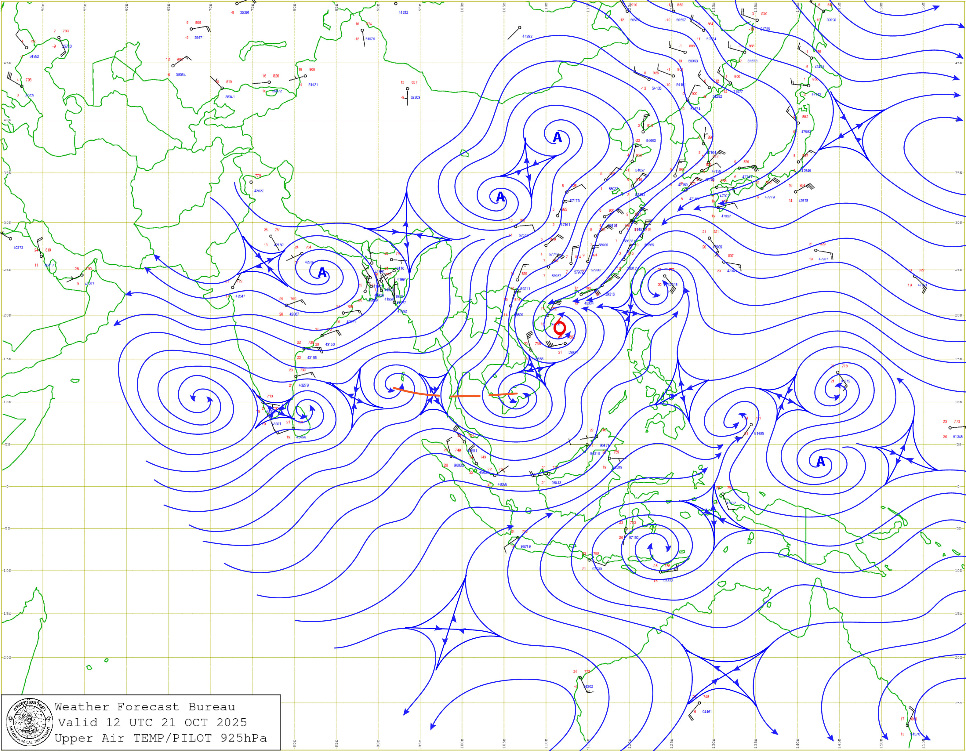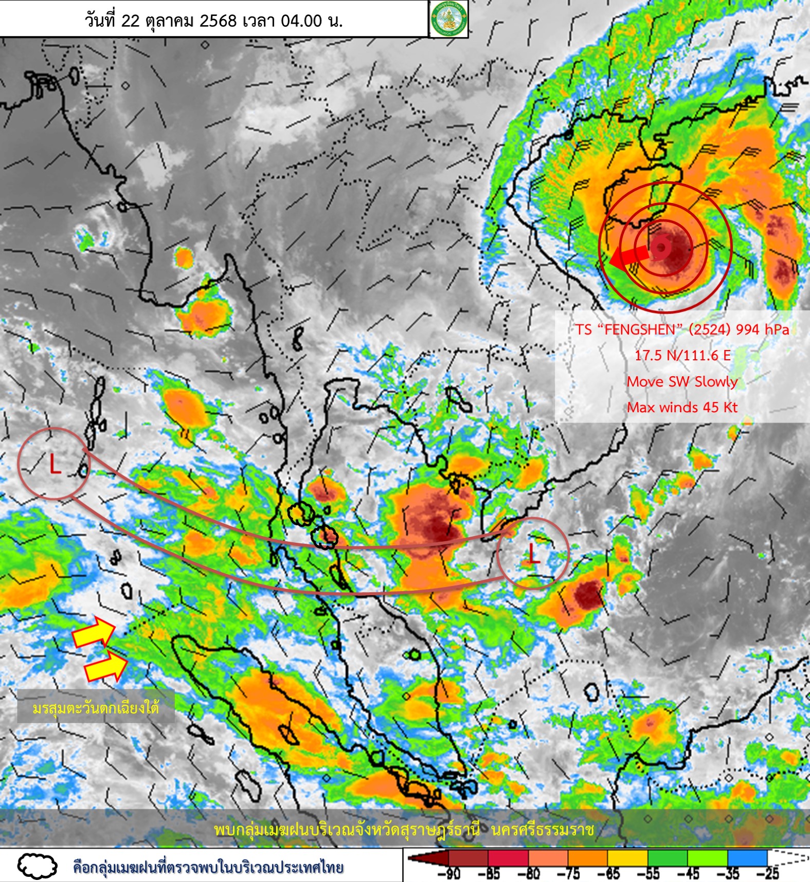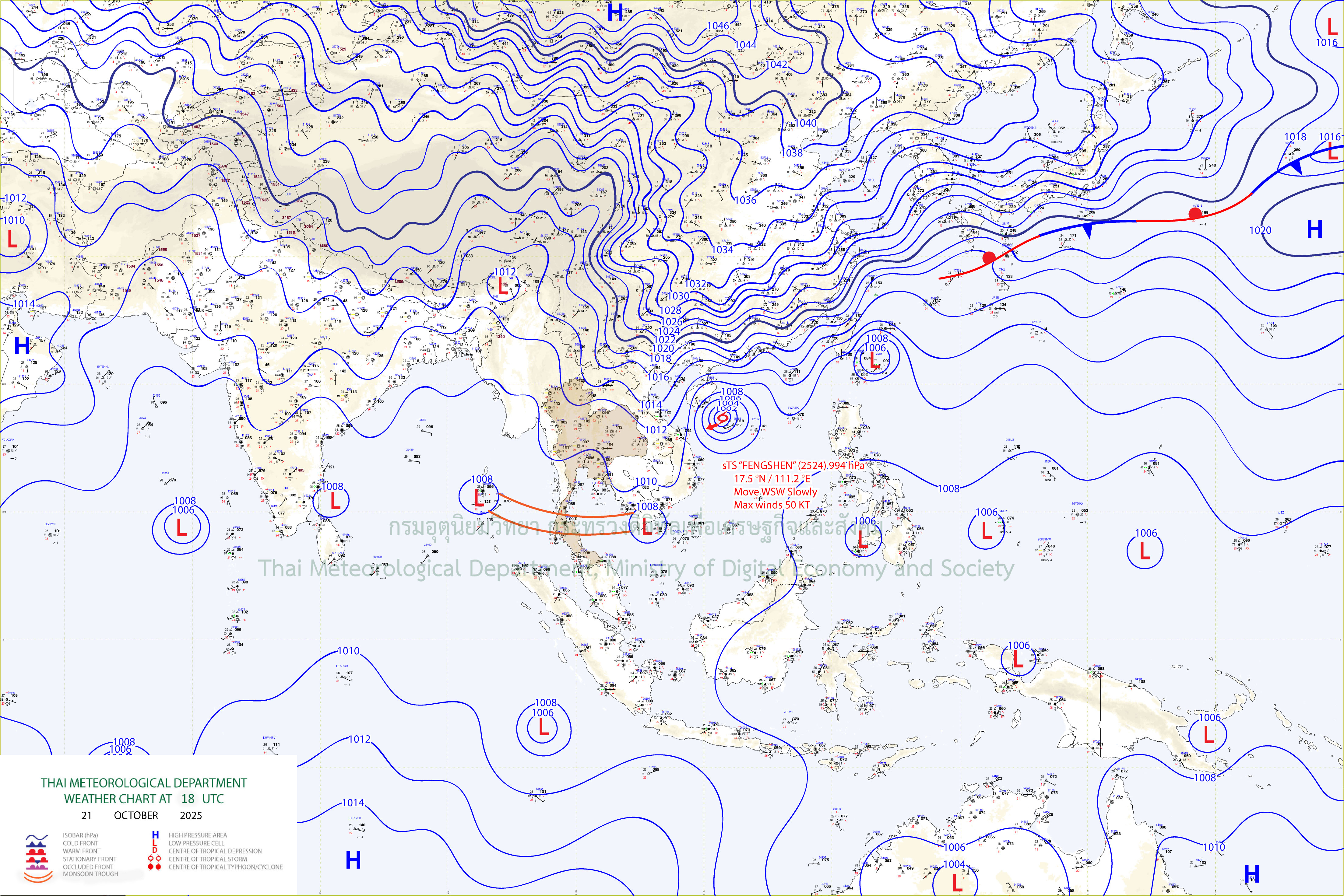 อนึ่ง พายุโซนร้อน “เฟิงเฉิน” บริเวณทะเลจีนใต้ตอนบน ได้ทวีกำลังแรงขึ้นเป็นพายุโซนร้อนกำลังแรงแล้ว คาดว่าจะเคลื่อนขึ้นฝั่งบริเวณประเทศเวียดนามตอนกลางในช่วงวันที่ 22-23 ต.ค. 68 หลังจากนั้นจะอ่อนกำลังลงอย่างรวดเร็วตามลำดับ เนื่องจากมีมวลอากาศเย็นจากประเทศจีนแผ่ลงมาปกคลุมประเทศเวียดนามตอนบนและทะเลจีนใต้ตอนบน ในช่วงวันดังกล่าว โดยพายุนี้ไม่เคลื่อนเข้าสู่ประเทศไทย