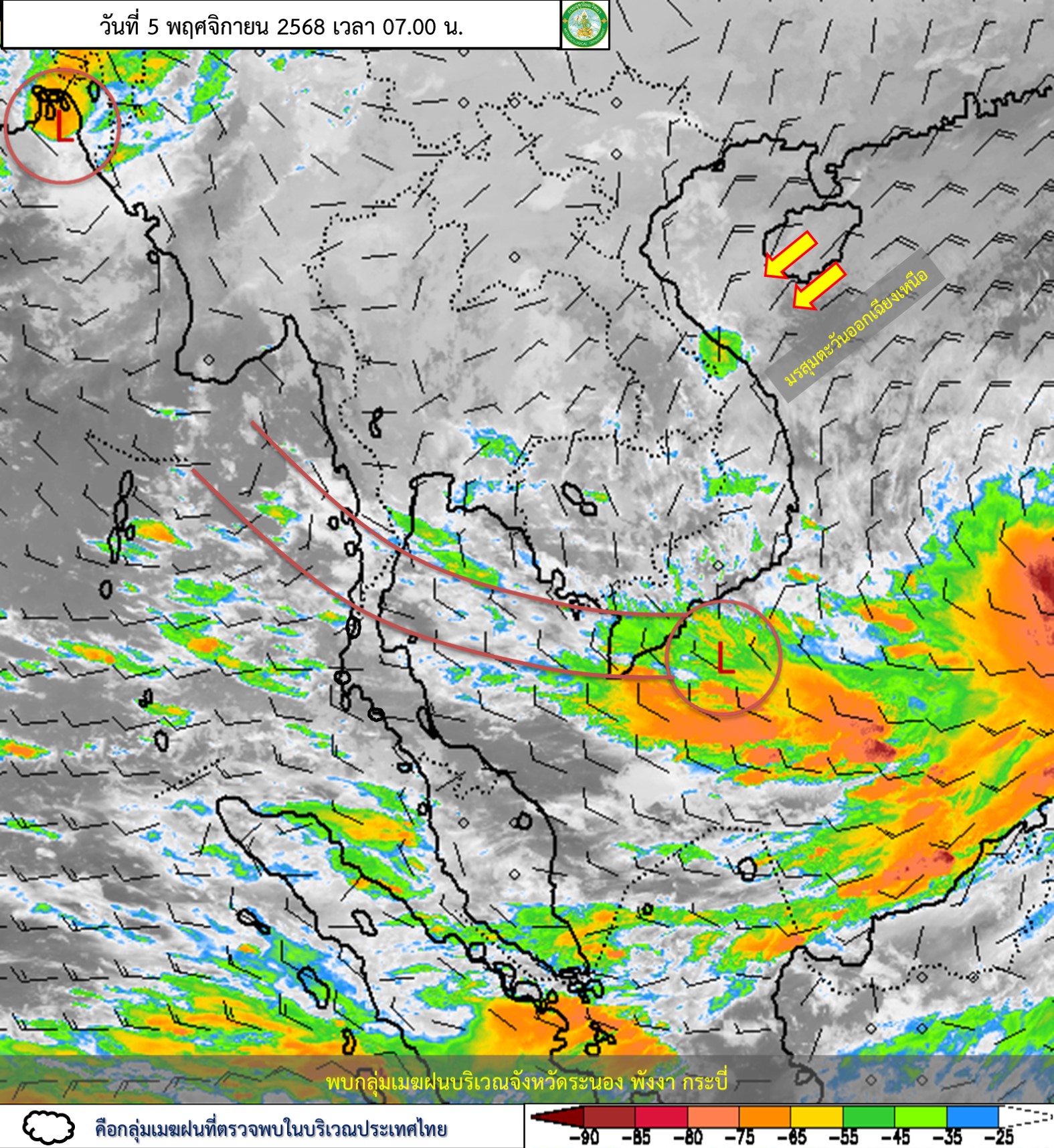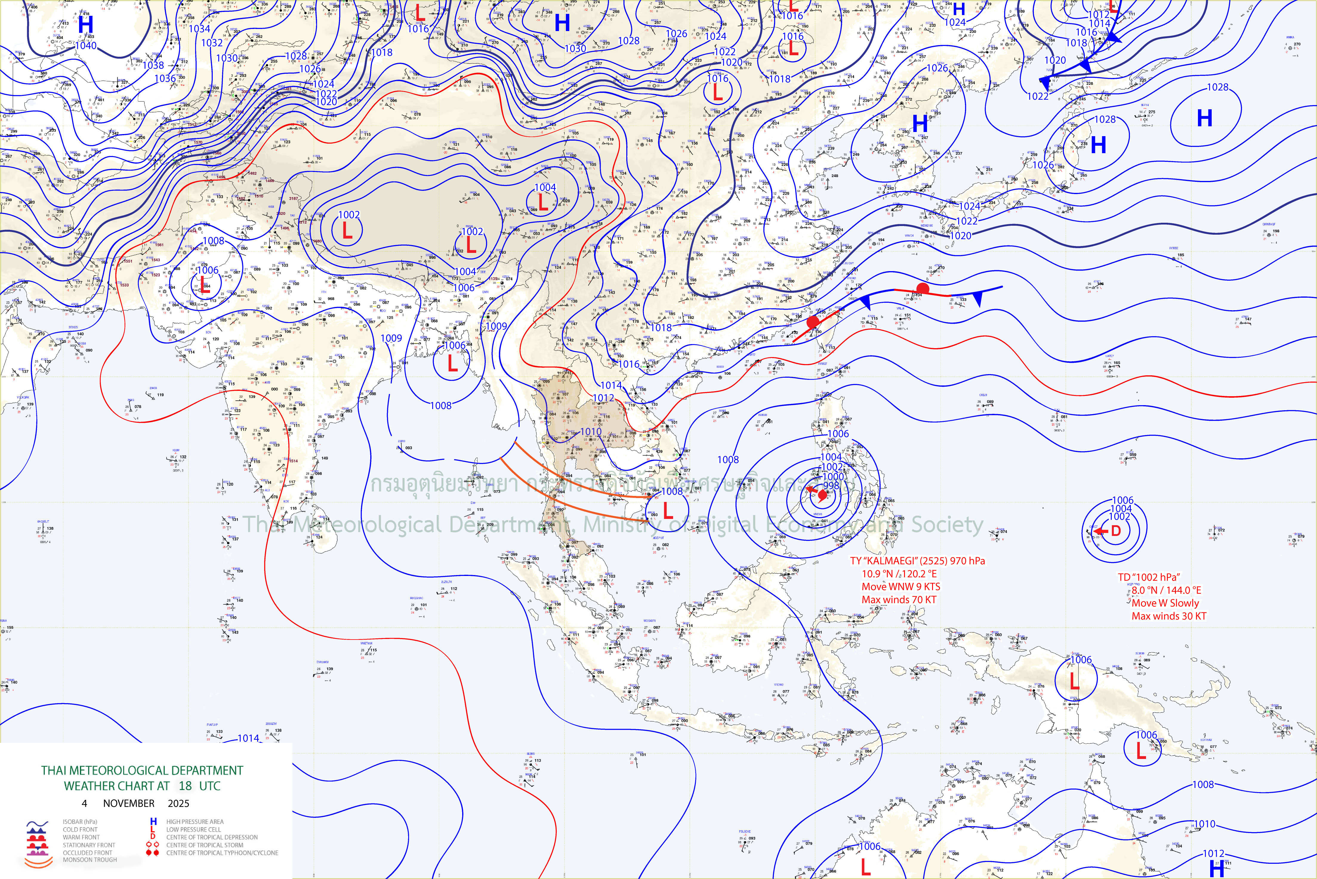 อนึ่ง พายุไต้ฝุ่น “คัลแมกี” (KALMAEGI) บริเวณทะเลจีนใต้ตอนกลาง คาดว่าจะเคลื่อนขึ้นฝั่งประเทศเวียดนามตอนกลางในช่วงวันที่ 6–7 พ.ย. 68 จากนั้นมีแนวโน้มจะอ่อนกำลังลงเป็นพายุโซนร้อน และพายุดีเปรสชันตามลำดับ