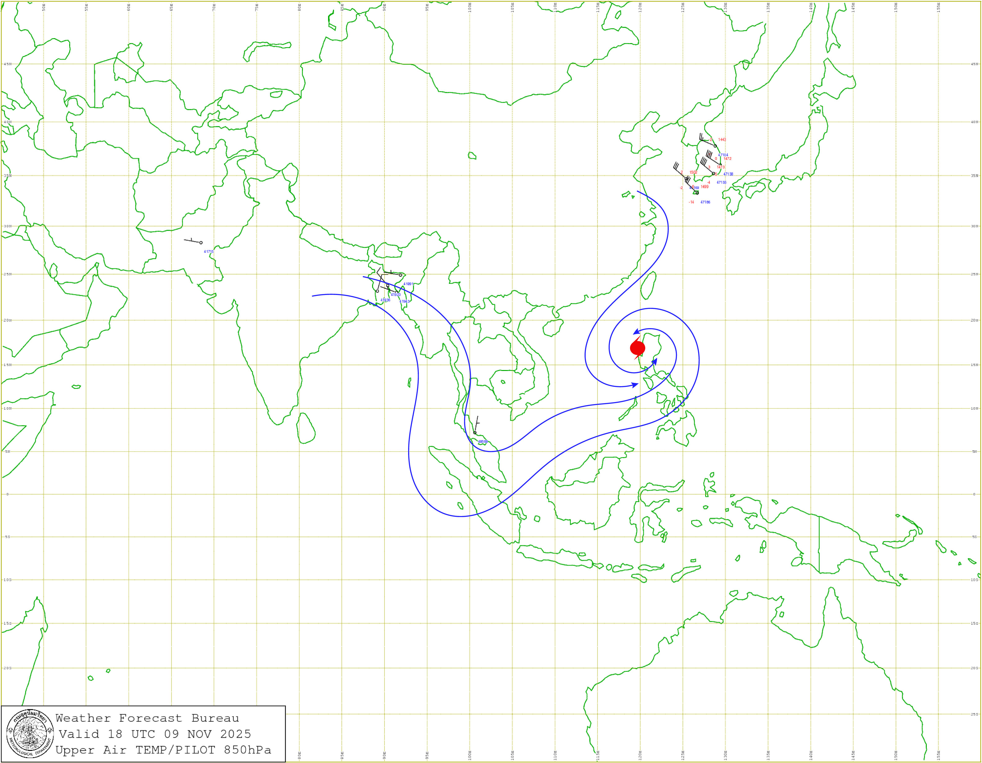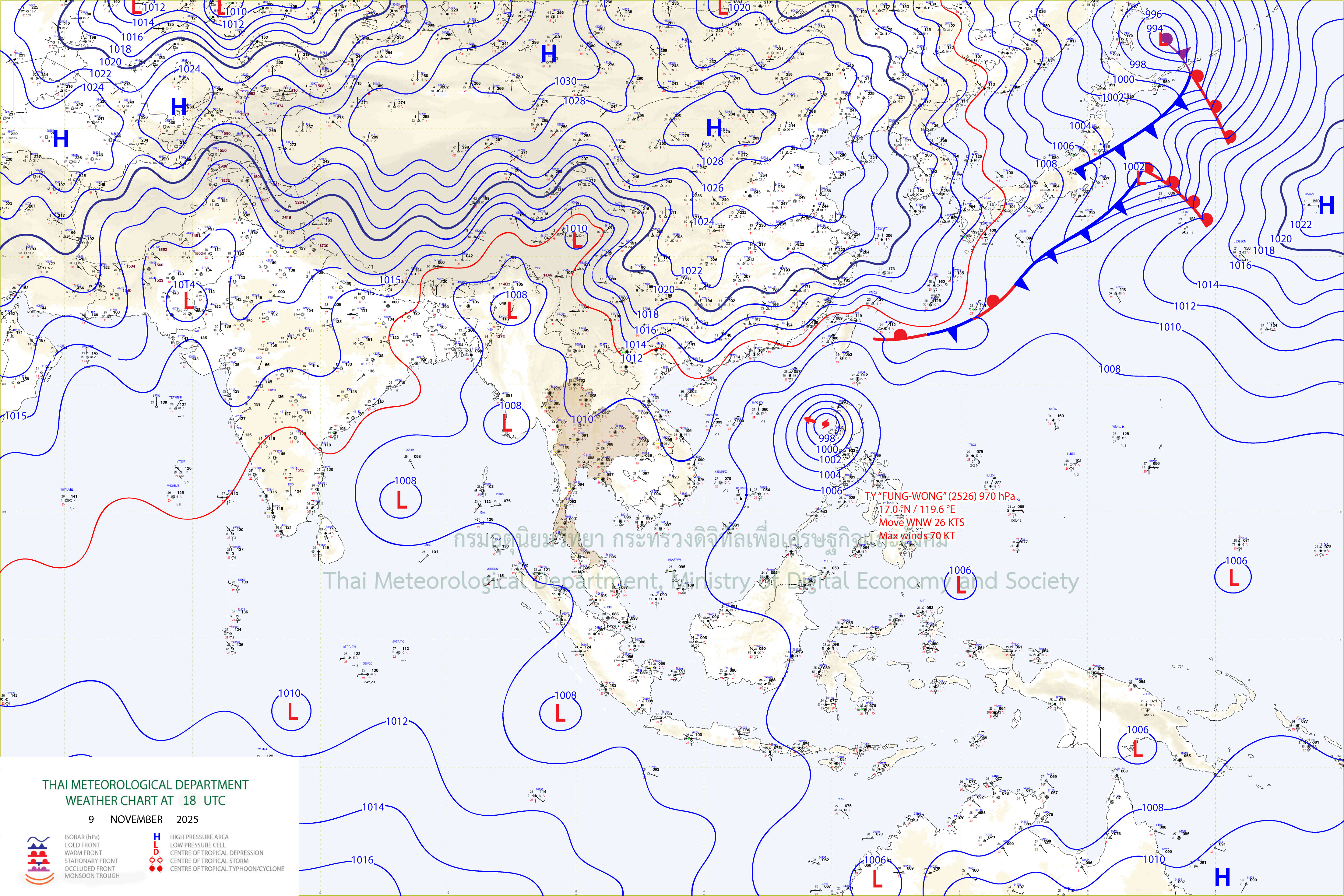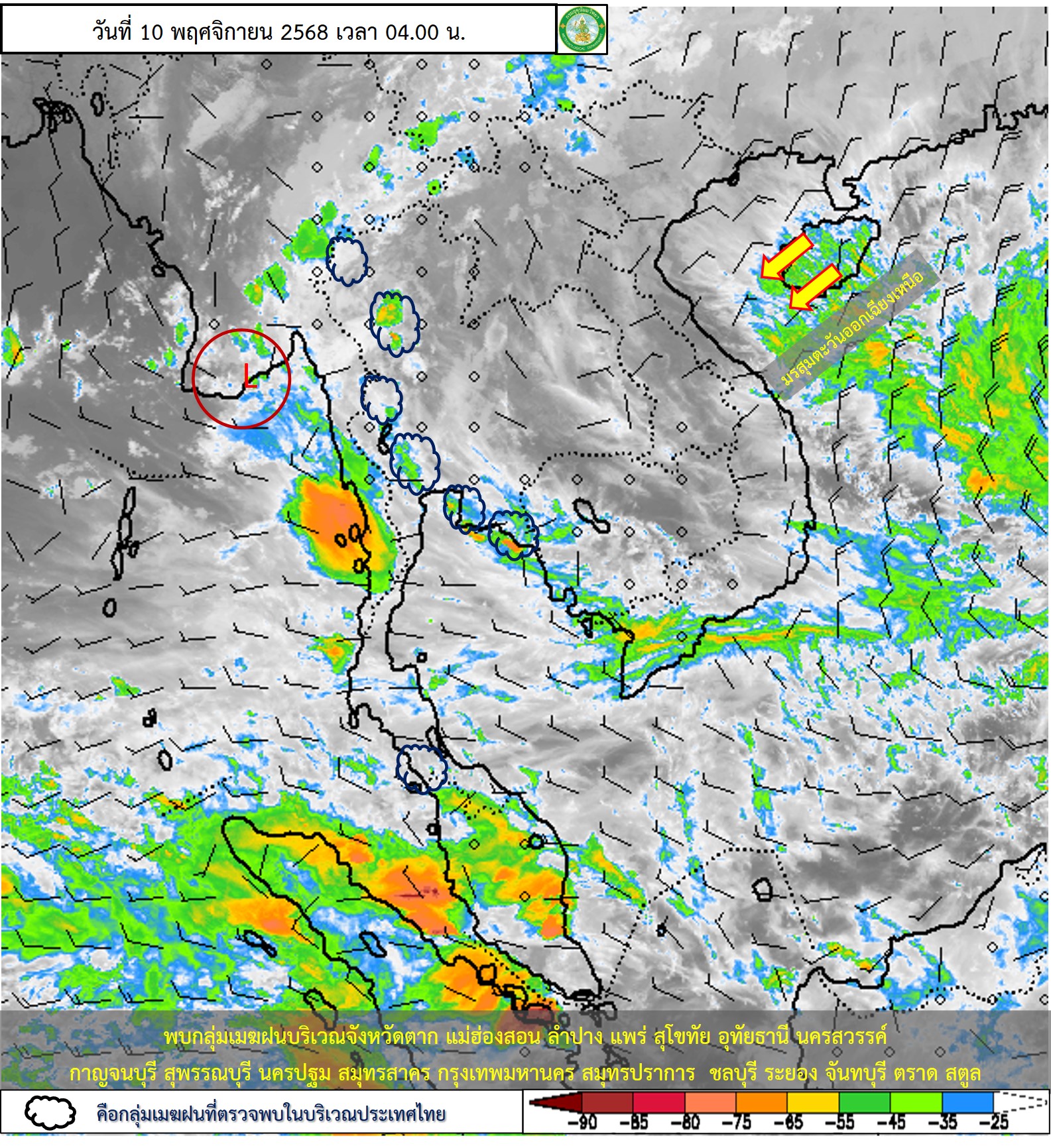 ลักษณะอากาศทั่วไป : พยากรณ์อากาศ 24 ชั่วโมงข้างหน้า ประเทศไทยตอนบนมีฝนลดลง แต่ยังคงมีฝนฟ้าคะนองบางแห่ง เนื่องจากหย่อมความกดอากาศต่ำปกคลุมด้านตะวันตกของภาคเหนือและประเทศเมียนมา ขอให้ประชาชนในบริเวณดังกล่าวระวังอันตรายจากฝนฟ้าคะนอง ส่วนเกษตรกรควรป้องกันและระวังความเสียหายที่จะเกิดต่อผลผลิตทางการเกษตร สำหรับภาคใต้ยังคงมีฝนฟ้าคะนองเกิดขึ้นได้ เนื่องจากมีลมตะวันตกเฉียงใต้พัดปกคลุมทะเลอันดามันภาคใต้ และอ่าวไทย ส่วนคลื่นลมบริเวณทะเลอันดามันมีกำลังปานกลาง โดยมีคลื่นสูง 1-2 เมตร บริเวณที่มีฝนฟ้าคะนองคลื่นสูงมากกว่า 2 เมตร อ่าวไทยมีคลื่นสูงประมาณ 1 เมตร บริเวณที่มีฝนฟ้าคะนองคลื่นสูงมากกว่า 2 เมตร ขอให้ชาวเรือเดินเรือด้วยความระมัดระวัง หลีกเลี่ยงการเดินเรือในบริเวณที่มีฝนฟ้าคะนอง อนึ่ง พายุไต้ฝุ่น “ฟงวอง”(Fung-wong) บริเวณประเทศฟิลิปปินส์ มีแนวโน้มจะเคลื่อนขึ้นไปทางทะเลจีนใต้ตอนบนและช่องแคบไต้หวัน ในช่วงวันที่ 12-13 พ.ย. 68 โดยพายุนี้ไม่เคลื่อนเข้าประเทศไทย ขอให้ผู้ที่จะเดินทางไปบริเวณดังกล่าวตรวจสอบสภาพอากาศก่อนออกเดินทางในช่วงวันดังกล่าวไว้ด้วย