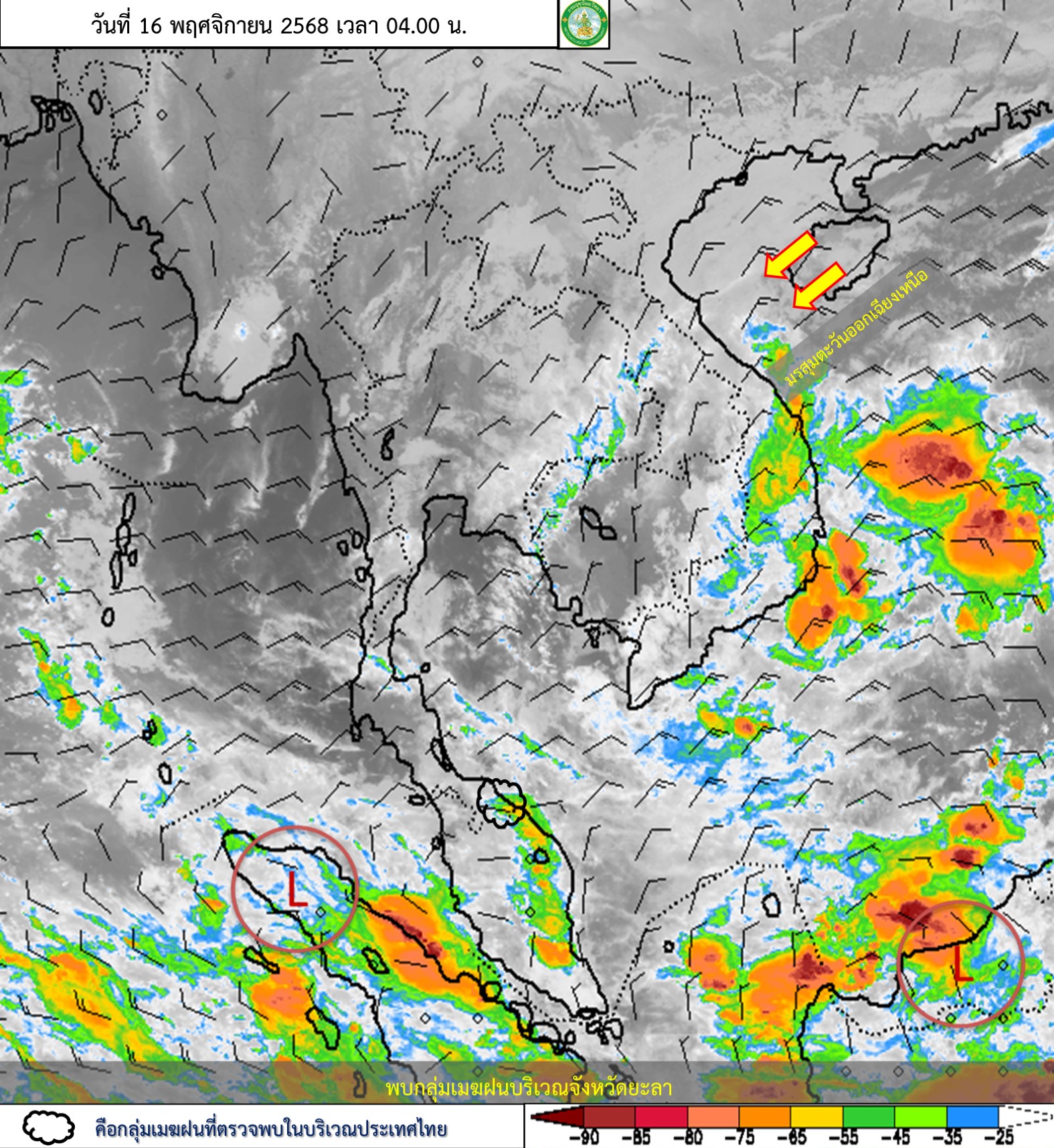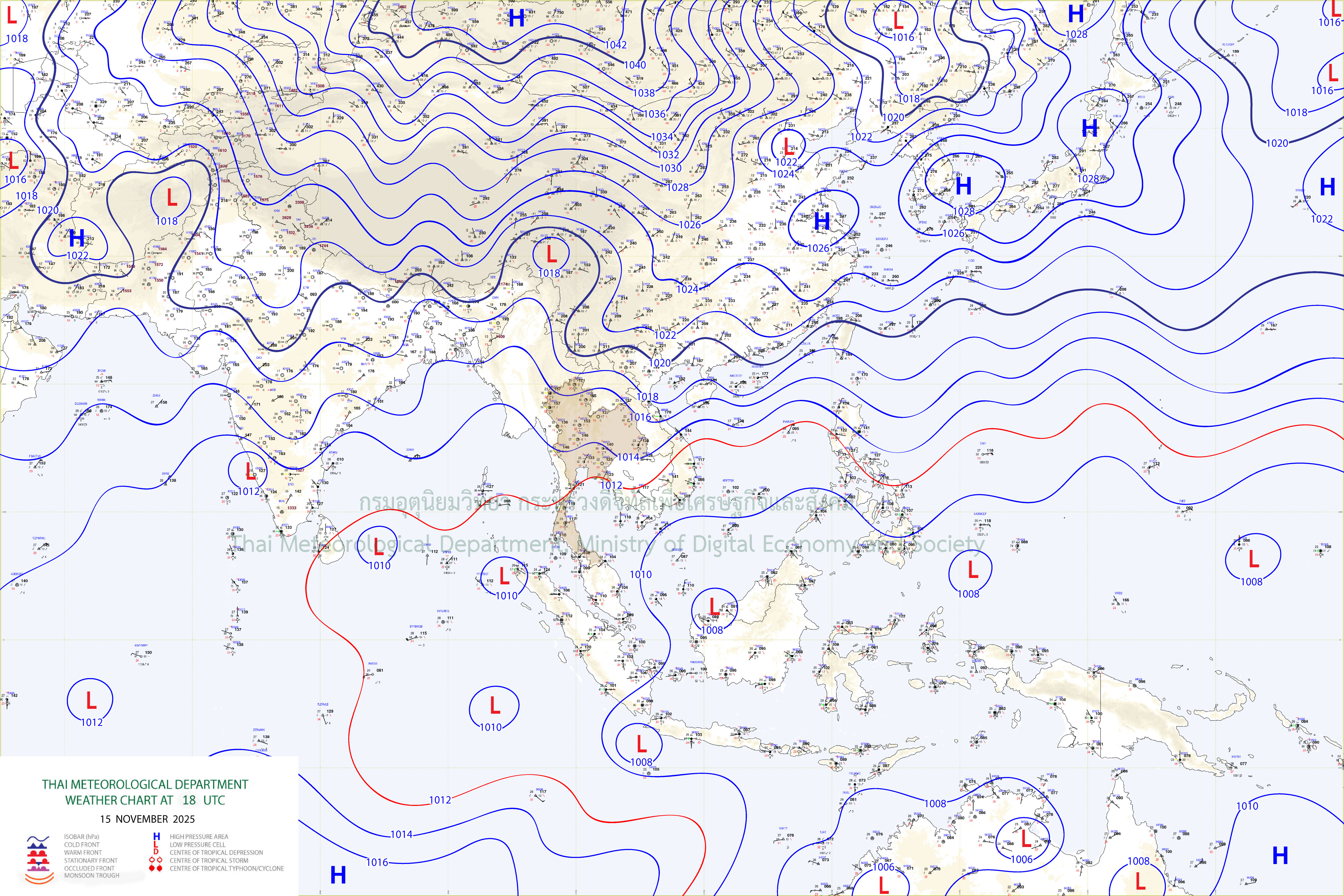 อนึ่ง ในช่วงวันที่ 17 - 23 พ.ย. 68 ประเทศไทยตอนบนจะมีอากาศแปรปรวน โดยจะมีฝนฟ้าคะนองบางพื้นที่เกิดขึ้นในระยะแรก โดยเริ่มในภาคตะวันออกเฉียงเหนือ ส่วนภาคอื่นๆ จะได้รับผลกระทบในระยะถัดไป หลังจากนั้นอุณหภูมิจะลดลง และมีอากาศเย็นถึงหนาว กับมีลมแรง ทั้งนี้เนื่องจากบริเวณความกดอากาศสูงหรือมวลอากาศเย็นกำลังแรงจากประเทศจีนจะแผ่ลงมาปกคลุมประเทศไทยตอนบนและทะเลจีนใต้ สำหรับภาคใต้มีฝนเพิ่มขึ้น และมีฝนตกหนักถึงหนักมากบางพื้นที่ เนื่องจากมรสุมตะวันออกเฉียงเหนือที่พัดปกคลุมอ่าวไทยและภาคใต้จะมีกำลังแรงขึ้น ประกอบกับจะมีคลื่นกระแสลมฝ่ายตะวันออกเคลื่อนเข้าปกคลุมภาคใต้ ส่วนคลื่นลมบริเวณอ่าวไทยและทะเลอันดามันจะมีกำลังค่อนข้างแรง โดยอ่าวไทยมีคลื่นสูงประมาณ 2-3 เมตร ส่วนทะเลอันดามันตอนบนมีคลื่นสูงประมาณ 2 เมตร ห่างฝั่งคลื่นสูง 2- 3 เมตร บริเวณที่มีฝนฟ้าคะนองคลื่นสูงมากกว่า 3 เมตร ขอให้ประชาชนบริเวณภาคใต้ฝั่งตะวันออกระวังอันตรายจากฝนตกหนักถึงหนักมาก และฝนที่ตกสะสม ซึ่งอาจทำให้เกิดน้ำท่วมฉับพลันและน้ำป่าไหลหลาก โดยเฉพาะพื้นที่ลาดเชิงเขาใกล้ทางน้ำไหลผ่านและพื้นที่ลุ่มไว้ด้วย รวมทั้งระวังอันตรายจากคลื่นที่ซัดเข้าหาฝั่ง ส่วนชาวเรือบริเวณอ่าวไทยและทะเลอันดามันควรเดินเรือด้วยความระมัดระวัง และหลีกเลี่ยงการเดินเรือในบริเวณที่มีฝนฟ้าคะนอง สำหรับเรือเล็กบริเวณอ่าวไทยควรงดออกจากฝั่งในช่วงวันที่ 19 - 23 พ.ย. 68