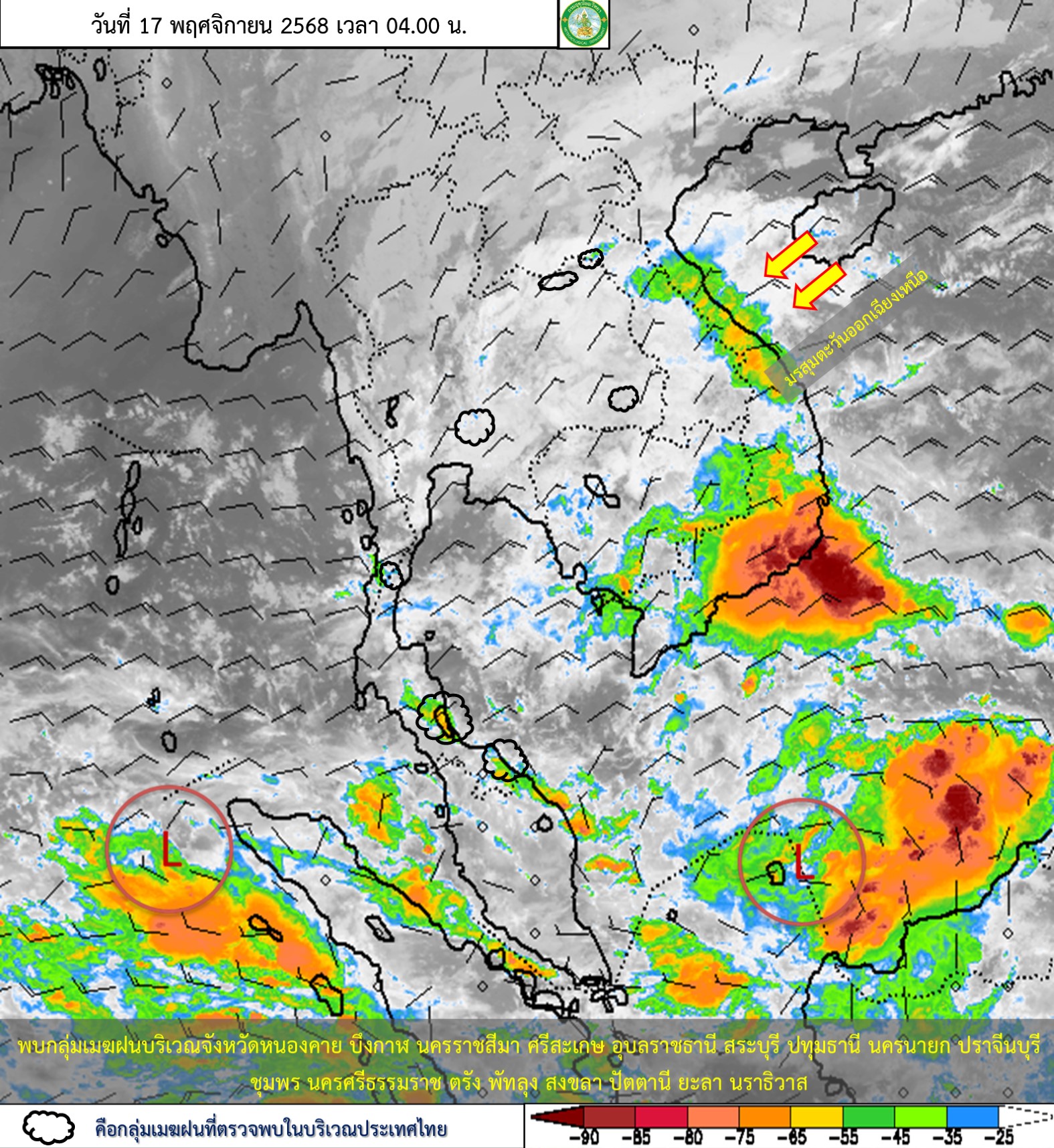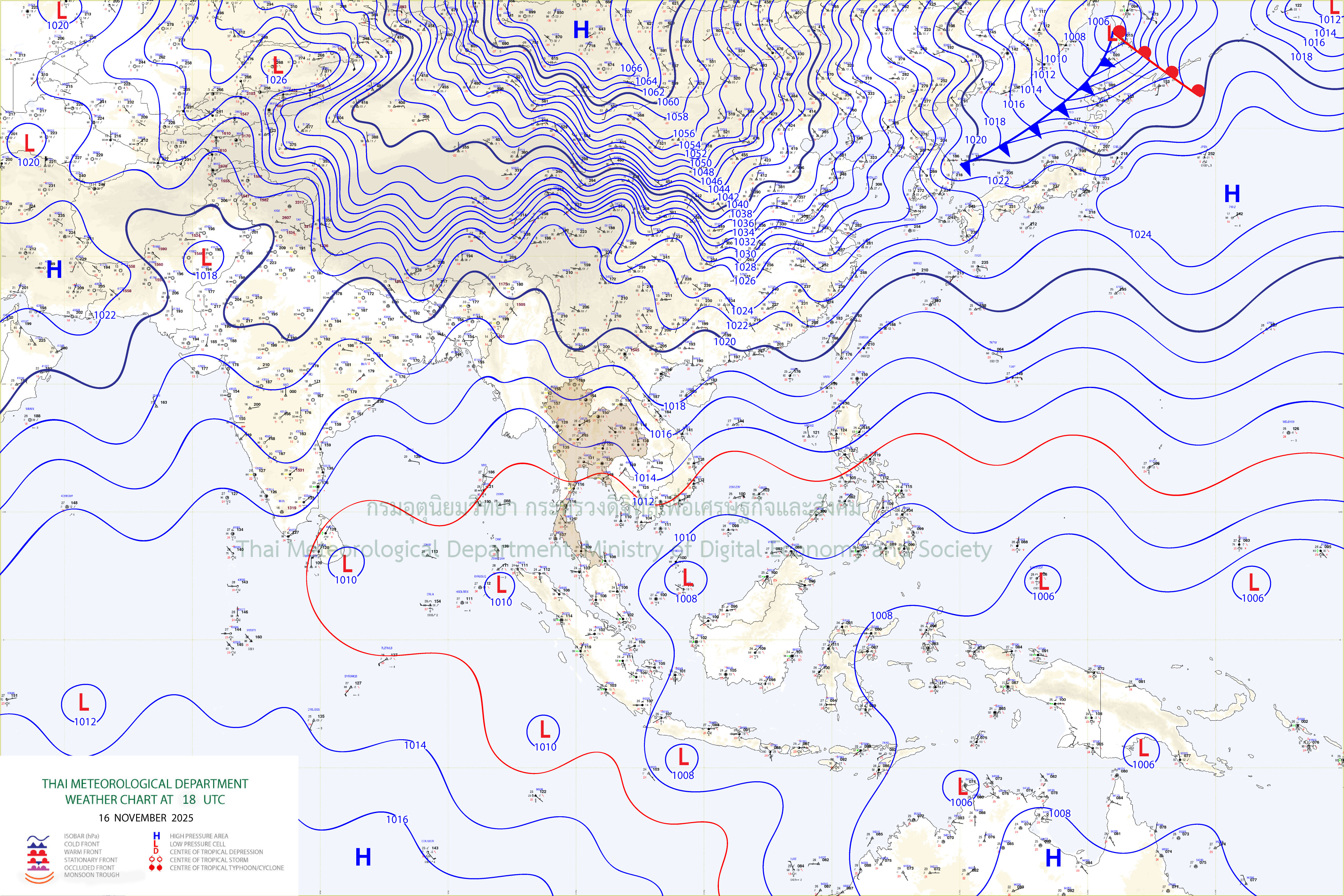 ลักษณะอากาศทั่วไป : พยากรณ์อากาศ 24 ชั่วโมงข้างหน้า บริเวณความกดอากาศสูงหรือมวลอากาศเย็นกำลังแรงปกคลุมประเทศจีนตอนกลาง คาดว่าจะแผ่ปกคลุมประเทศจีนตอนใต้และเวียดนามตอนบนในวันนี้ และจะเริ่มแผ่ปกคลุมประเทศไทยตอนบนในวันพรุ่งนี้ (18 พ.ย. 68) ส่งผลให้ประเทศไทยตอนบนมีสภาพอากาศแปรปรวน โดยมีฝนฟ้าคะนองและลมกระโชกแรงเกิดขึ้นในระยะแรก ขอให้ประชาชนในบริเวณประเทศไทยตอนบนดูแลรักษาสุขภาพ เนื่องจากสภาพอากาศที่เปลี่ยนแปลงในระยะนี้ไว้ด้วย สำหรับภาคใต้ยังคงมีฝนฟ้าคะนองบางแห่ง ส่วนคลื่นลมบริเวณอ่าวไทยมีกำลังแรงขึ้น โดยมีคลื่นสูงประมาณ 2 เมตร บริเวณที่มีฝนฟ้าคะนองคลื่นสูงมากกว่า 2 เมตร เนื่องจากมรสุมตะวันออกเฉียงเหนือพัดปกคลุมอ่าวไทย ภาคใต้ และทะเลอันดามัน ขอให้ชาวเรือบริเวณอ่าวไทยและทะเลอันดามันเดินเรือด้วยความระมัดระวัง และหลีกเลี่ยงการเดินเรือในบริเวณที่มีฝนฟ้าคะนอง