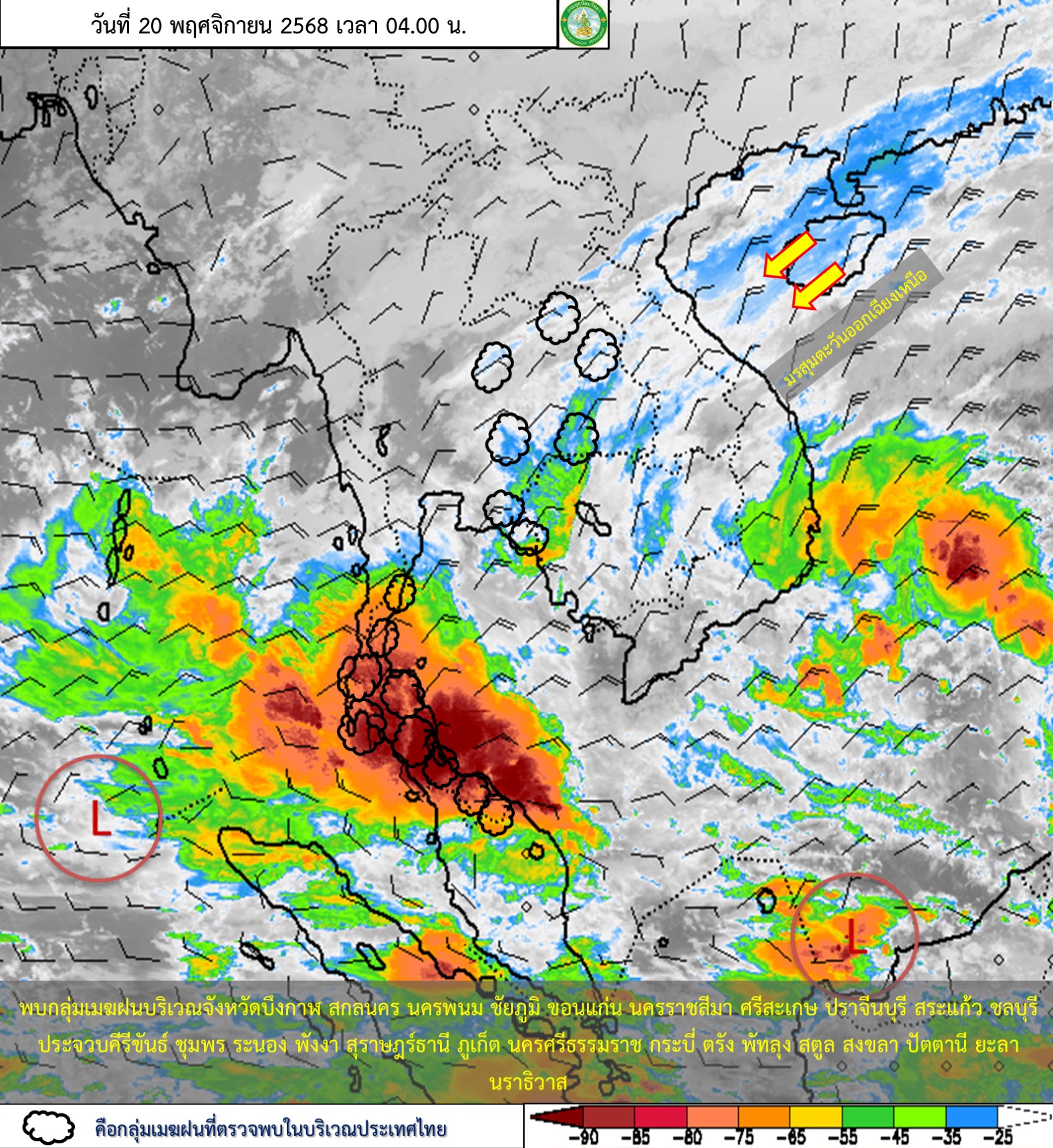 ลักษณะอากาศทั่วไป : พยากรณ์อากาศ 24 ชั่วโมงข้างหน้า ภาคเหนือและภาคตะวันออกเฉียงเหนือ มีอากาศเย็นถึงหนาว อุณหภูมิจะลดลง 1-2 องศาเซลเซียส ส่วนภาคกลาง รวมทั้งกรุงเทพมหานครและปริมณฑล และภาคตะวันออก มีอากาศเย็น ขอให้ประชาชนในบริเวณดังกล่าวดูแลรักษาสุขภาพ เนื่องจากสภาพอากาศที่หนาวเย็นลงกับมีลมแรง สำหรับเกษตรกรควรป้องกันและระวังความเสียหายที่จะเกิดต่อผลผลิตทางการเกษตรไว้ด้วย ส่วนประชาชนบริเวณภาคตะวันออกเฉียงเหนือระวังอันตรายจากอัคคีภัยเนื่องจากสภาพอากาศที่แห้งและมีลมแรง ทั้งนี้เนื่องจากบริเวณความกดอากาศสูงหรือมวลอากาศเย็นกำลังแรงจากประเทศจีนได้แผ่ลงมาปกคลุมถึงภาคใต้ตอนบนแล้ว สำหรับภาคใต้มีฝนตกหนักหลายพื้นที่และมีฝนตกหนักมากบางแห่ง เนื่องจากมรสุมตะวันออกเฉียงเหนือที่พัดปกคลุมอ่าวไทย ภาคใต้ และทะเลอันดามันตอนบนมีกำลังค่อนข้างแรง ประกอบกับมีหย่อมความกดอากาศต่ำบริเวณอ่าวไทยและภาคใต้ตอนล่าง ขอให้ประชาชนในภาคใต้ระวังอันตรายจากฝนตกหนักถึงหนักมากและฝนที่ตกสะสม ซึ่งอาจทำให้เกิดน้ำท่วมฉับพลันและน้ำป่าไหลหลาก โดยเฉพาะพื้นที่ลาดเชิงเขาใกล้ทางน้ำไหลผ่านและพื้นที่ลุ่มไว้ด้วย ส่วนคลื่นลมบริเวณอ่าวไทยมีกำลังค่อนข้างแรง โดยมีคลื่นสูง 2-3 เมตร ห่างฝั่งของทะเลอันดามันตอนบนมีคลื่นสูง 2-3 เมตร บริเวณที่มีฝนฟ้าคะนองคลื่นสูงมากกว่า 3 เมตร ขอให้ชาวเรือบริเวณอ่าวไทยและทะเลอันดามันเดินเรือด้วยความระมัดระวังและหลีกเลี่ยงการเดินเรือในบริเวณที่มีฝนฟ้าคะนอง สำหรับเรือเล็กบริเวณอ่าวไทยควรงดออกจากฝั่ง