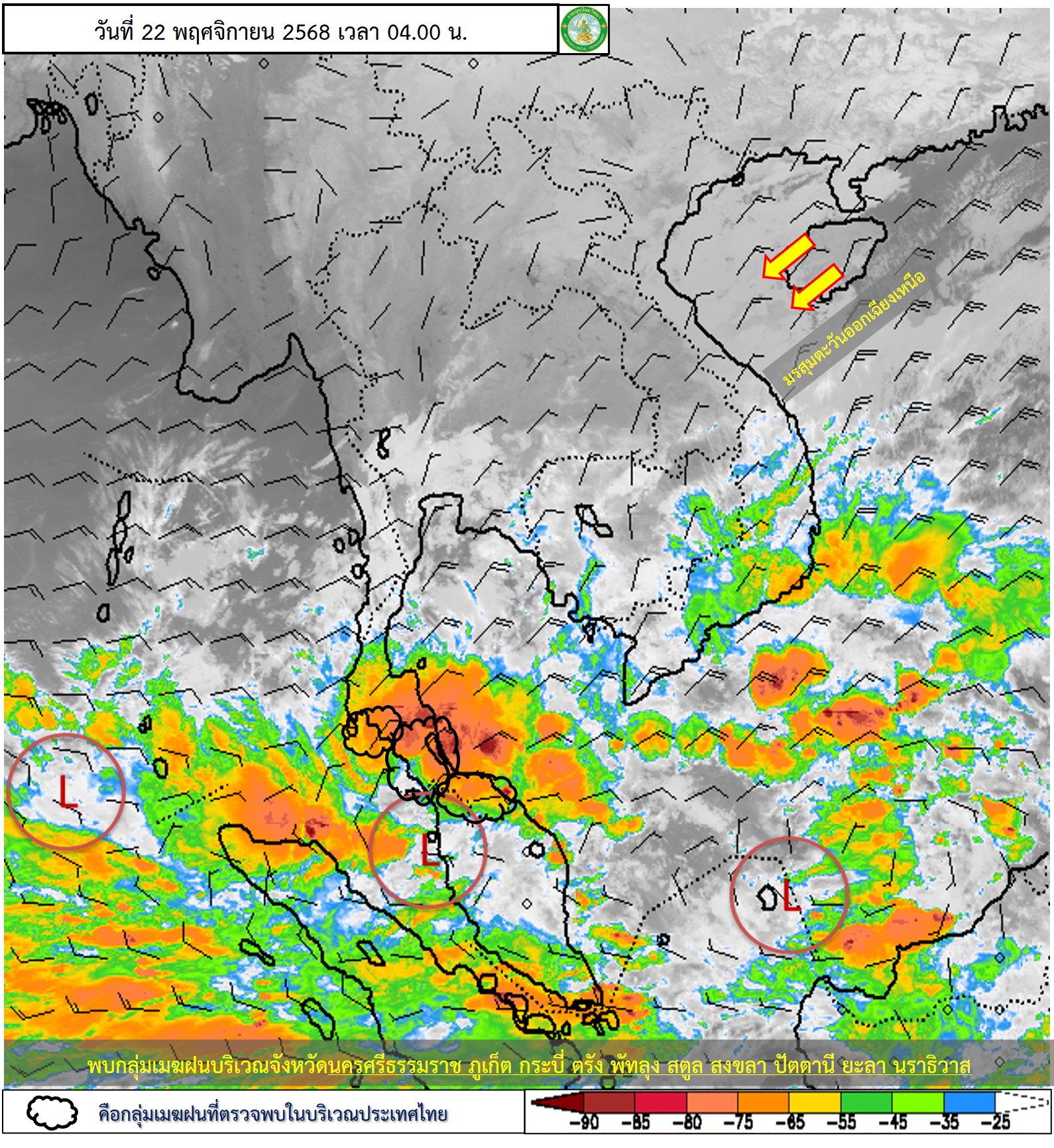 สำหรับภาคใต้ตั้งแต่จังหวัดนครศรีธรรมราชลงไป มีฝนตกหนักหลายพื้นที่และมีฝนตกหนักมากบางแห่ง เนื่องจากมรสุมตะวันออกเฉียงเหนือที่พัดปกคลุมอ่าวไทย ภาคใต้ และทะเลอันดามันตอนบนมีกำลังค่อนข้างแรง ประกอบกับมีหย่อมความกดอากาศต่ำบริเวณภาคใต้ตอนล่าง ขอให้ประชาชนในภาคใต้ระวังอันตรายจากฝนตกหนักถึงหนักมากและฝนที่ตกสะสม ซึ่งอาจทำให้เกิดน้ำท่วมฉับพลันและน้ำป่าไหลหลาก โดยเฉพาะพื้นที่ลาดเชิงเขาใกล้ทางน้ำไหลผ่านและพื้นที่ลุ่มไว้ด้วย ส่วนคลื่นลมบริเวณอ่าวไทยมีกำลังค่อนข้างแรง โดยมีคลื่นสูง 2-3 เมตร ห่างฝั่งของทะเลอันดามันตอนบนมีคลื่นสูง 2-3 เมตร บริเวณที่มีฝนฟ้าคะนองคลื่นสูงมากกว่า 3 เมตร ขอให้ชาวเรือบริเวณอ่าวไทยและทะเลอันดามันเดินเรือด้วยความระมัดระวังและหลีกเลี่ยงการเดินเรือในบริเวณที่มีฝนฟ้าคะนอง สำหรับเรือเล็กบริเวณอ่าวไทยควรงดออกจากฝั่ง