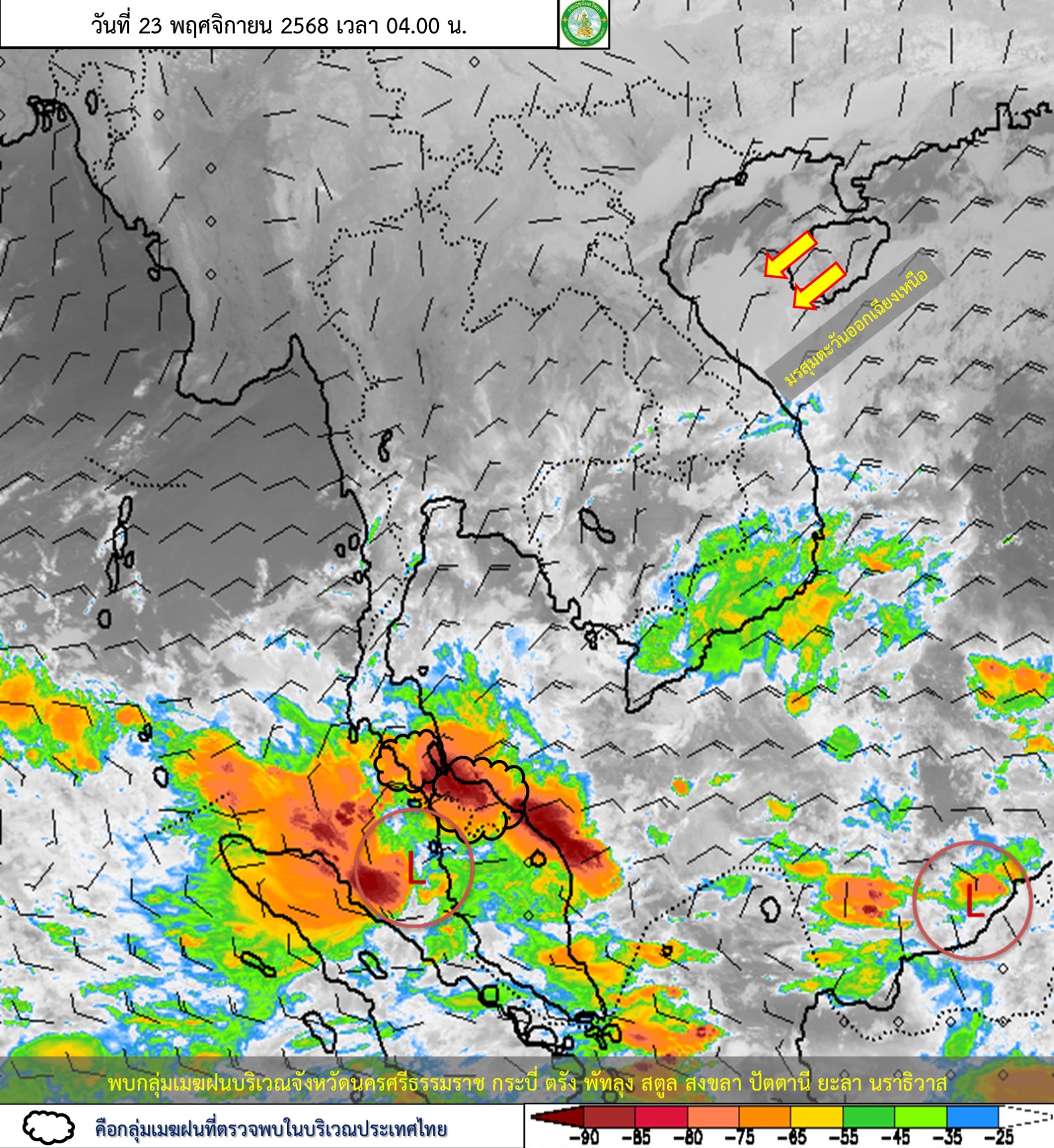 ลักษณะอากาศทั่วไป : พยากรณ์อากาศ 24 ชั่วโมงข้างหน้า ภาคใต้ตอนล่าง โดยเฉพาะบริเวณจังหวัดนครศรีธรรมราช พัทลุง สงขลา ปัตตานี ยะลา นราธิวาส ภูเก็ต กระบี่ ตรัง และสตูล มีฝนตกหนักหลายพื้นที่ และมีฝนตกหนักมากบางแห่ง เนื่องจากมีหย่อมความกดอากาศต่ำปกคลุมบริเวณทะเลอันดามันตอนล่าง และประเทศมาเลเซีย ประกอบกับมรสุมตะวันออกเฉียงเหนือกำลังค่อนข้างแรงยังคงพัดปกคลุมอ่าวไทยตอนบน ภาคใต้ตอนบน และทะเลอันดามันตอนบน ขอให้ประชาชนในบริเวณดังกล่าวระวังอันตรายจากฝนตกหนักถึงหนักมากและฝนที่ตกสะสม ซึ่งอาจทำให้เกิดน้ำท่วมฉับพลัน น้ำป่าไหลหลาก และน้ำล้นตลิ่ง โดยเฉพาะพื้นที่ลาดเชิงเขาใกล้ทางน้ำไหลผ่าน และพื้นที่ลุ่ม