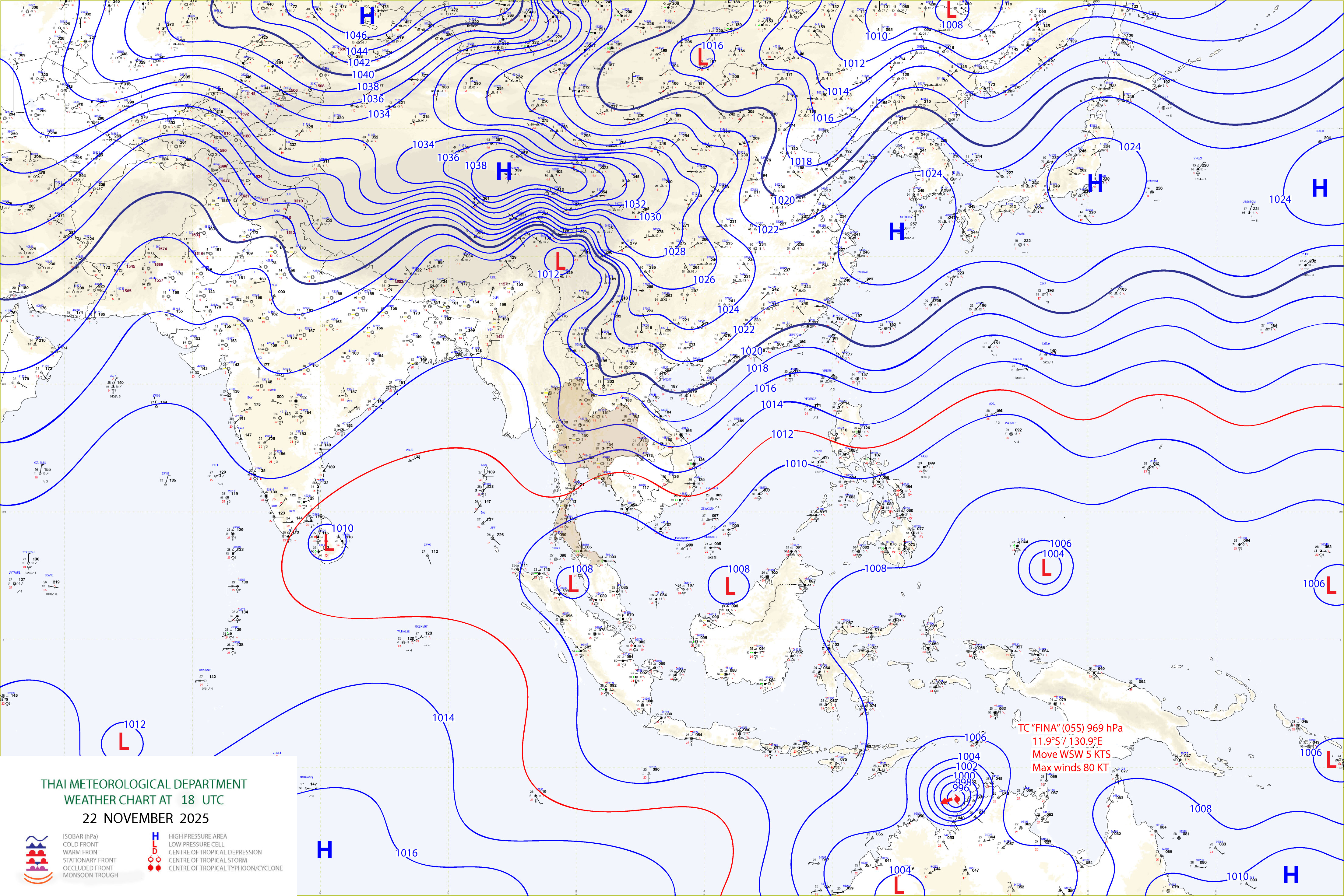 -ส่วนคลื่นลมบริเวณอ่าวไทยและห่างฝั่งของทะเลอันดามันยังคงมีกำลังค่อนข้างแรง โดยมีคลื่นสูง 2-3 เมตร บริเวณที่มีฝนฟ้าคะนองคลื่นสูงมากกว่า 3 เมตร ขอให้ชาวเรือบริเวณอ่าวไทยและทะเลอันดามันเดินเรือด้วยความระมัดระวังและหลีกเลี่ยงการเดินเรือในบริเวณที่มีฝนฟ้าคะนอง สำหรับเรือเล็กบริเวณอ่าวไทยและห่างฝั่งของทะเลอันดามันควรงดออกจากฝั่งต่อไปอีก 1 วัน (23 พ.ย. 68)