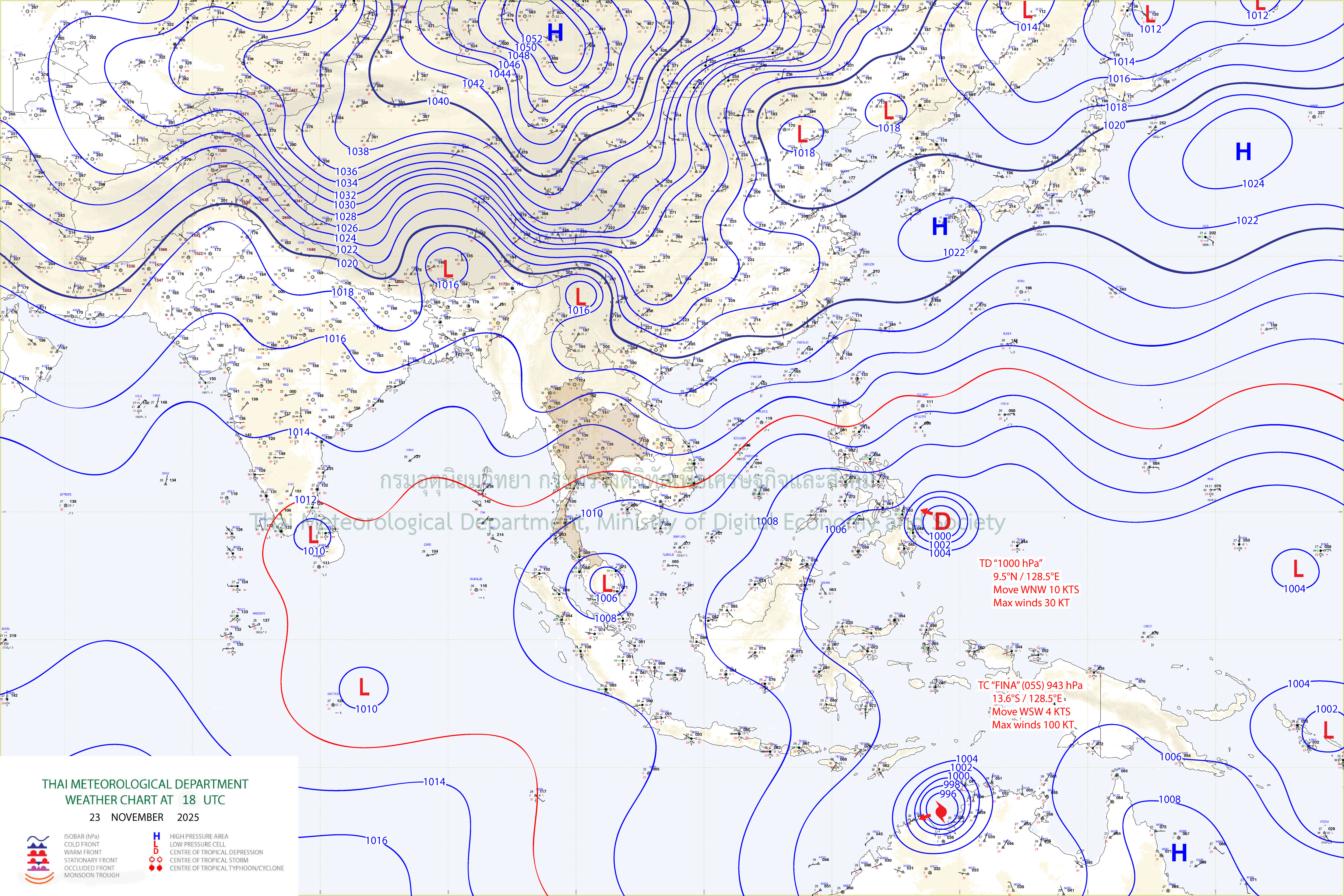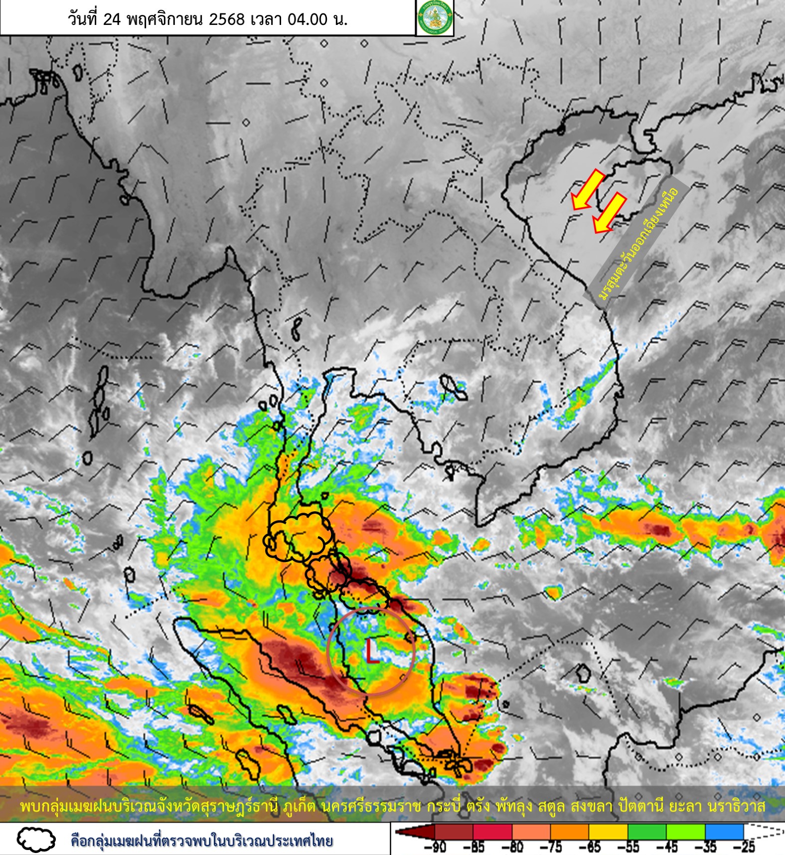 ลักษณะอากาศทั่วไป : พยากรณ์อากาศ 24 ชั่วโมงข้างหน้า ภาคใต้ตอนล่าง โดยเฉพาะบริเวณจังหวัดนครศรีธรรมราช พัทลุง สงขลา ปัตตานี ยะลา นราธิวาส กระบี่ ตรัง และสตูล มีฝนตกหนักหลายพื้นที่ และมีฝนตกหนักมากบางแห่ง เนื่องจากมีหย่อมความกดอากาศต่ำกำลังแรงปกคลุมบริเวณทะเลอันดามันตอนล่าง และประเทศมาเลเซีย ประกอบกับมรสุมตะวันออกเฉียงเหนือกำลังค่อนข้างแรงยังคงพัดปกคลุมอ่าวไทย ภาคใต้ และทะเลอันดามัน ขอให้ประชาชนในภาคใต้ตอนล่างยังคงต้องระวังอันตรายจากฝนตกหนักถึงหนักมาก ฝนที่ตกสะสม น้ำท่วมฉับพลัน น้ำป่าไหลหลาก และน้ำล้นตลิ่ง โดยเฉพาะพื้นที่ลาดเชิงเขาใกล้ทางน้ำไหลผ่านและพื้นที่ลุ่ม ส่วนคลื่นลมบริเวณอ่าวไทยและห่างฝั่งของทะเลอันดามันมีกำลังค่อนข้างแรง โดยมีคลื่นสูง 2-3 เมตร บริเวณที่มีฝนฟ้าคะนองคลื่นสูงมากกว่า 3 เมตร ขอให้ประชาชนภาคใต้ฝั่งตะวันออกระวังอันตรายจากคลื่นที่ซัดเข้าหาฝั่ง ชาวเรือบริเวณอ่าวไทยและทะเลอันดามันเดินเรือด้วยความระมัดระวังและหลีกเลี่ยงการเดินเรือในบริเวณที่มีฝนฟ้าคะนอง สำหรับเรือเล็กบริเวณอ่าวไทยและห่างฝั่งของทะเลอันดามันควรงดออกจากฝั่งต่อไปอีกจนถึงวันที่ 25 พ.ย. 68 สำหรับประเทศไทยตอนบนจะมีอุณหภูมิสูงขึ้นอีก 1 – 2 องศาเซลเซียส กับมีหมอกในตอนเช้า แต่ยังคงมีอากาศเย็นถึงหนาวในภาคเหนือ และภาคตะวันออกเฉียงเหนือ ส่วนภาคกลาง ภาคตะวันออก และภาคใต้ตอนบนมีอากาศเย็นในตอนเช้า ขอให้ประชาชนในบริเวณดังกล่าวดูแลรักษาสุขภาพเนื่องจากสภาพอากาศที่เปลี่ยนแปลง และระวังอันตรายจากอัคคีภัยเนื่องจากสภาพอากาศแห้ง รวมทั้งเพิ่มความระมัดระวังในการสัญจรผ่านบริเวณที่มีหมอกไว้ด้วย ทั้งนี้เนื่องจากบริเวณความกดอากาศสูงหรือมวลอากาศเย็นกำลังแรงจากประเทศจีนที่ปกคลุมประเทศไทยตอนบน ภาคใต้ตอนบน และทะเลจีนใต้ มีกำลังอ่อนลง
