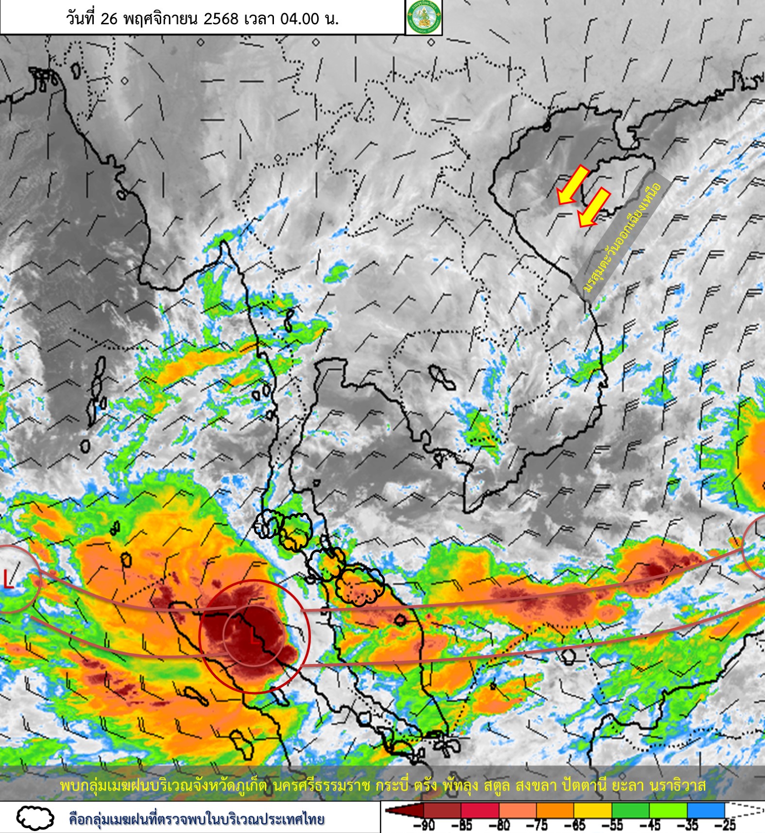 ลักษณะอากาศทั่วไป : พยากรณ์อากาศ 24 ชั่วโมงข้างหน้า ภาคใต้ตอนล่าง โดยเฉพาะบริเวณจังหวัดพัทลุง สงขลา ปัตตานี ยะลา นราธิวาส ตรัง และสตูล ยังคงมีฝนตกหนักบางแห่ง เนื่องจากหย่อมความกดอากาศต่ำกำลังแรงได้เคลื่อนออกไปปกคลุมทะเลอันดามันตอนล่าง และช่องแคบมะละกา ประกอบกับมรสุมตะวันออกเฉียงเหนือกำลังปานกลางพัดปกคลุมอ่าวไทย ภาคใต้ และทะเลอันดามัน ขอให้ประชาชนในภาคใต้ตอนล่างยังคงต้องระวังอันตรายจากฝนตกหนัก ฝนที่ตกสะสม น้ำท่วมฉับพลัน น้ำป่าไหลหลาก และน้ำล้นตลิ่ง โดยเฉพาะพื้นที่ลาดเชิงเขาใกล้ทางน้ำไหลผ่านและพื้นที่ลุ่ม ส่วนคลื่นลมบริเวณอ่าวไทยมีกำลังอ่อนลง โดยมีคลื่นสูงประมาณ 2 เมตร บริเวณที่มีฝนฟ้าคะนองคลื่นสูงมากกว่า 2 เมตร ขอให้ชาวเรือบริเวณอ่าวไทยและทะเลอันดามันเดินเรือด้วยความระมัดระวังและหลีกเลี่ยงการเดินเรือในบริเวณที่มีฝนฟ้าคะนอง