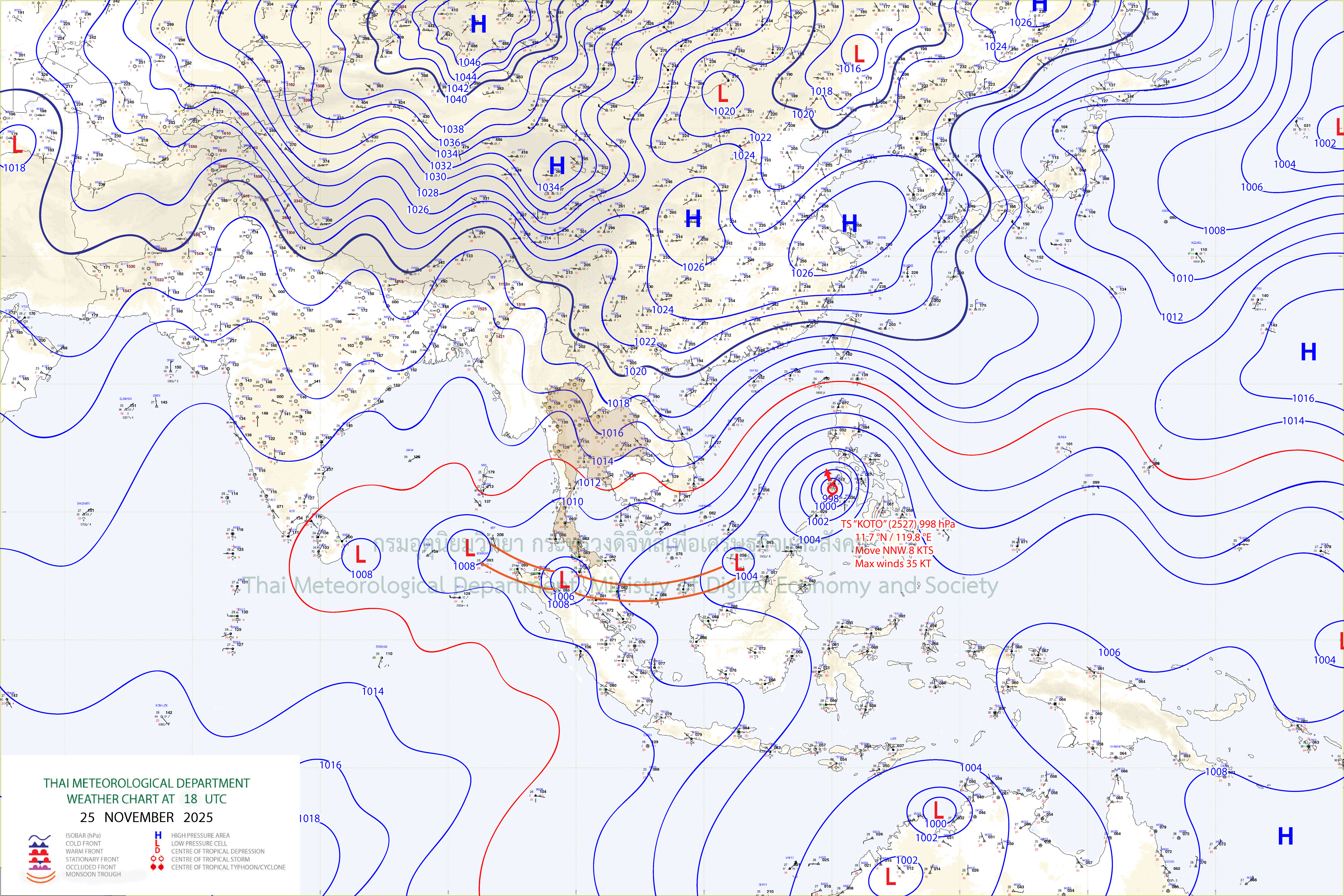 อนึ่ง พายุโซนร้อน “โคโตะ” (KOTO) บริเวณประเทศฟิลิปปินส์ มีแนวโน้มจะเคลื่อนลงสู่ทะเลจีนใต้ตอนกลางในช่วงวันที่ 25–26 พ.ย. หลังจากนั้นจะมีกำลังแรงขึ้น และเคลื่อนเข้าใกล้ชายฝั่งประเทศเวียดนามตอนใต้ ในช่วงวันที่ 28–30 พ.ย. ในขณะที่บริเวณความกดอากาศสูงหรือมวลอากาศเย็นปกคลุมบริเวณประเทศเวียดนามและทะเลจีนใต้ ส่งผลให้พายุนี้จะอ่อนกำลังลงอย่างรวดเร็วตามลำดับ โดยพายุนี้ไม่เคลื่อนเข้าสู่ประเทศไทย แต่จะส่งผลให้ลมตะวันออกเฉียงเหนือที่พัดปกคลุมประเทศไทยตอนบนมีกำลังแรงขึ้น