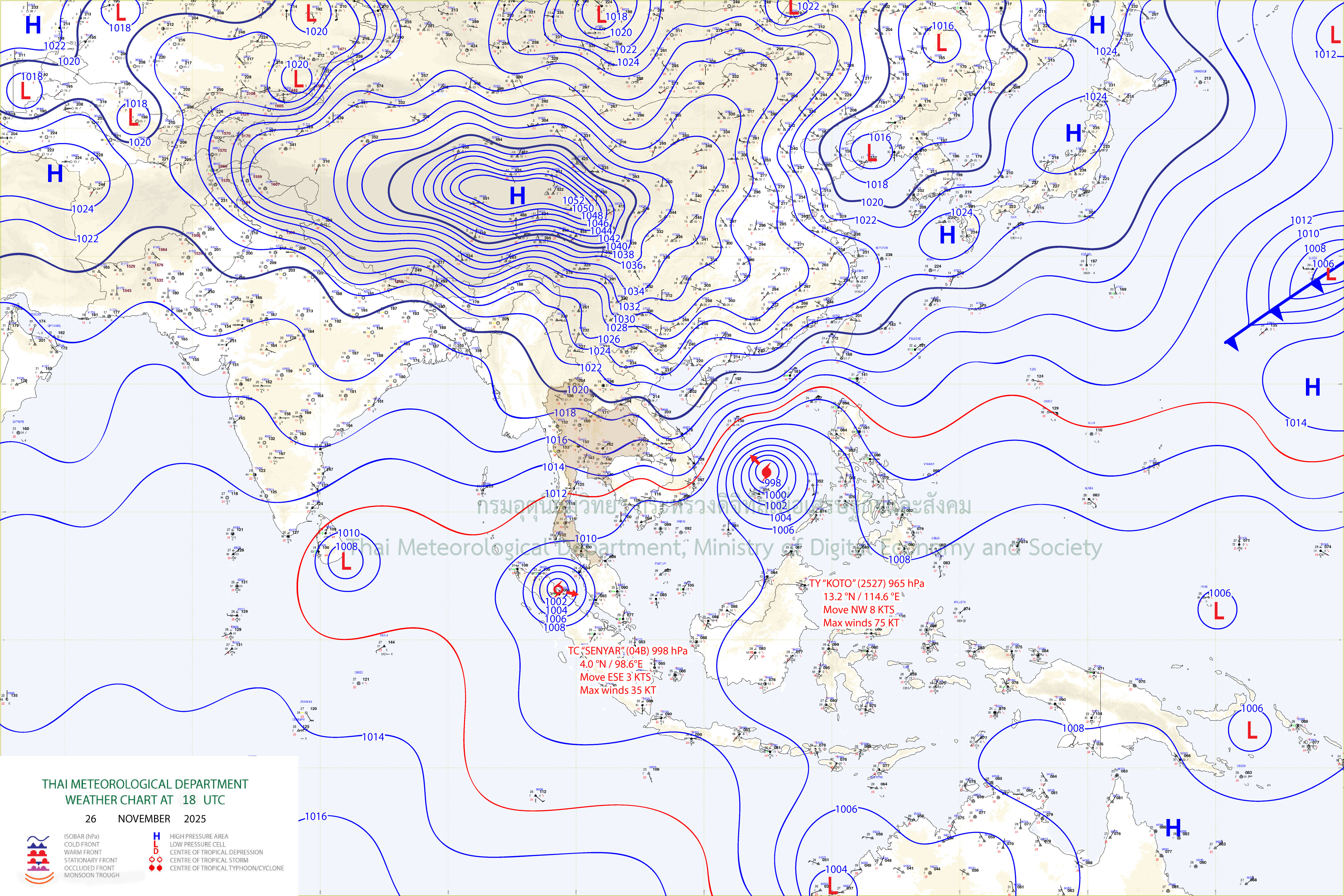 -อนึ่ง พายุไต้ฝุ่น “โคโตะ” (KOTO) บริเวณทะเลจีนใต้ตอนกลาง คาดว่าจะเคลื่อนเข้าใกล้ชายฝั่งประเทศเวียดนามตอนใต้ ในช่วงวันที่ 28-30 พ.ย. ในขณะที่บริเวณความกดอากาศสูงหรือมวลอากาศเย็นปกคลุมบริเวณประเทศเวียดนามและทะเลจีนใต้ ส่งผลให้พายุนี้จะอ่อนกำลังลงอย่างรวดเร็วตามลำดับ โดยพายุนี้ไม่เคลื่อนเข้าสู่ประเทศไทย ส่วนพายุไซโคลน “ซินญาร” ได้เคลื่อนห่างออกไปและปกคลุมบริเวณเกาะสุมาตรา ประเทศอินโดนีเซีย