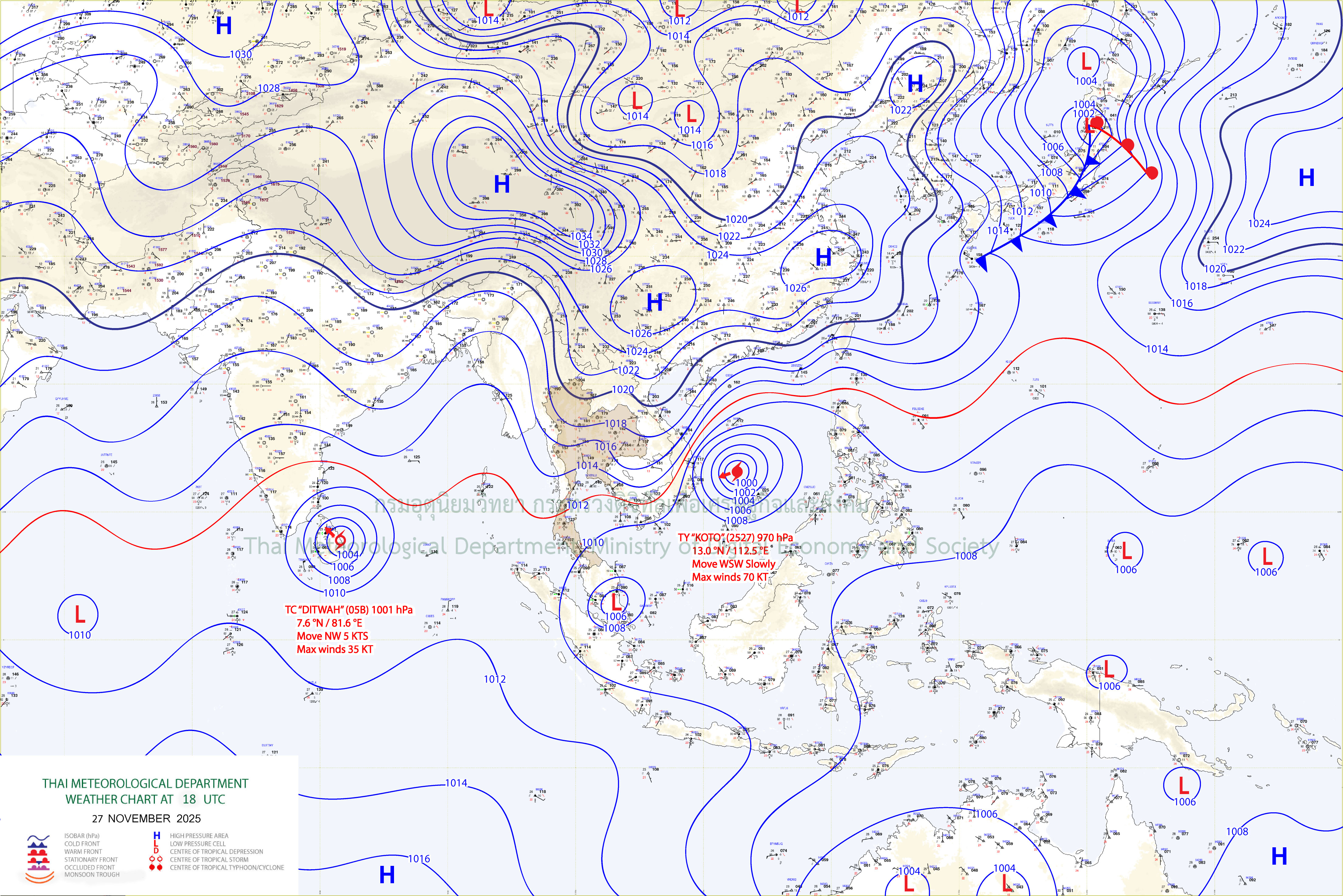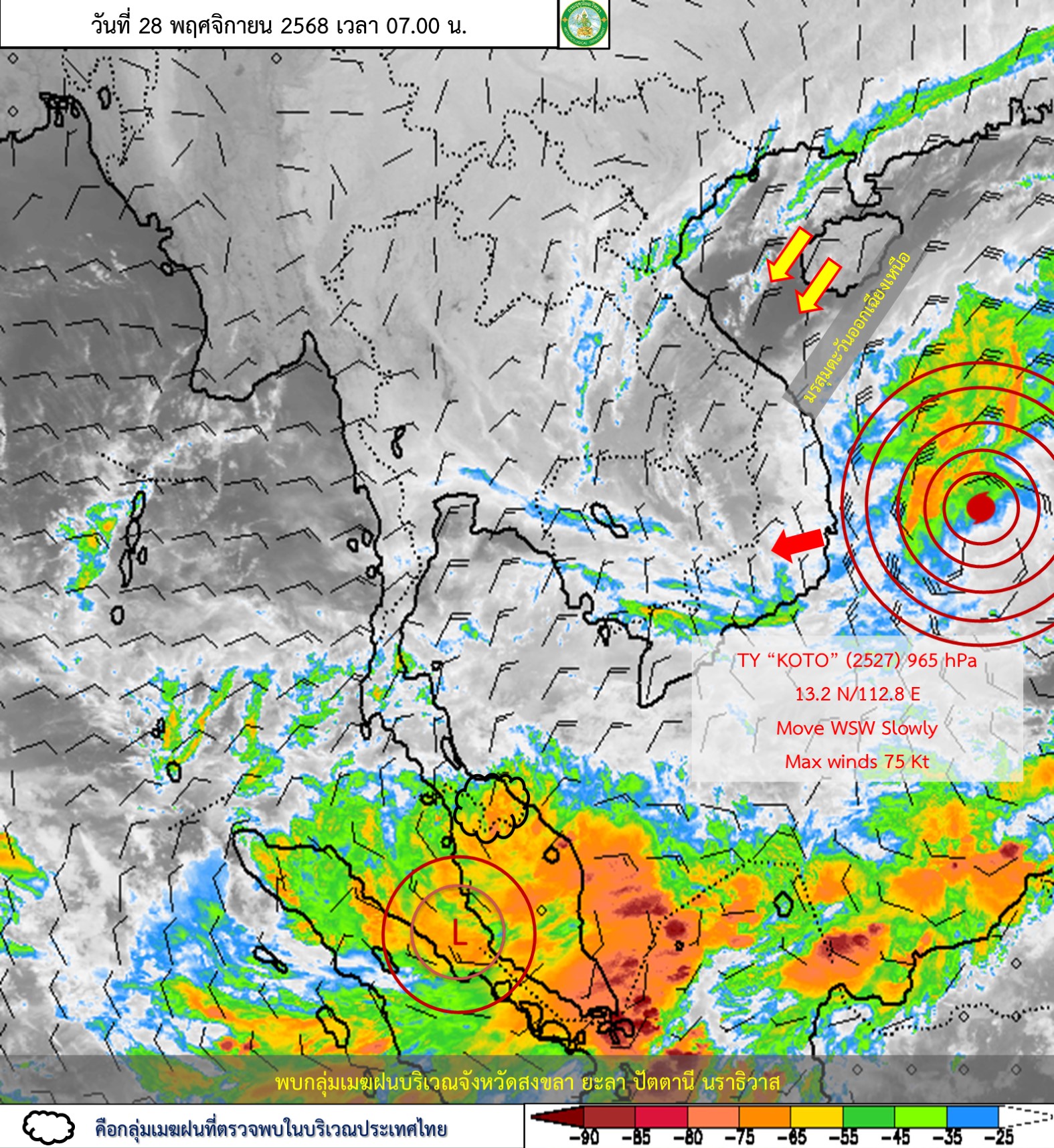 ลักษณะอากาศทั่วไป : พยากรณ์อากาศ 24 ชั่วโมงข้างหน้า ประเทศไทยตอนบน และภาคใต้ตอนบนมีอากาศเย็นลงและมีอากาศเย็นถึงหนาวกับมีลมแรง โดยภาคตะวันออกเฉียงเหนือ อุณหภูมิจะลดลงอีกเล็กน้อย ส่วนภาคเหนือ ภาคกลาง รวมทั้งกรุงเทพมหานครและปริมณฑล ภาคตะวันออก และภาคใต้ตอนบน อุณหภูมิจะลดลง 1–2 องศาเซลเซียส ขอให้ประชาชนในบริเวณดังกล่าวดูแลรักษาสุขภาพเนื่องจากสภาพอากาศที่หนาวเย็นลง รวมถึงให้ระวังอันตรายจากอัคคีภัยที่อาจจะเกิดขึ้นจากสภาพอากาศแห้งและลมแรง ทั้งนี้เนื่องจากบริเวณความกดอากาศสูงหรือมวลอากาศเย็นกำลังค่อนข้างแรงจากประเทศจีนได้แผ่ลงมาปกคลุมประเทศไทยตอนบน ภาคใต้ตอนบน และทะเลจีนใต้ตอนบนแล้ว สำหรับภาคใต้ตอนล่างมีฝนลดลง แต่ยังคงมีฝนฟ้าคะนองบางแห่ง เนื่องจากมรสุมตะวันออกเฉียงเหนือกำลังปานกลางพัดปกคลุมอ่าวไทย ภาคใต้ และทะเลอันดามัน ส่วนคลื่นลมบริเวณอ่าวไทยมีกำลังปานกลาง โดยมีคลื่นสูงประมาณ 2 เมตร บริเวณที่มีฝนฟ้าคะนองคลื่นสูงมากกว่า 2 เมตร ขอให้ชาวเรือบริเวณอ่าวไทยและทะเลอันดามันเดินเรือด้วยความระมัดระวังและหลีกเลี่ยงการเดินเรือในบริเวณที่มีฝนฟ้าคะนอง อนึ่ง พายุโซนร้อนกำลังแรง “โคโตะ” (KOTO) บริเวณทะเลจีนใต้ตอนกลาง คาดว่าจะเคลื่อนเข้าใกล้ชายฝั่งประเทศเวียดนามในช่วงวันที่ 30 พ.ย. - 2 ธ.ค. 68 ในขณะที่บริเวณความกดอากาศสูงหรือมวลอากาศเย็นปกคลุมบริเวณประเทศเวียดนามและทะเลจีนใต้ตอนบน ส่งผลให้พายุนี้จะอ่อนกำลังลงอย่างรวดเร็วตามลำดับ โดยพายุนี้ไม่เคลื่อนเข้าสู่ประเทศไทย