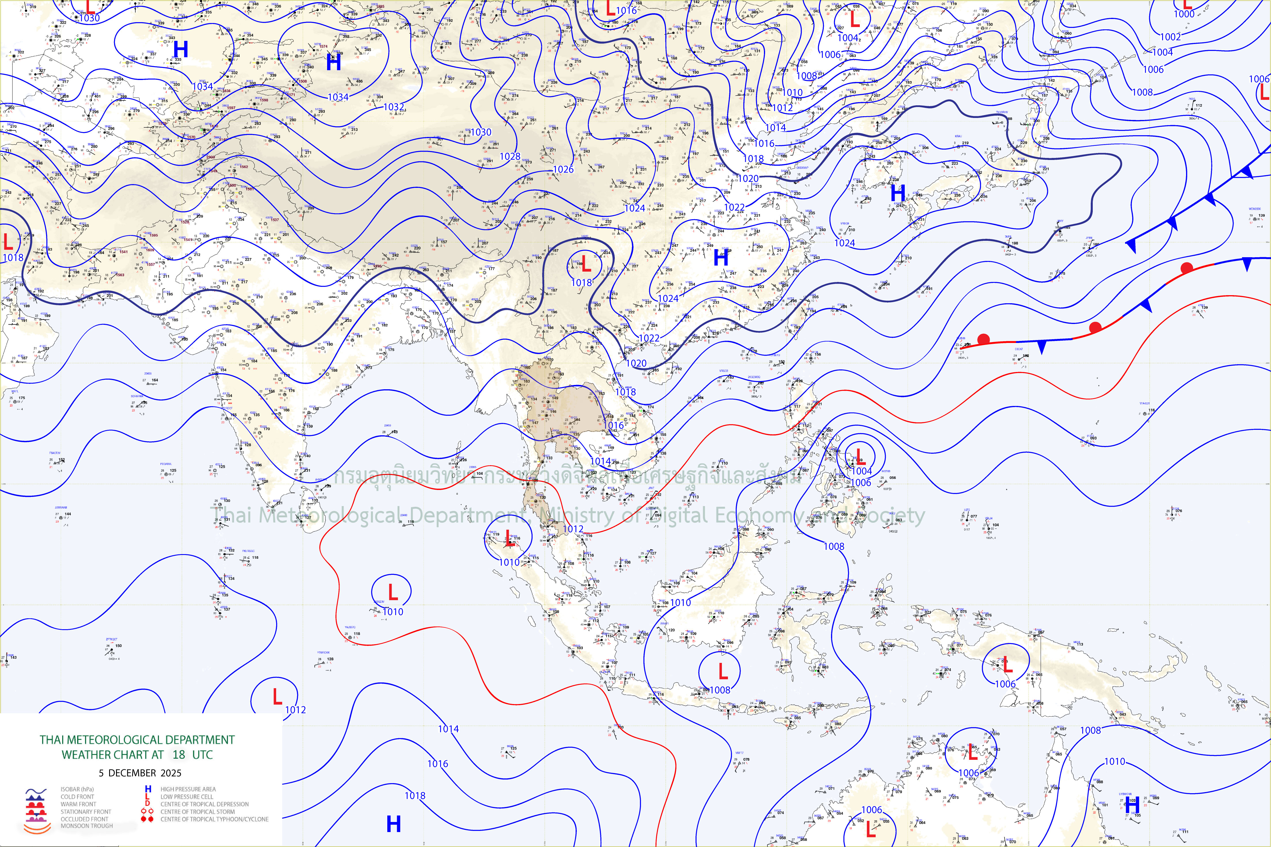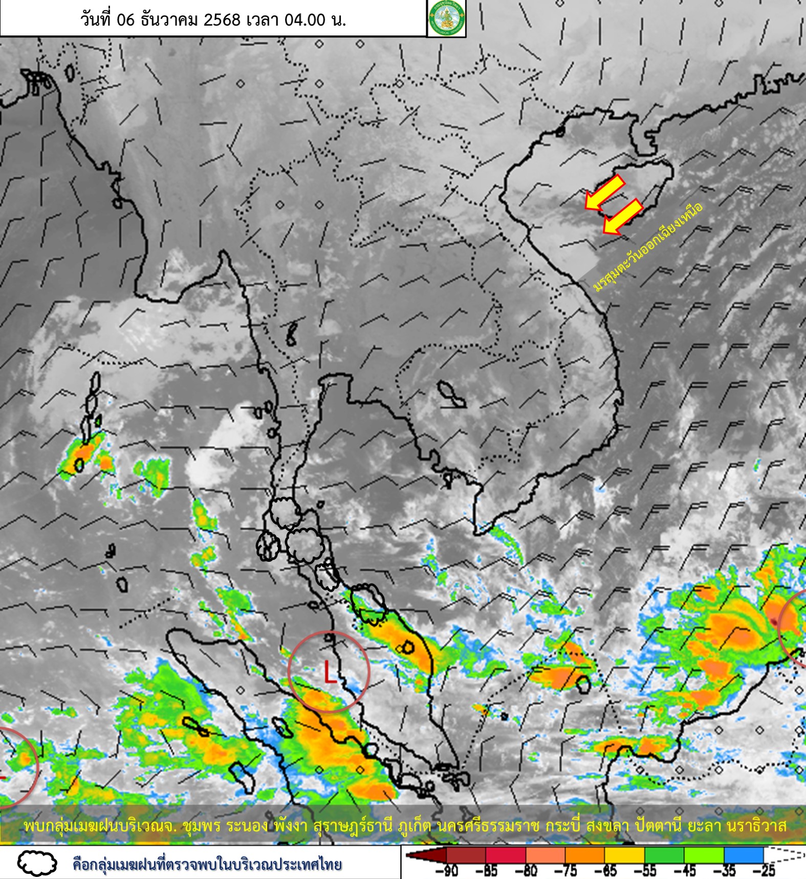 ลักษณะอากาศทั่วไป : พยากรณ์อากาศ 24 ชั่วโมงข้างหน้า ภาคใต้มีฝนเพิ่มขึ้นและมีฝนตกหนักบางแห่ง โดยเฉพาะบริเวณจังหวัดชุมพร สุราษฎร์ธานี นครศรีธรรมราช พัทลุง สงขลา ระนอง พังงา และภูเก็ต ส่วนประเทศไทยตอนบน มีฝน/ฝนฟ้าคะนองเกิดขึ้นได้บางพื้นที่บริเวณภาคเหนือตอนล่าง ภาคตะวันออกเฉียงเหนือตอนล่าง และภาคตะวันออก แต่ยังคงมีอากาศเย็นในตอนเช้า ขอให้ประชาชนบริเวณภาคใต้ระวังอันตรายจากฝนตกหนักและฝนที่ตกสะสม ส่วนประชาชนในบริเวณประเทศไทยตอนบนดูแลรักษาสุขภาพจากสภาพอากาศที่เปลี่ยนแปลง และเพิ่มความระมัดระวังในการสัญจรผ่านบริเวณที่มีหมอก รวมถึงให้ระวังอันตรายจากอัคคีภัยที่อาจเกิดขึ้นได้จากสภาพอากาศแห้งไว้ด้วย ทั้งนี้เนื่องจากบริเวณความกดอากาศสูงหรือมวลอากาศเย็นกำลังปานกลางจากประเทศจีนปกคลุมภาคเหนือตอนบน ภาคตะวันออกเฉียงเหนือ และทะเลจีนใต้ ส่งผลทำให้มีลมตะวันออกพัดนำความชื้นเข้ามาปกคลุมภาคตะวันออกเฉียงเหนือตอนล่าง ภาคกลาง ภาคตะวันออก อ่าวไทย และภาคใต้ สำหรับบริเวณอ่าวไทยมีคลื่นสูง 1-2 เมตร บริเวณที่มีฝนฟ้าคะนองคลื่นสูงมากกว่า 2 เมตร ขอให้ชาวเรือบริเวณอ่าวไทยและทะเลอันดามัน ควรเพิ่มความระมัดระวังในการเดินเรือ และหลีกเลี่ยงการเดินเรือในบริเวณที่มีฝนฟ้าคะนอง
