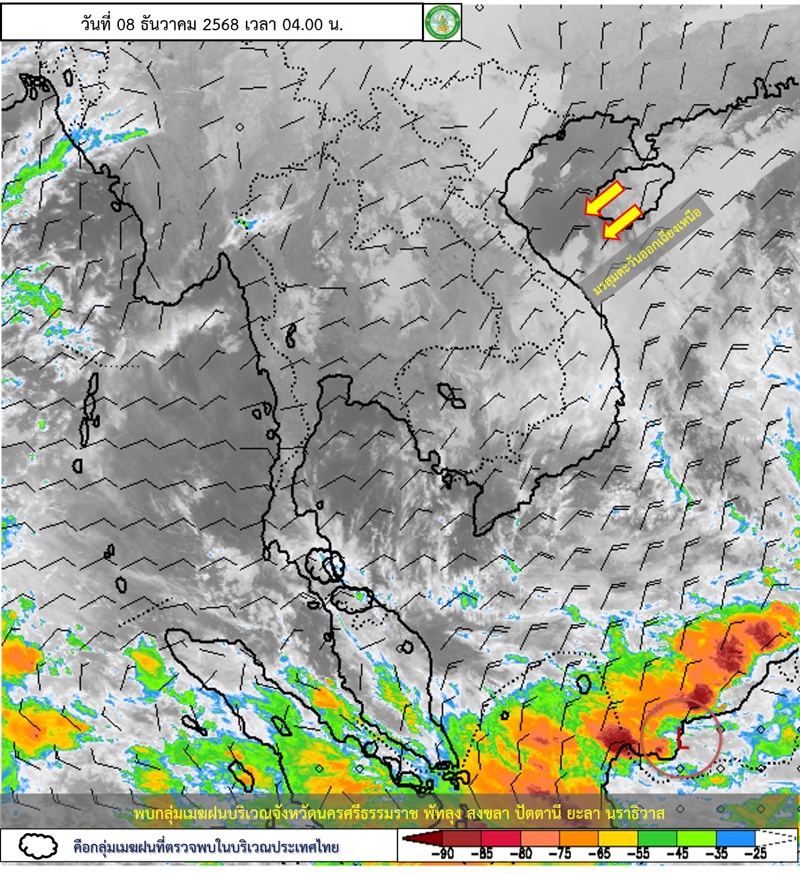ลักษณะอากาศทั่วไป : พยากรณ์อากาศ 24 ชั่วโมงข้างหน้า ประเทศไทยตอนบน และภาคใต้ตอนบนมีอากาศเย็นลง กับมีลมแรง และอุณหภูมิจะลดลง 1-3 องศาเซลเซียส โดยภาคเหนือ และภาคตะวันออกเฉียงเหนือ มีอากาศเย็นถึงหนาว ส่วนภาคกลาง รวมทั้งกรุงเทพมหานครและปริมณฑล ภาคตะวันออก และภาคใต้ตอนบนมีอากาศเย็น ในตอนเช้า ขอให้ประชาชนในบริเวณดังกล่าวดูแลรักษาสุขภาพเนื่องจากสภาพอากาศที่หนาวเย็นลง รวมถึงระวังอันตรายจากอัคคีภัยที่อาจเกิดขึ้นจากสภาพอากาศแห้งและลมแรง เนื่องจากบริเวณความกดอากาศสูงหรือมวลอากาศเย็นกำลังปานกลางระลอกใหม่จากประเทศจีนได้แผ่ปกคลุมประเทศเวียดนามตอนบน และประเทศลาวตอนบนแล้ว คาดว่าจะแผ่ลงมาปกคลุมประเทศไทยตอนบน และทะเลจีนใต้ในวันนี้ (8 ธ.ค. 68) สำหรับภาคใต้มีฝนน้อย แต่ยังคงมีฝนฟ้าคะนองบางแห่ง เนื่องจากมรสุมตะวันออกเฉียงเหนือพัดปกคลุมอ่าวไทย ภาคใต้ และทะเลอันดามัน ส่วนคลื่นลมบริเวณอ่าวไทยมีกำลังปานกลาง โดยอ่าวไทยตอนล่างมีคลื่นสูงประมาณ 2 เมตร อ่าวไทยตอนบนมีคลื่นสูง 1–2 บริเวณที่มีฝนฟ้าคะนองคลื่นสูงมากกว่า 2 เมตร ขอให้ชาวเรือเพิ่มความระมัดระวังในการเดินเรือ และหลีกเลี่ยงการเดินเรือในบริเวณที่มีฝนฟ้าคะนอง