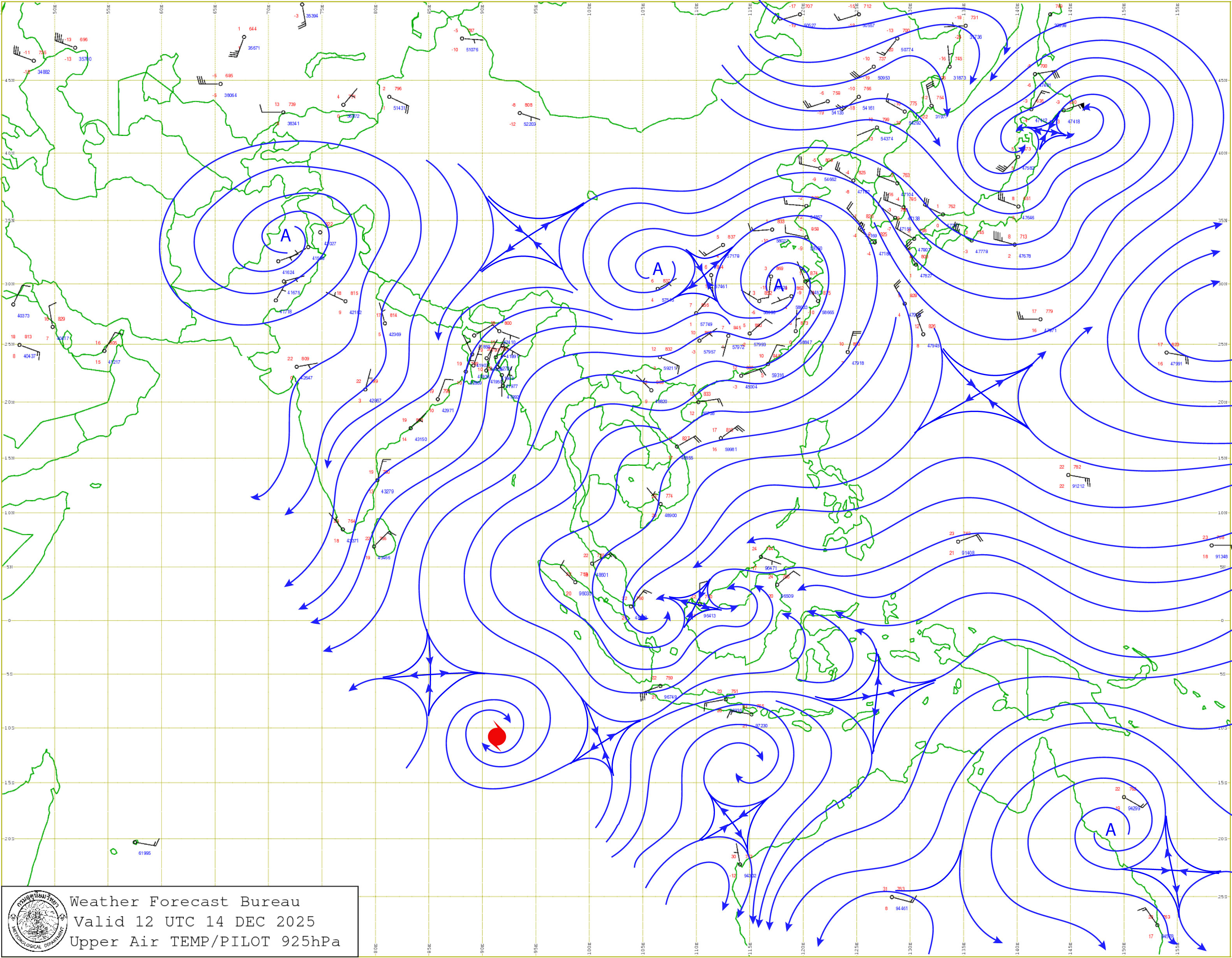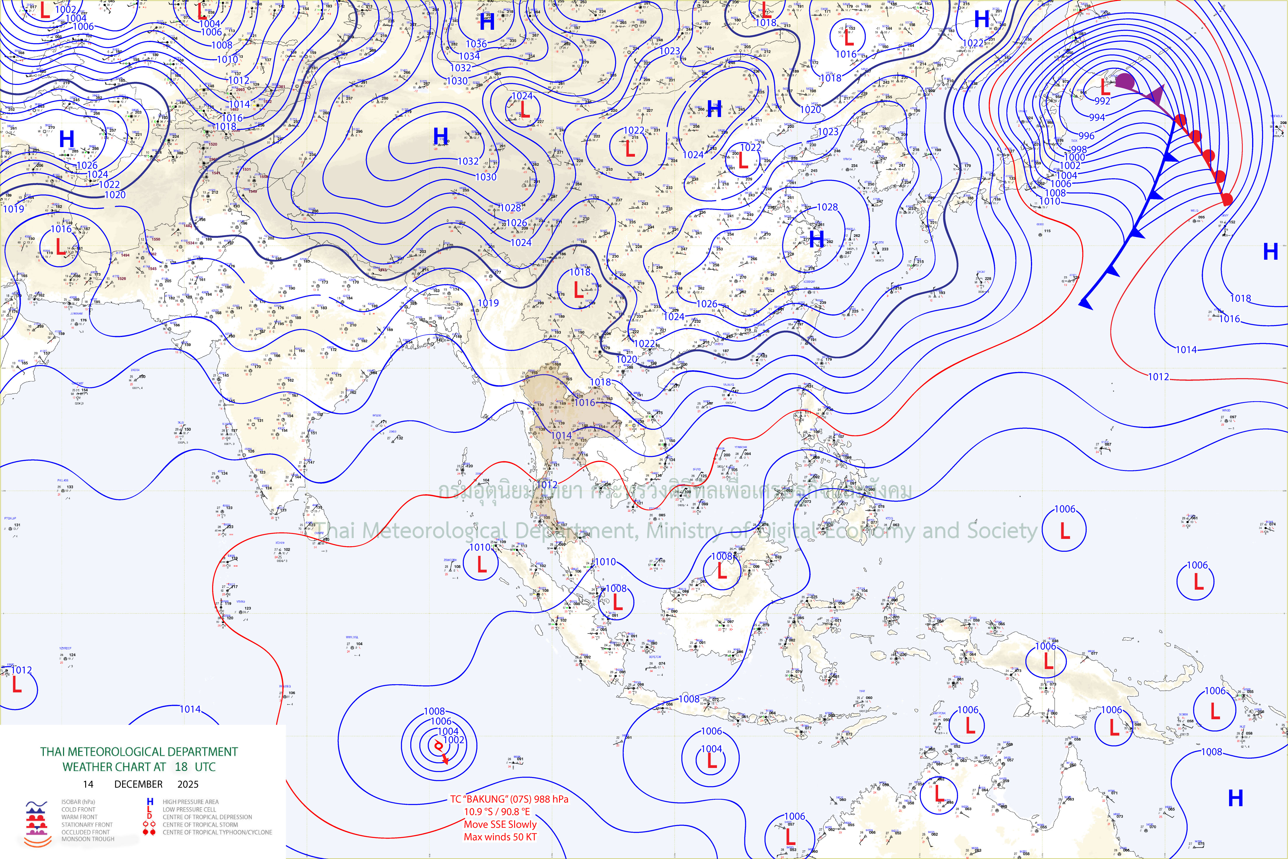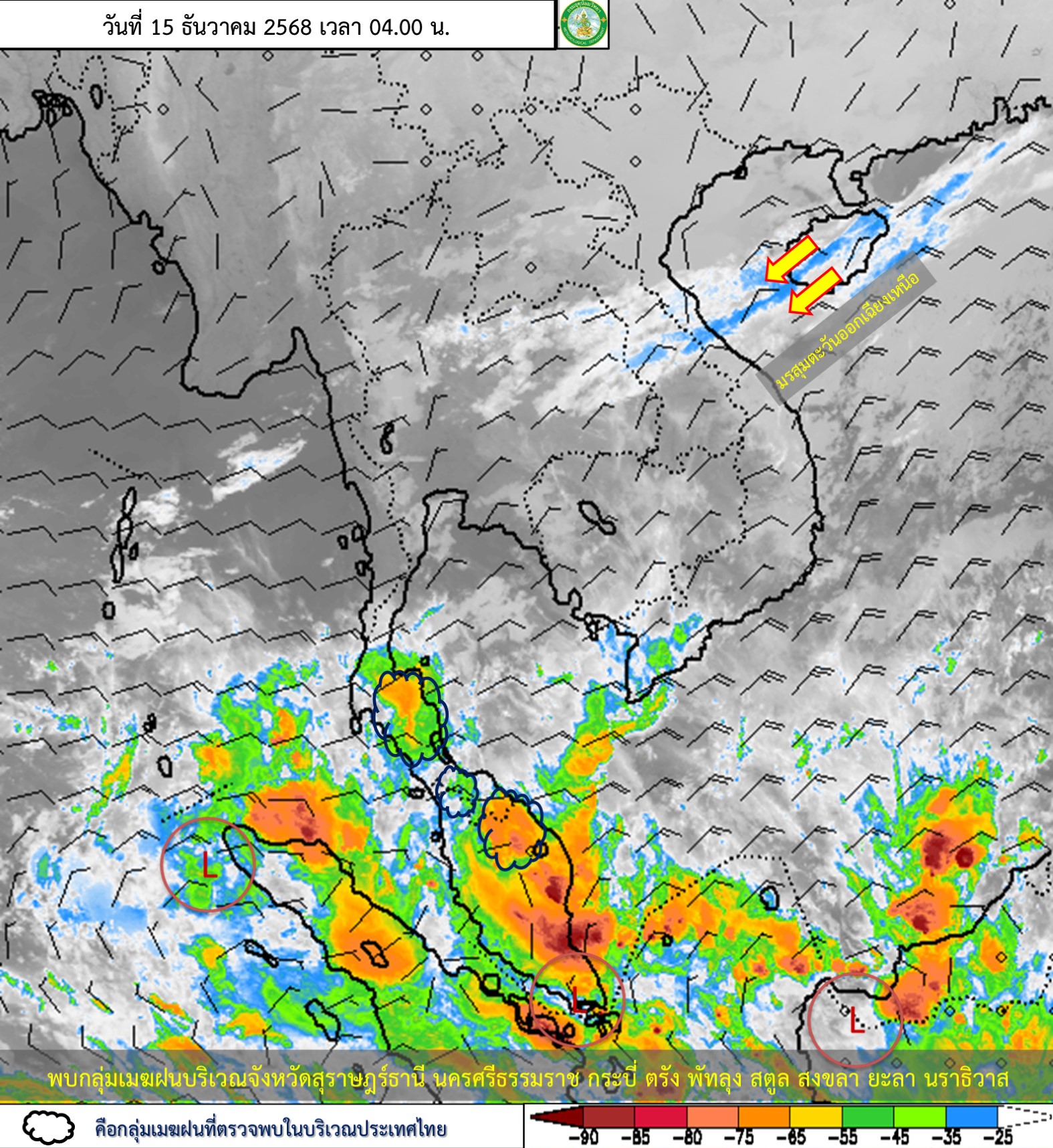 ลักษณะอากาศทั่วไป : พยากรณ์อากาศ 24 ชั่วโมงข้างหน้า ภาคใต้ตอนล่างจะมีฝนตกต่อเนื่องและมีฝนตกหนักถึงหนักมากบางแห่ง โดยเฉพาะบริเวณจังหวัดปัตตานี ยะลา และนราธิวาส เนื่องจากมรสุมตะวันออกเฉียงเหนือที่พัดปกคลุมอ่าวไทยตอนบน ภาคใต้ตอนบน และทะเลอันดามันมีกำลังค่อนข้างแรง ขอให้ประชาชนบริเวณภาคใต้ตอนล่างระวังอันตรายจากฝนตกหนักถึงหนักมาก และฝนที่ตกสะสม ซึ่งอาจทำให้เกิดน้ำท่วมฉับพลันและน้ำป่าไหลหลาก โดยเฉพาะพื้นที่ลาดเชิงเขาใกล้ทางน้ำไหลผ่านและพื้นที่ลุ่ม ส่วนคลื่นลมบริเวณอ่าวไทยตอนล่างมีกำลังค่อนข้างแรง โดยอ่าวไทยตอนล่างมีคลื่นสูง 2-3 เมตร บริเวณที่มีฝนฟ้าคะนองคลื่นสูงมากกว่า 3 เมตร อ่าวไทยตอนบนมีคลื่นสูงประมาณ 2 เมตร บริเวณที่มีฝนฟ้าคะนองคลื่นสูงมากกว่า 2 เมตร ขอให้ชาวเรือบริเวณอ่าวไทยและทะเลอันดามันเดินเรือด้วยความระมัดระวัง และหลีกเลี่ยงการเดินเรือในบริเวณที่มีฝนฟ้าคะนองตลอดช่วง ส่วนเรือเล็กบริเวณอ่าวไทยตอนล่างควรงดออกจากฝั่งในช่วงวันที่ 15-16 ธ.ค. นี้ไว้ด้วย