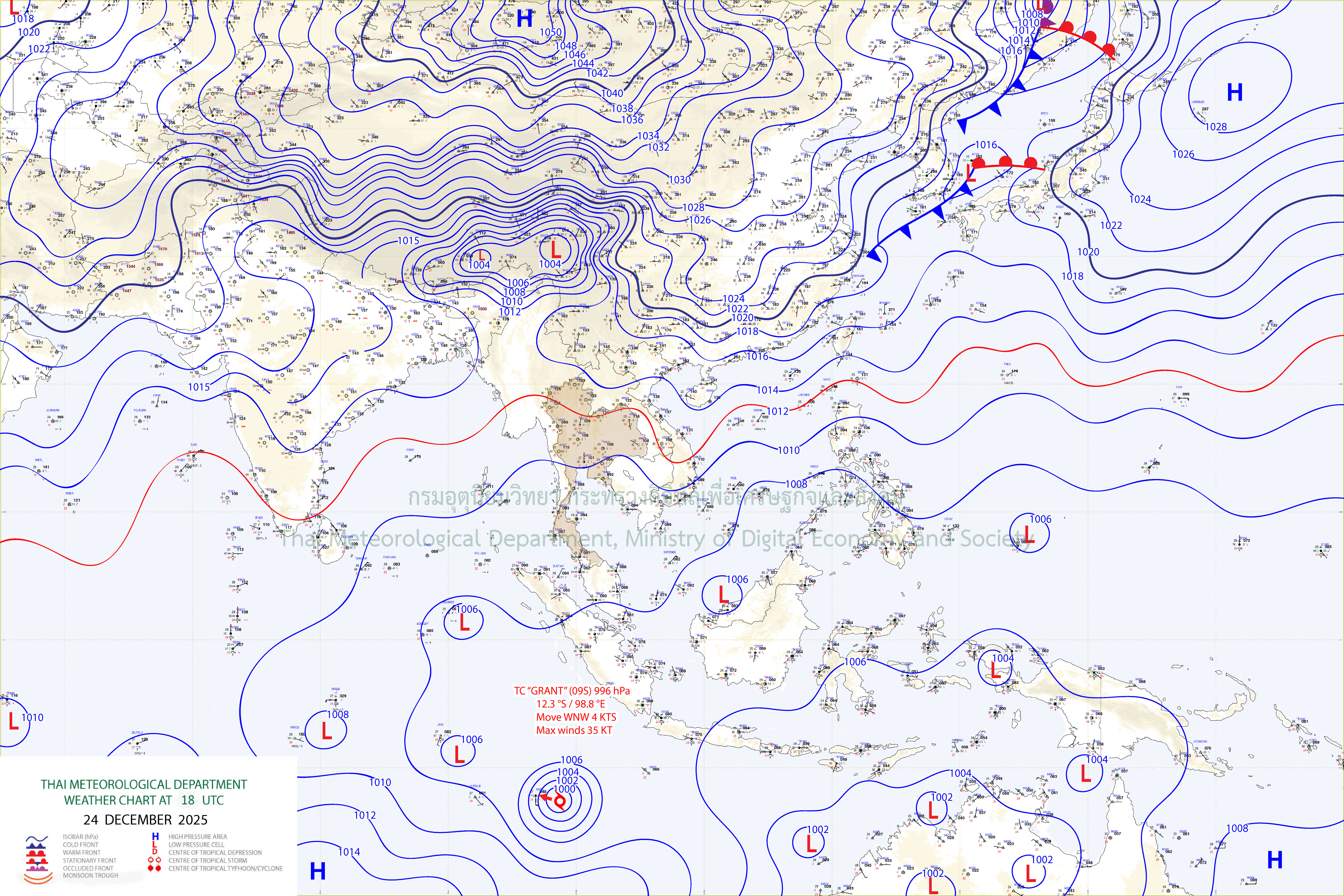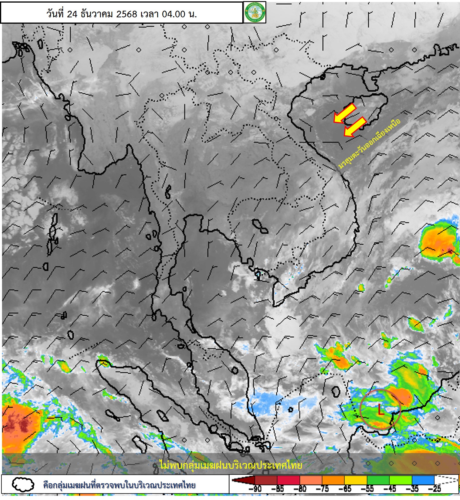 อนึ่ง ในช่วงวันที่ 25–28 ธ.ค. 68 ภาคใต้จะมีฝนเพิ่มขึ้นและมีฝนตกหนักถึงหนักมากบางแห่งทางตอนล่างของภาค เนื่องจากมรสุมตะวันออกเฉียงเหนือที่พัดปกคลุมบริเวณอ่าวไทย ภาคใต้ และทะเลอันดามันจะมีกำลังแรงขึ้น ขอให้ประชาชนบริเวณภาคใต้ตอนล่างระวังอันตรายจากฝนตกหนักถึงหนักมากและฝนที่ตกสะสม