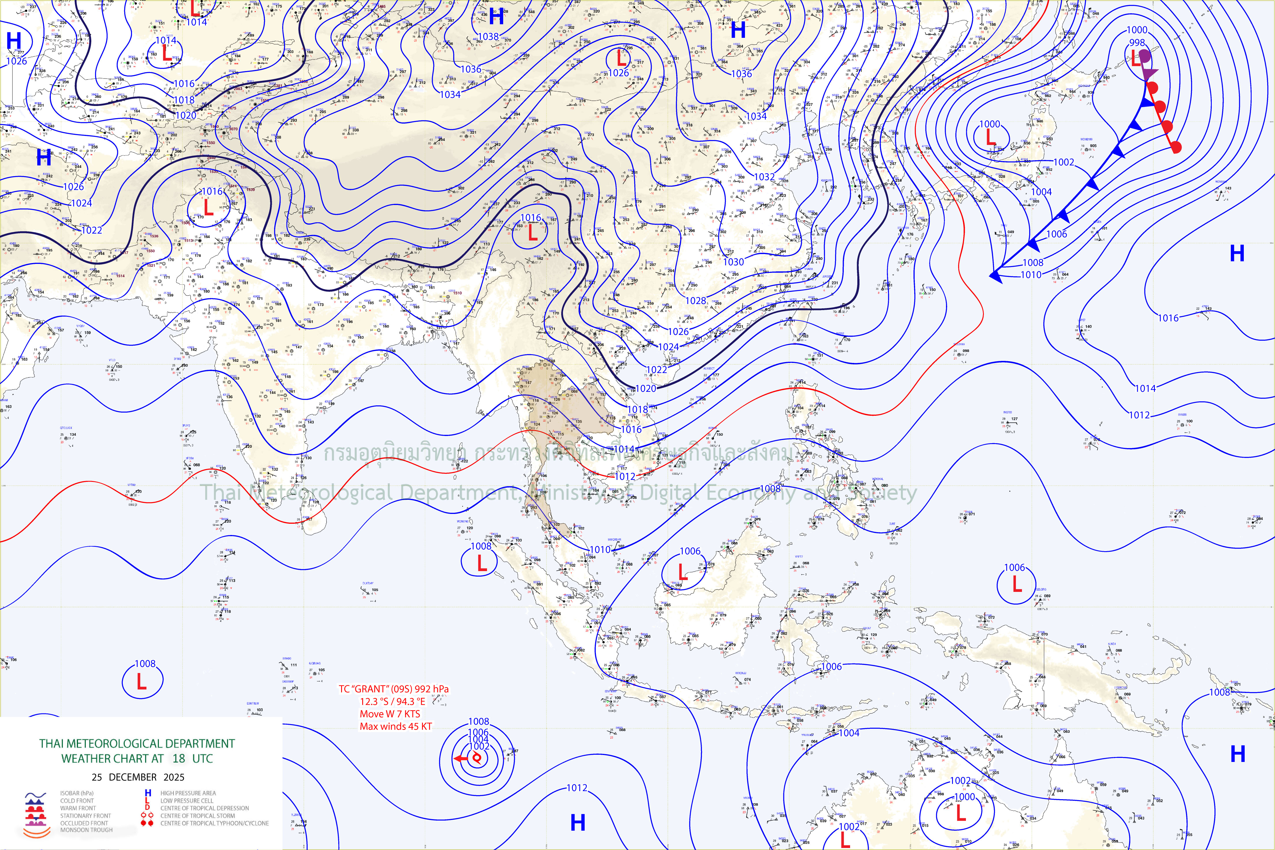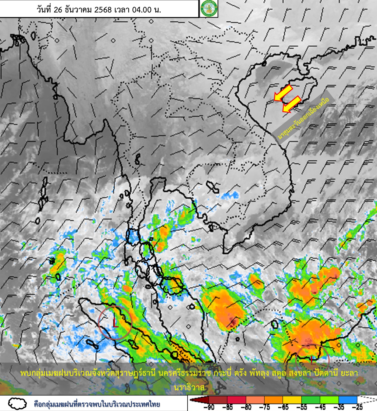 ลักษณะอากาศทั่วไป : พยากรณ์อากาศ 24 ชั่วโมงข้างหน้า ภาคใต้ตอนล่างมีฝนเพิ่มขึ้นและมีฝนตกหนักถึงหนักมากบางแห่ง โดยเฉพาะบริเวณจังหวัดสุราษฏร์ธานี นครศรีธรรมราช พัทลุง สงขลา ปัตตานี ยะลา และนราธิวาส เนื่องจากมรสุมตะวันออกเฉียงเหนือที่พัดปกคลุมอ่าวไทย ภาคใต้ และทะเลอันดามันมีกำลังแรงขึ้น ขอให้ประชาชนบริเวณภาคใต้ตอนล่างระวังอันตรายจากฝนตกหนักถึงหนักมากและฝนที่ตกสะสม ซึ่งอาจทำให้เกิดน้ำท่วมฉับพลันและน้ำป่าไหลหลาก โดยเฉพาะพื้นที่ลาดเชิงเขาใกล้ทางน้ำไหลผ่านและพื้นที่ลุ่ม ส่วนคลื่นลมบริเวณอ่าวไทยตอนล่างมีกำลังค่อนข้างแรง โดยมีคลื่นสูง 2-3 เมตร บริเวณที่มีฝนฟ้าคะนองคลื่นสูงมากกว่า 3 เมตร อ่าวไทยตอนบนมีคลื่นสูงประมาณ 2 เมตร บริเวณที่มีฝนฟ้าคะนองคลื่นสูงมากกว่า 2 เมตร ขอให้ชาวเรือบริเวณอ่าวไทยและทะเลอันดามันเดินเรือด้วยความระมัดระวัง และหลีกเลี่ยงการเดินเรือในบริเวณที่มีฝนฟ้าคะนอง ส่วนเรือเล็กบริเวณอ่าวไทยตอนล่างควรงดออกจากฝั่งจนถึงวันที่ 28 ธ.ค. 68 สำหรับประเทศไทยตอนบนมีอุณหภูมิลดลง กับมีลมแรง เนื่องจากบริเวณความกดอากาศสูงหรือมวลอากาศเย็นกำลังค่อนข้างแรงอีกระลอกหนึ่งจากประเทศจีนได้แผ่ลงมาปกคลุมประเทศไทยตอนบนแล้ว ขอให้ประชาชนบริเวณประเทศไทยตอนบนดูแลรักษาสุขภาพเนื่องจากสภาพอากาศที่หนาวเย็นลง รวมถึงให้ระวังอันตรายจากอัคคีภัยที่อาจเกิดขึ้นเนื่องจากอากาศแห้งและลมแรงไว้ด้วย