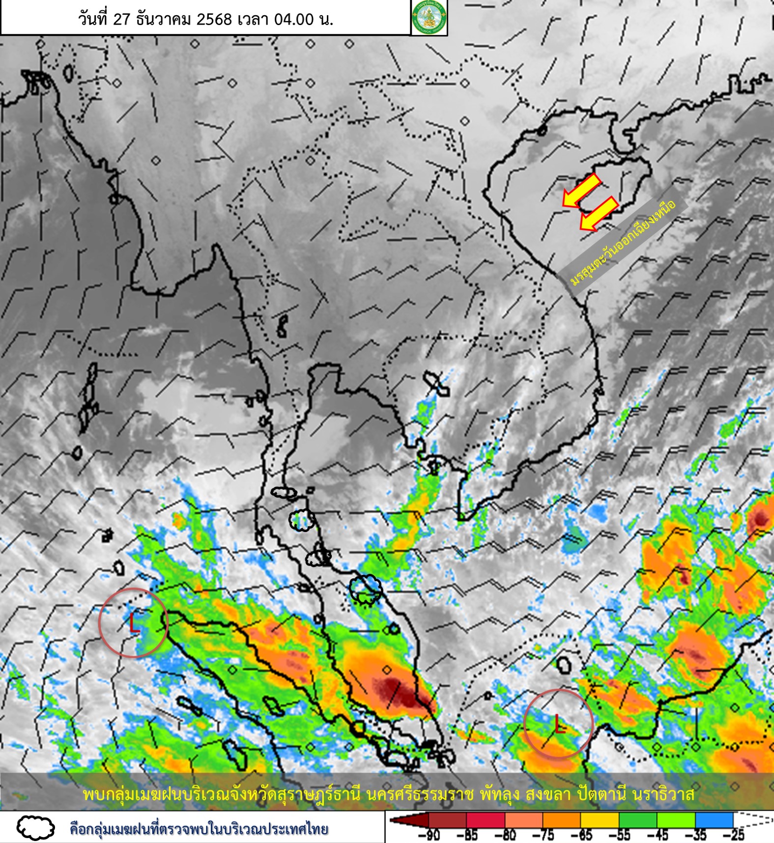 ส่วนคลื่นลมบริเวณอ่าวไทยตอนล่างมีกำลังค่อนข้างแรง โดยมีคลื่นสูง 2-3 เมตร บริเวณที่มีฝนฟ้าคะนองคลื่นสูงมากกว่า 3 เมตร อ่าวไทยตอนบนมีคลื่นสูงประมาณ 2 เมตร บริเวณที่มีฝนฟ้าคะนองคลื่นสูงมากกว่า 2 เมตร ขอให้ชาวเรือบริเวณอ่าวไทยและทะเลอันดามันเดินเรือด้วยความระมัดระวัง และหลีกเลี่ยงการเดินเรือในบริเวณที่มีฝนฟ้าคะนอง เรือเล็กบริเวณอ่าวไทยตอนล่างควรงดออกจากฝั่งจนถึงวันที่ 28 ธ.ค. 68 ประชาชนบริเวณชายฝั่งภาคใต้ฝั่งตะวันออกตอนล่างควรระมัดระวังคลื่นที่ซัดเข้าหาฝั่งไว้ด้วย