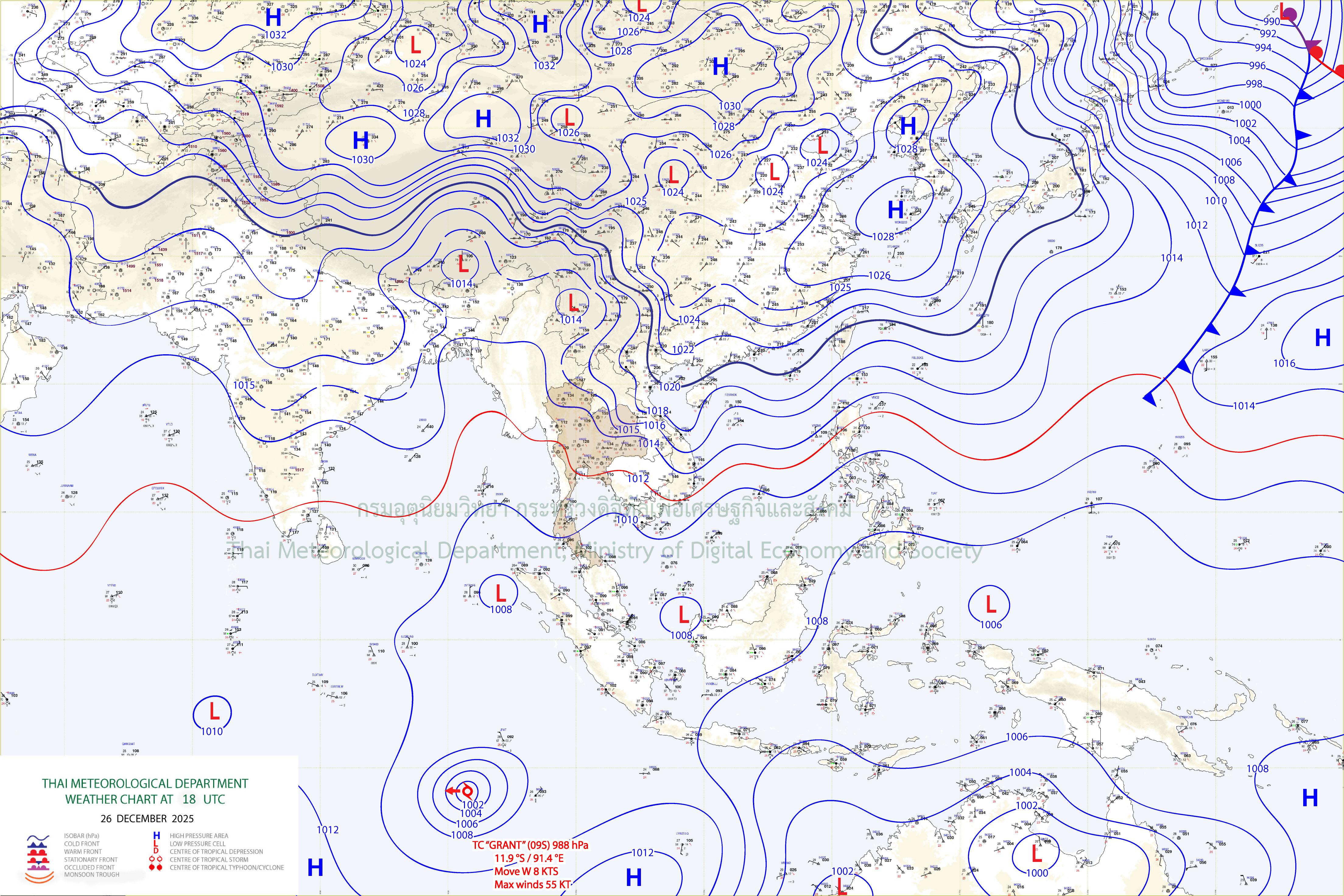 ลักษณะอากาศทั่วไป : พยากรณ์อากาศ 24 ชั่วโมงข้างหน้า ภาคใต้ตอนล่างยังคงมีฝนตกหนักบางแห่ง โดยเฉพาะบริเวณจังหวัดนครศรีธรรมราช พัทลุง สงขลา ปัตตานี ยะลา และนราธิวาส เนื่องจากมรสุมตะวันออกเฉียงเหนือที่พัดปกคลุมอ่าวไทย ภาคใต้ และทะเลอันดามันมีกำลังค่อนข้างแรง ขอให้ประชาชนบริเวณภาคใต้ตอนล่างระวังอันตรายจากฝนตกหนักและฝนที่ตกสะสม ซึ่งอาจทำให้เกิดน้ำท่วมฉับพลันและน้ำป่าไหลหลาก โดยเฉพาะพื้นที่ลาดเชิงเขาใกล้ทางน้ำไหลผ่านและพื้นที่ลุ่ม
