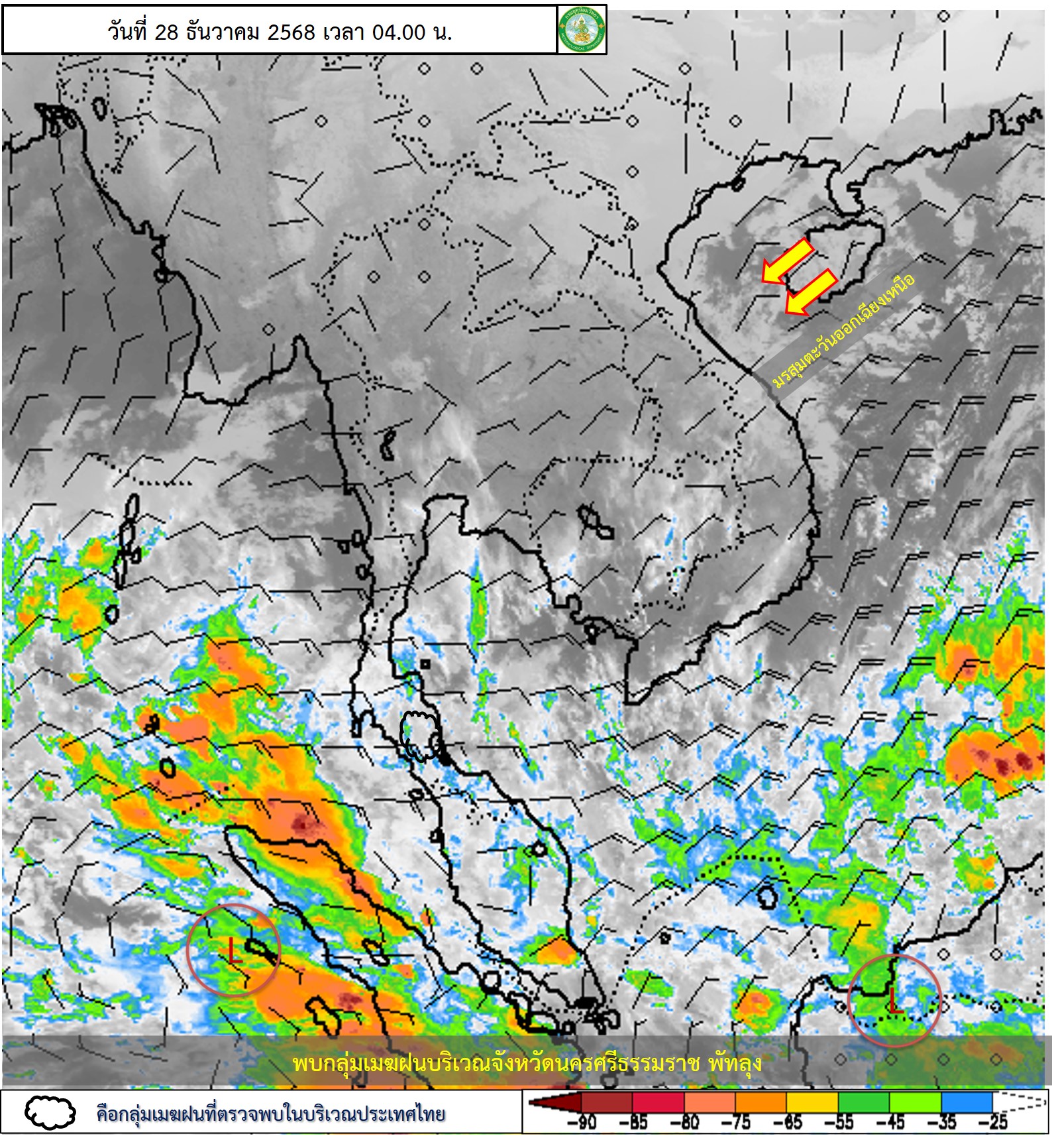ลักษณะอากาศทั่วไป : พยากรณ์อากาศ 24 ชั่วโมงข้างหน้า ภาคใต้ตอนล่างยังคงมีฝนตกหนักบางแห่ง โดยเฉพาะบริเวณจังหวัดนครศรีธรรมราช พัทลุง และสงขลา เนื่องจากมรสุมตะวันออกเฉียงเหนือที่พัดปกคลุมอ่าวไทยตอนล่างและภาคใต้ตอนล่างมีกำลังค่อนข้างแรง ขอให้ประชาชนบริเวณภาคใต้ตอนล่างระวังอันตรายจากฝนตกหนักและฝนที่ตกสะสม ซึ่งอาจทำให้เกิดน้ำท่วมฉับพลันและน้ำป่าไหลหลาก โดยเฉพาะพื้นที่ลาดเชิงเขาใกล้ทางน้ำไหลผ่านและพื้นที่ลุ่ม