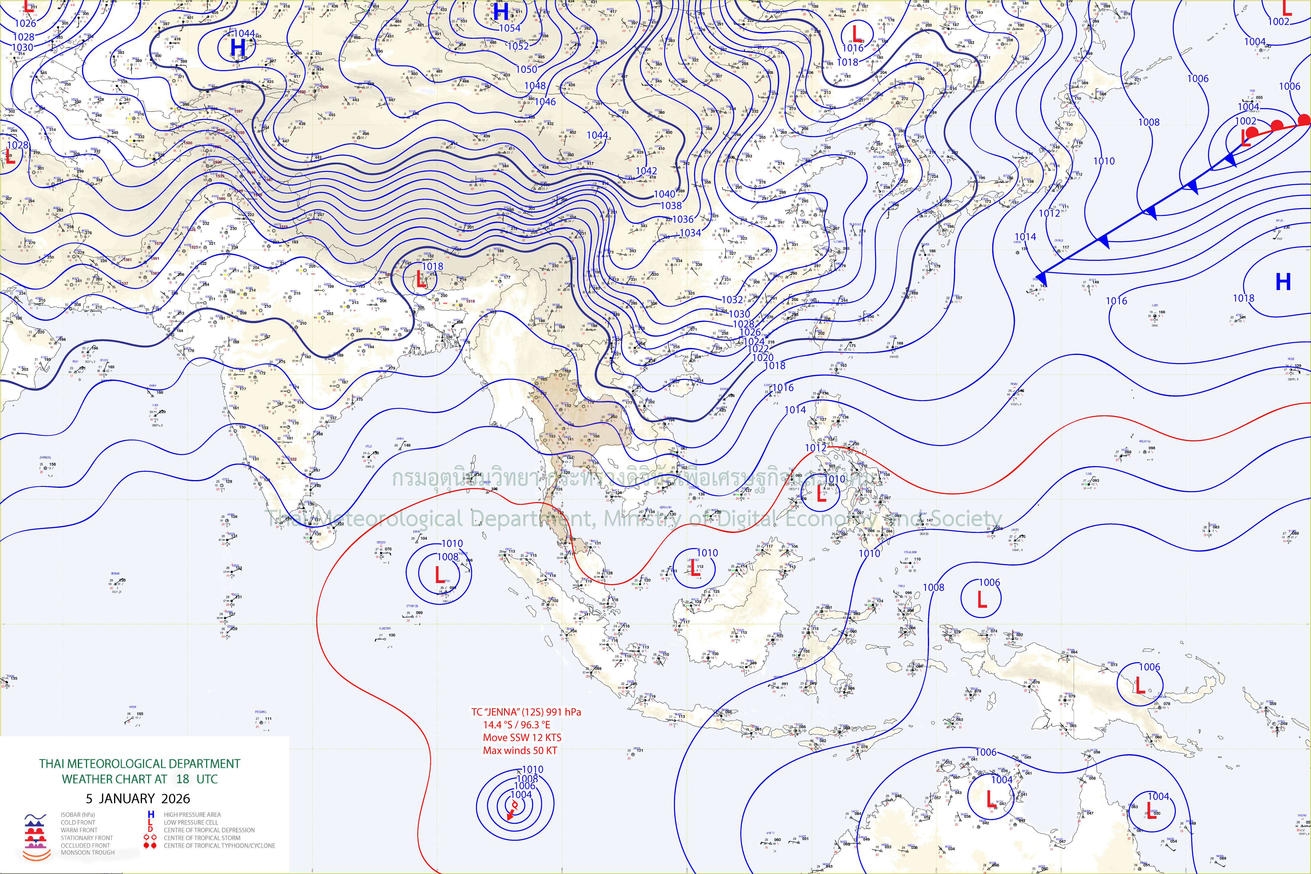 ลักษณะอากาศทั่วไป : พยากรณ์อากาศ 24 ชั่วโมงข้างหน้า ประเทศไทยตอนบนมีอากาศหนาวเย็นลง โดยภาคเหนือ ภาคตะวันออกเฉียงเหนือ และภาคกลางมีอากาศเย็นถึงหนาว ส่วน ภาคตะวันออก และภาคใต้ตอนบนมีอากาศเย็นในตอนเช้า เนื่องจากบริเวณความกดอากาศสูงหรือมวลอากาศเย็นกำลังค่อนข้างแรงอีกระลอกหนึ่งจากประเทศจีนได้แผ่ปกคลุมถึงประเทศเวียดนามตอนบนแล้ว คาดว่าจะแผ่ปกคลุมประเทศไทยตอนบนภายในวันนี้ ขอให้ประชาชนดูแลรักษาสุขภาพเนื่องจากสภาพอากาศที่หนาวเย็นลง รวมทั้งระวังอันตรายจากอัคคีภัยเนื่องจากสภาพอากาศแห้งและลมแรง