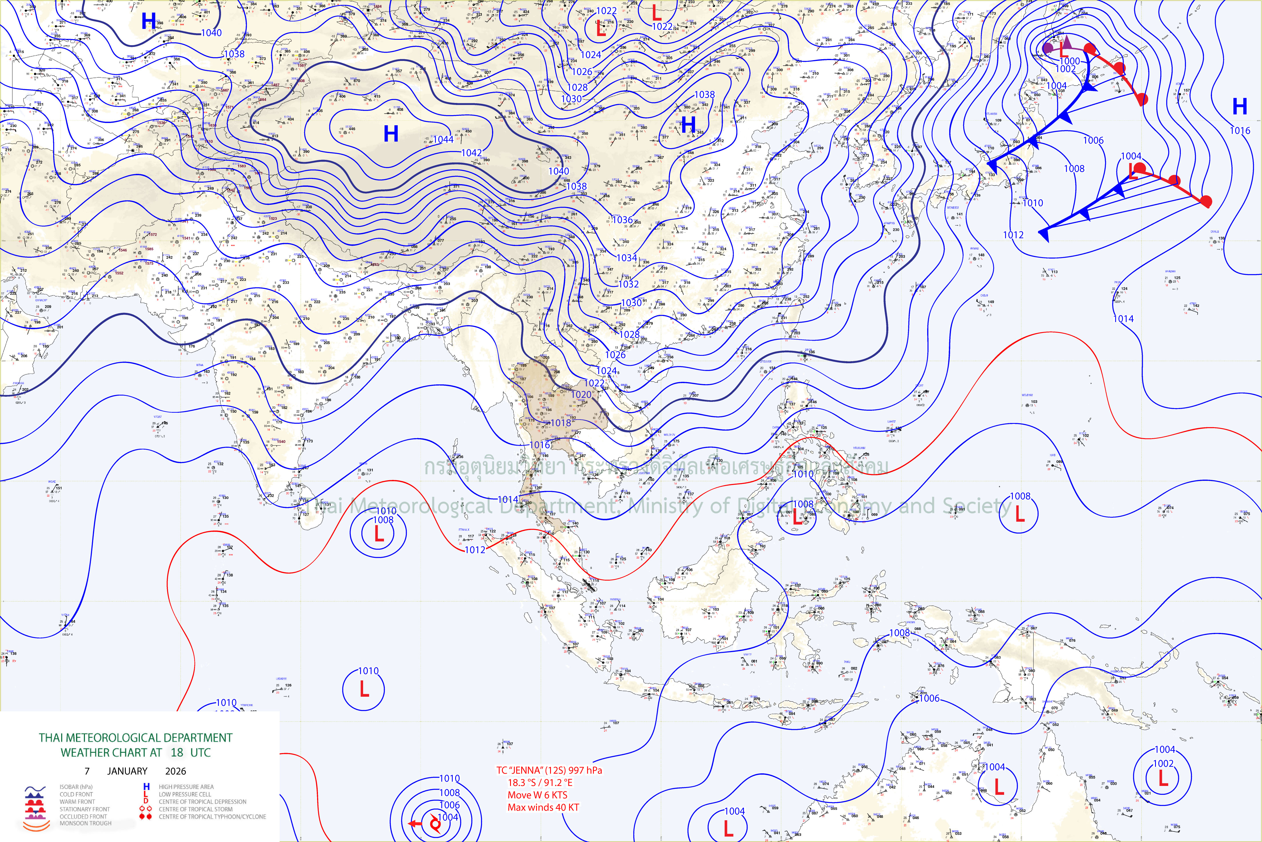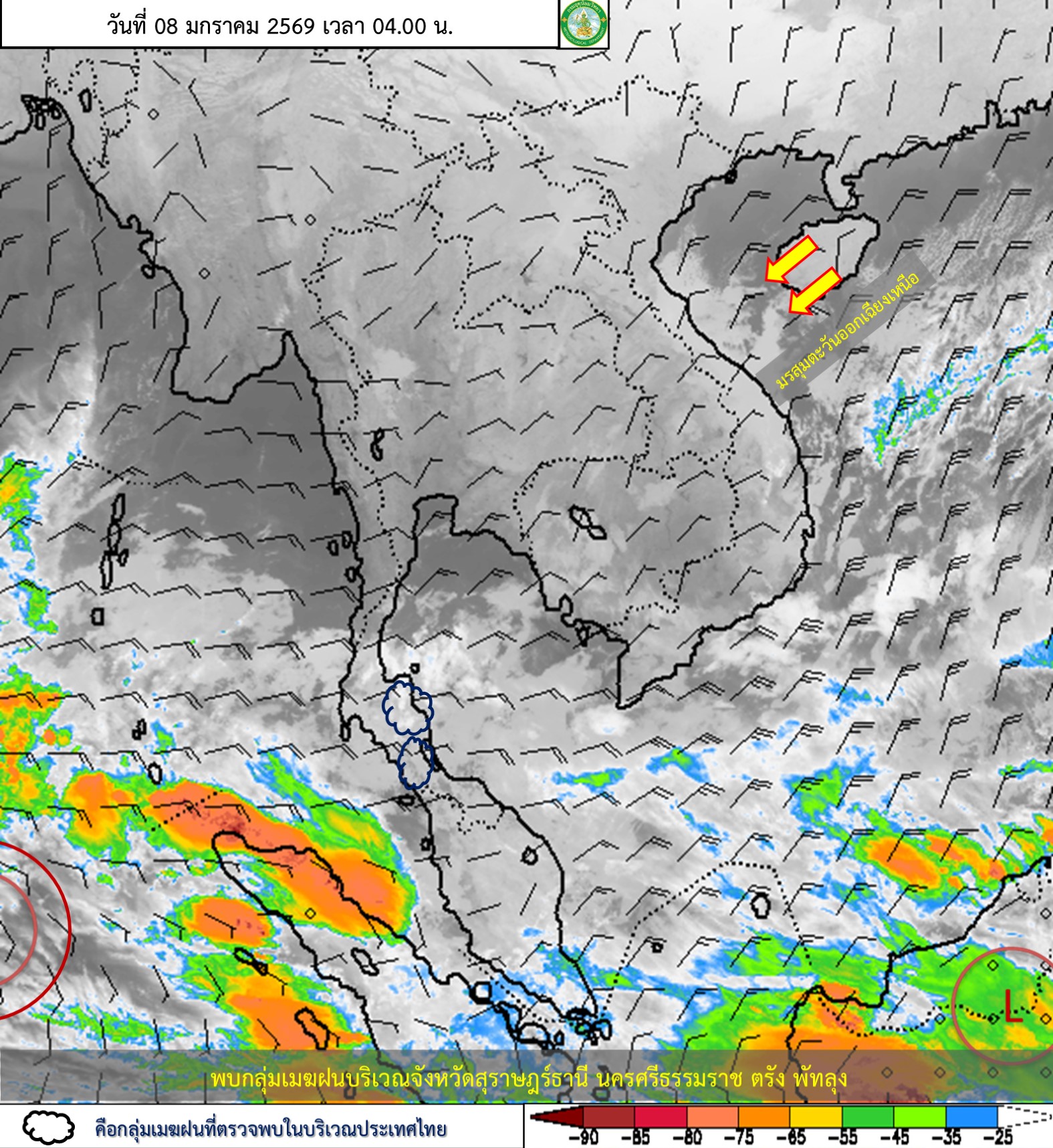 ลักษณะอากาศทั่วไป : พยากรณ์อากาศ 24 ชั่วโมงข้างหน้า ประเทศไทยตอนบนมีอากาศหนาวเย็นลง กับมีลมแรง และอุณหภูมิจะลดลงอีก 1-2 องศาเซลเซียส โดยภาคเหนือ ภาคตะวันออกเฉียงเหนือ และภาคกลางตอนบนมีอากาศเย็นถึงหนาว ส่วนภาคกลางตอนล่าง รวมทั้งกรุงเทพมหานครและปริมณฑล ภาคตะวันออก และภาคใต้ตอนบนมีอากาศเย็นในตอนเช้า เนื่องจากบริเวณความกดอากาศสูงหรือมวลอากาศเย็นกำลังแรงจากประเทศจีนปกคลุมประเทศไทยตอนบน ขอให้ประชาชนดูแลรักษาสุขภาพเนื่องจากสภาพอากาศที่หนาวเย็นลง รวมทั้งระวังอันตรายจากอัคคีภัยเนื่องจากสภาพอากาศแห้งและลมแรง สำหรับภาคใต้เริ่มมีฝนลดลง แต่ยังคงมีฝนฟ้าคะนองบริเวณภาคใต้ตอนล่าง เนื่องจากมรสุมตะวันออกเฉียงเหนือกำลังค่อนข้างแรงพัดปกคลุมอ่าวไทย และภาคใต้ ส่วนคลื่นลมบริเวณอ่าวไทยมีกำลังค่อนข้างแรง โดยมีคลื่นสูง 2-3 เมตร บริเวณที่มีฝนฟ้าคะนองคลื่นสูงมากกว่า 3 เมตร ทะเลอันดามันมีคลื่นสูง 1-2 เมตร ห่างฝั่งและบริเวณที่มีฝนฟ้าคะนองคลื่นสูงมากกว่า 2 เมตร ขอให้ชาวเรือในบริเวณดังกล่าวเดินเรือด้วยความระมัดระวัง และเรือเล็กบริเวณอ่าวไทยควรงดออกจากฝั่ง ส่วนประชาชนบริเวณชายฝั่งภาคใต้ฝั่งตะวันออกระมัดระวังอันตรายจากคลื่นที่ซัดเข้าหาฝั่งไว้ด้วย
