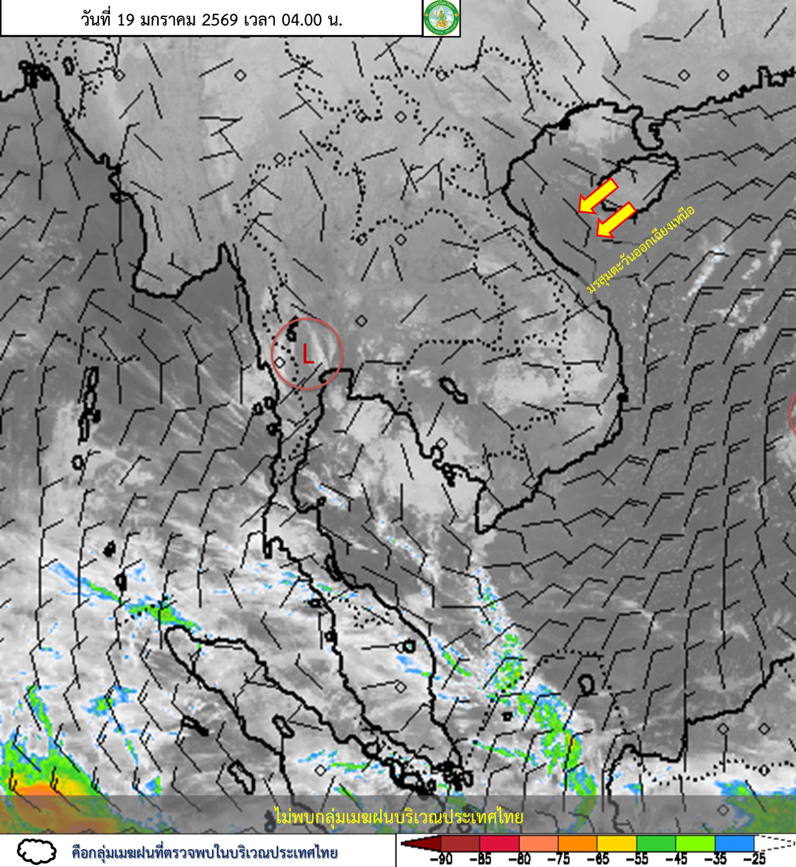 ลักษณะอากาศทั่วไป : พยากรณ์อากาศ 24 ชั่วโมงข้างหน้า ประเทศไทยตอนบนมีอากาศเย็นกับมีหมอกในตอนเช้าและมีหมอกหนาบางพื้นที่ โดยภาคเหนือและภาคตะวันออกเฉียงเหนือ ตอนบนยังคงมีอากาศเย็นถึงหนาว เนื่องจากบริเวณความกดอากาศสูงหรือมวลอากาศเย็นกำลังอ่อนปกคลุมประเทศไทยตอนบน ในขณะที่ลมฝ่ายตะวันตกจากประเทศเมียนมาเคลื่อนเข้าปกคลุมภาคเหนือตอนบนและลาวตอนบน ส่วนภาคกลางตอนล่างและภาคตะวันออกมีฝนบางแห่ง เนื่องจากมีลมตะวันออกเฉียงใต้พัดนำความชื้นเข้ามาปกคลุม ขอให้ประชาชนดูแลรักษาสุขภาพเนื่องจากสภาพอากาศที่เปลี่ยนแปลง และเพิ่มความระมัดระวังในการสัญจรผ่านบริเวณที่มีหมอก รวมทั้งระวังอันตรายจากอัคคีภัยเนื่องจากสภาพอากาศแห้งไว้ด้วย สำหรับภาคใต้มีฝนฟ้าคะนองบางแห่ง เนื่องจากมรสุมตะวันออกเฉียงเหนือกำลังอ่อนปกคลุมอ่าวไทย และภาคใต้ โดยคลื่นลมบริเวณอ่าวไทยและทะเลอันดามันมีคลื่นสูงประมาณ 1 เมตร ขอให้ชาวเรือเพิ่มความระมัดระวังในการเดินเรือไว้ด้วย