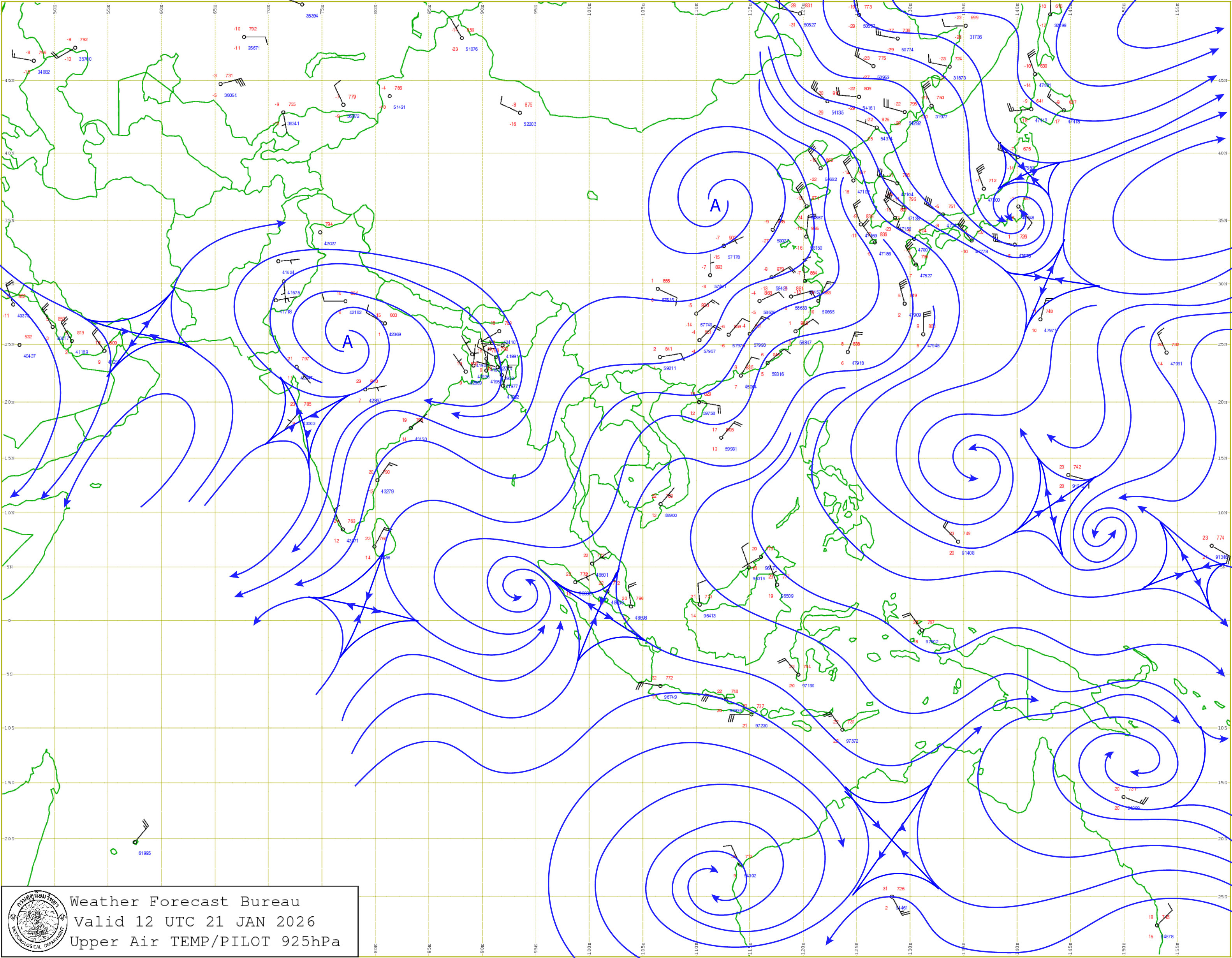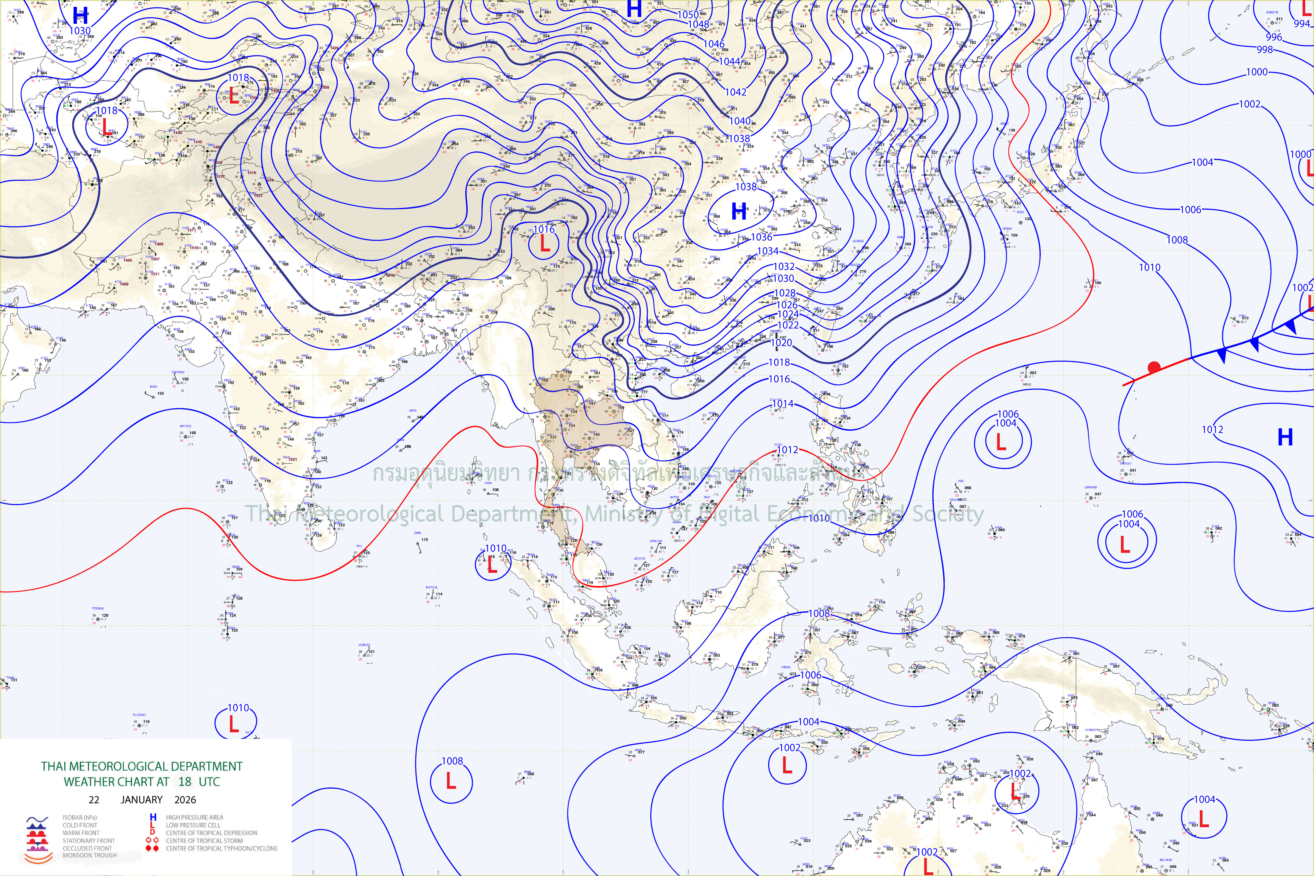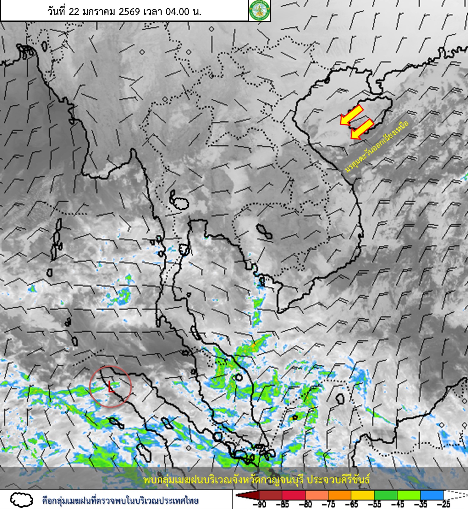 ลักษณะอากาศทั่วไป : พยากรณ์อากาศ 24 ชั่วโมงข้างหน้า ประเทศไทยตอนบน และภาคใต้ตอนบนจะมีอุณหภูมิลดลง กับมีลมแรง โดยภาคตะวันออกเฉียงเหนืออุณหภูมิจะลดลง 1-3 องศาเซลเซียส ส่วนภาคเหนือ ภาคกลาง รวมทั้งกรุงเทพมหานครและปริมณฑล ภาคตะวันออก และภาคใต้ตอนบน อุณหภูมิจะลดลง 1-2 องศาเซลเซียส เนื่องจากบริเวณความกดอากาศสูงหรือมวลอากาศเย็นกำลังปานกลางระลอกใหม่จากประเทศจีนได้แผ่ปกคลุมประเทศไทยตอนบนแล้ว ในขณะที่ภาคกลางตอนล่างมีฝนบางแห่ง เนื่องจากมีลมตะวันออกพัดปกคลุมในบริเวณดังกล่าว ขอให้ประชาชนดูแลรักษาสุขภาพเนื่องจากสภาพอากาศที่เปลี่ยนแปลง