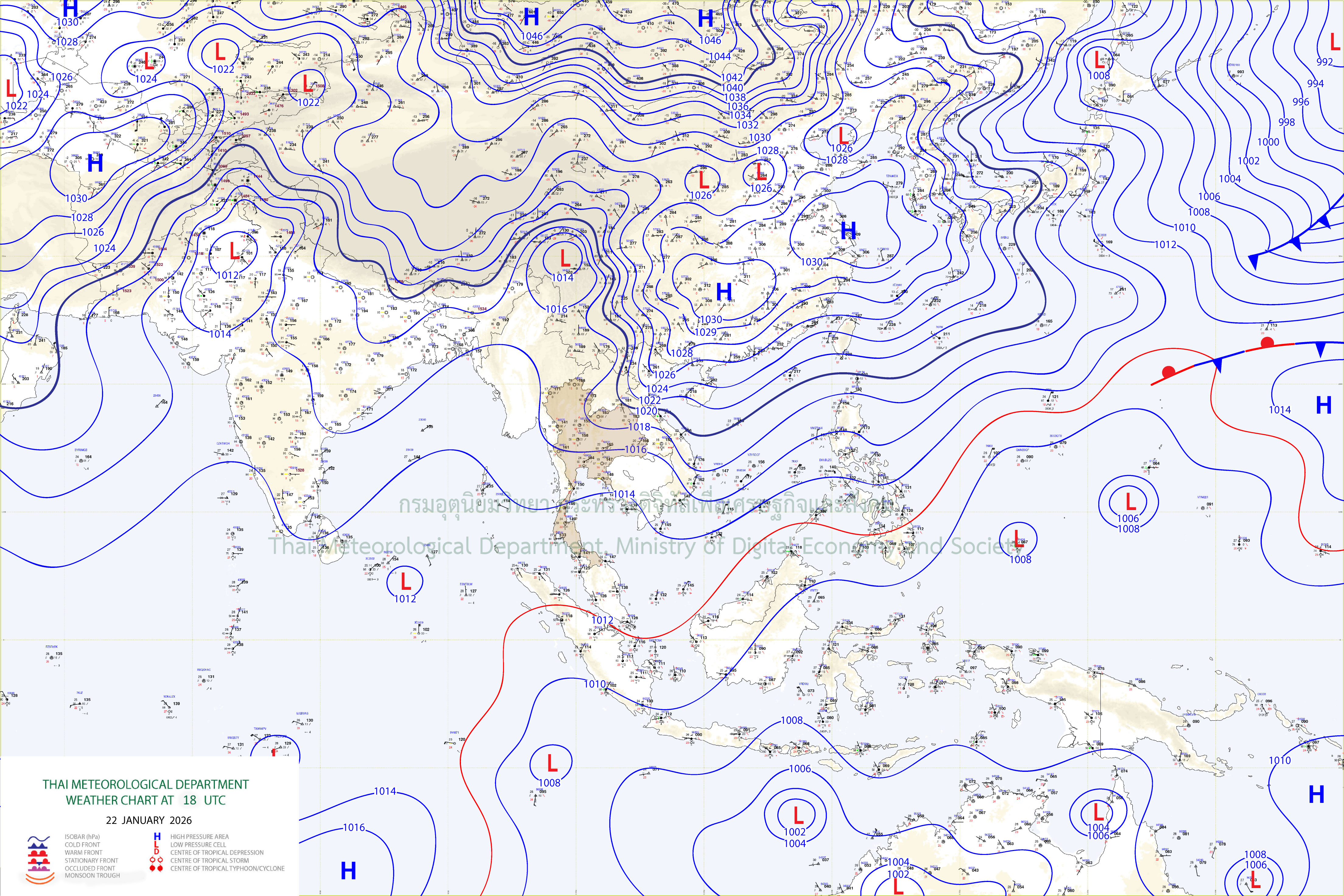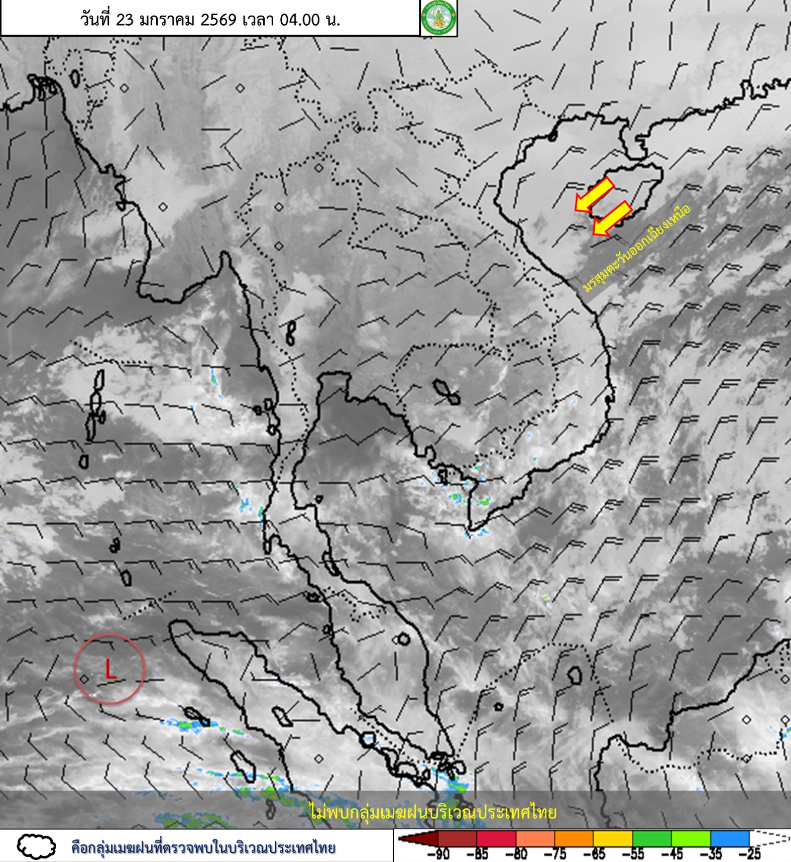 ลักษณะอากาศทั่วไป : พยากรณ์อากาศ 24 ชั่วโมงข้างหน้า ประเทศไทยตอนบน และภาคใต้ตอนบนจะมีอุณหภูมิลดลง กับมีลมแรง โดยจะมีอุณหภูมิลดลงอีก 1 - 2 องศาเซลเซียส เนื่องจากบริเวณความกดอากาศสูงหรือมวลอากาศเย็นกำลังปานกลางระลอกใหม่จากประเทศจีนได้แผ่ปกคลุมประเทศไทยตอนบน ขอให้ประชาชนดูแลรักษาสุขภาพเนื่องจากสภาพอากาศที่เปลี่ยนแปลงและหนาวเย็นลงไว้ด้วย สำหรับภาคใต้มีฝนฟ้าคะนองบางแห่ง เนื่องจากมรสุมตะวันออกเฉียงเหนือกำลังปานกลางพัดปกคลุมอ่าวไทย ภาคใต้ และทะเลอันดามัน ส่วนคลื่นลมบริเวณ อ่าวไทยและทะเลอันดามันมีกำลังปานกลาง โดยอ่าวไทยตอนล่างมีคลื่นสูงประมาณ 2 เมตร อ่าวไทยตอนบนและห่างฝั่งทะเลอันดามันมีคลื่นสูง 1-2 เมตร บริเวณที่มีฝนฟ้าคะนองคลื่นสูงมากกว่า 2 เมตร ขอให้ชาวเรือเดินเรือด้วยความระมัดระวังและหลีกเลี่ยงการเดินเรือในบริเวณที่มีฝนฟ้าคะนองไว้ด้วย
