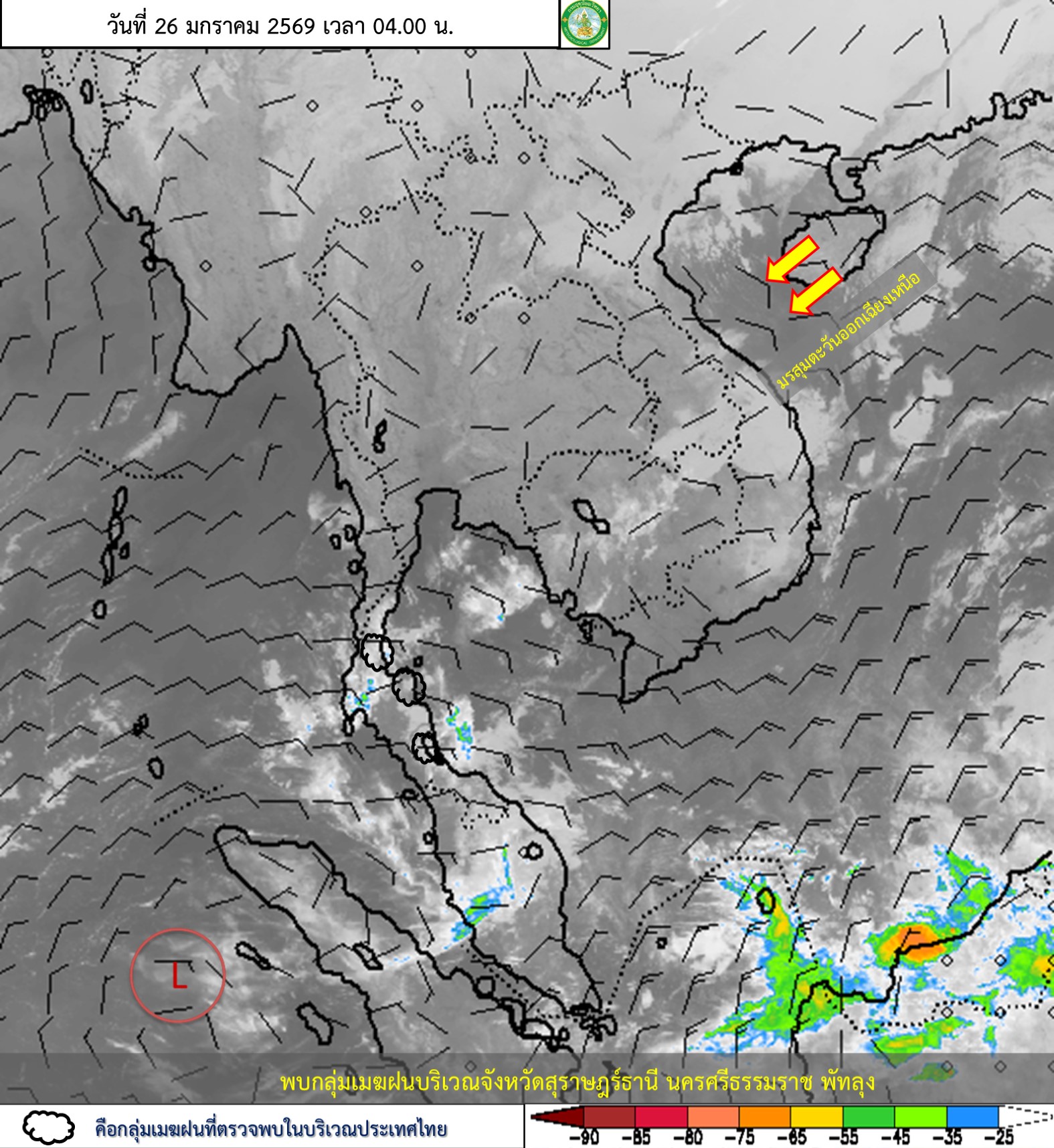 ลักษณะอากาศทั่วไป : พยากรณ์อากาศ 24 ชั่วโมงข้างหน้า ประเทศไทยตอนบนและภาคใต้ตอนบนมีอุณหภูมิสูงขึ้น 1-2 องศาเซลเซียส กับมีหมอกบางในตอนเช้า แต่ยังคงมีอากาศเย็นถึงหนาวในภาคเหนือ และภาคตะวันออกเฉียงเหนือ ส่วนภาคกลาง รวมทั้งกรุงเทพมหานครและปริมณฑล ภาคตะวันออก และภาคใต้ตอนบน มีอากาศเย็นในตอนเช้า เนื่องจากบริเวณความกดอากาศสูงหรือมวลอากาศเย็นกำลังค่อนข้างแรงที่ปกคลุมประเทศไทยตอนบนและภาคใต้ตอนบนมีกำลังอ่อนลง ขอให้ประชาชนดูแลรักษาสุขภาพเนื่องจากสภาพอากาศที่ยังคงหนาวเย็น รวมทั้งเพิ่มความระมัดระวังในการสัญจรผ่านบริเวณที่มีหมอกไว้ด้วย
