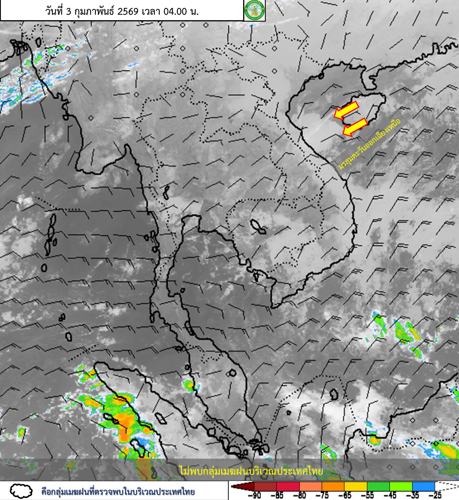 ลักษณะอากาศทั่วไป : พยากรณ์อากาศ 24 ชั่วโมงข้างหน้า บริเวณความกดอากาศสูงหรือมวลอากาศเย็นกำลังปานกลางจากประเทศจีนแผ่ปกคลุมประเทศไทยตอนบน ลักษณะเช่นนี้ ทำให้ภาคเหนือและภาคตะวันออกเฉียงเหนือ มีอากาศเย็นถึงหนาว ส่วนภาคกลางและภาคตะวันออก มีอากาศเย็นในตอนเช้า ขอให้ประชาชนดูแลรักษาสุขภาพเนื่องจากสภาพอากาศที่หนาวเย็น
