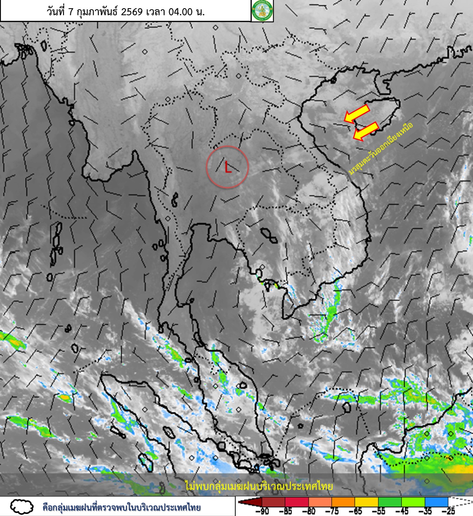 ลักษณะอากาศทั่วไป : พยากรณ์อากาศ 24 ชั่วโมงข้างหน้า บริเวณความกดอากาศสูงหรือมวลอากาศเย็นกำลังปานกลางถึงค่อนข้างแรงระลอกใหม่จากประเทศจีนได้แผ่ลงมาปกคลุมประเทศจีนตอนใต้ และประเทศเวียดนามตอนบนแล้ว คาดว่าจะแผ่ลงมาปกคลุมประเทศลาวตอนบน ภาคตะวันออกเฉียงเหนือตอนบน และทะเลจีนใต้ในคืนวันนี้ (7 ก.พ. 2569) ลักษณะเช่นนี้ทำให้ภาคตะวันออกเฉียงเหนือมีลมแรง และทำให้มีลมใต้และลมตะวันออกเฉียงใต้ที่พัดนำความชื้นจากทะเลจีนใต้และอ่าวไทยเข้ามาปกคลุมภาคกลาง รวมทั้งกรุงเทพมหานครและปริมณฑล และภาคตะวันออก ทำให้บริเวณดังกล่าวมีฝนฟ้าคะนองบางแห่งเกิดขึ้นได้