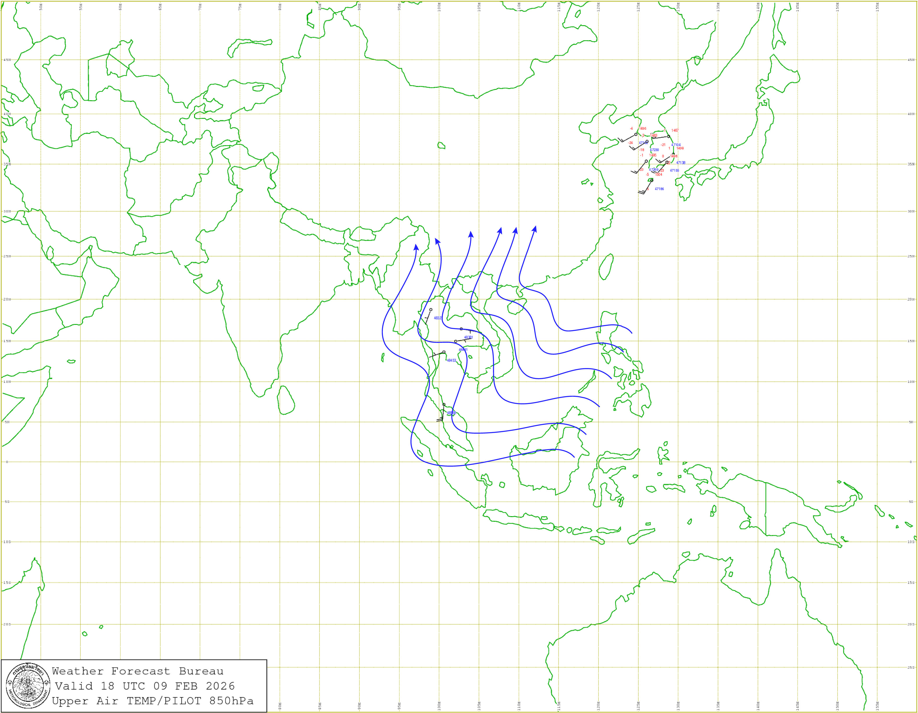 กรุงเทพมหานครและปริมณฑล : เมฆบางส่วน อุณหภูมิต่ำสุด 22-24 องศาเซลเซียส อุณหภูมิสูงสุด 33-35 องศาเซลเซียส ลมตะวันออกเฉียงเหนือ ความเร็ว 10-20 กม./ชม.