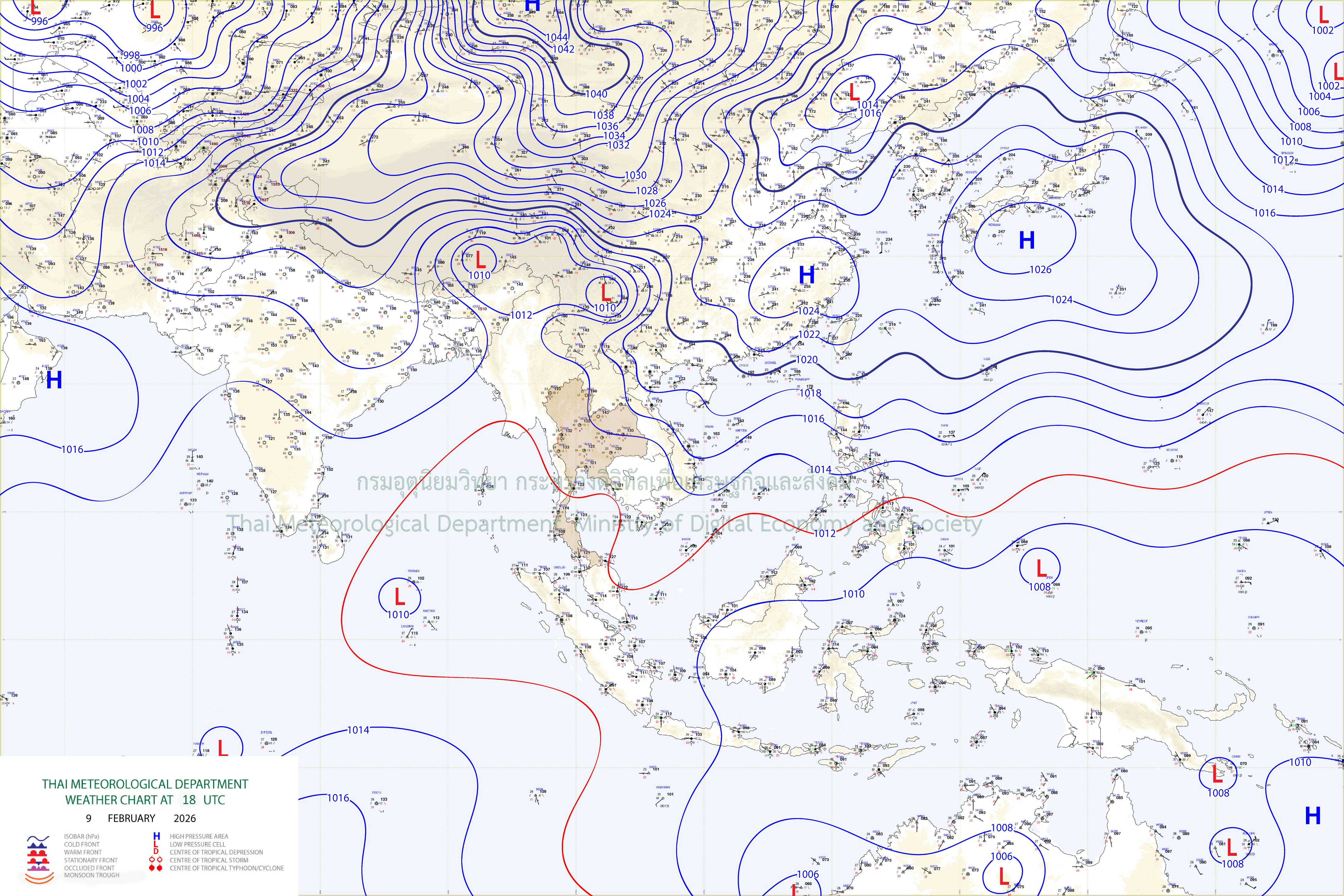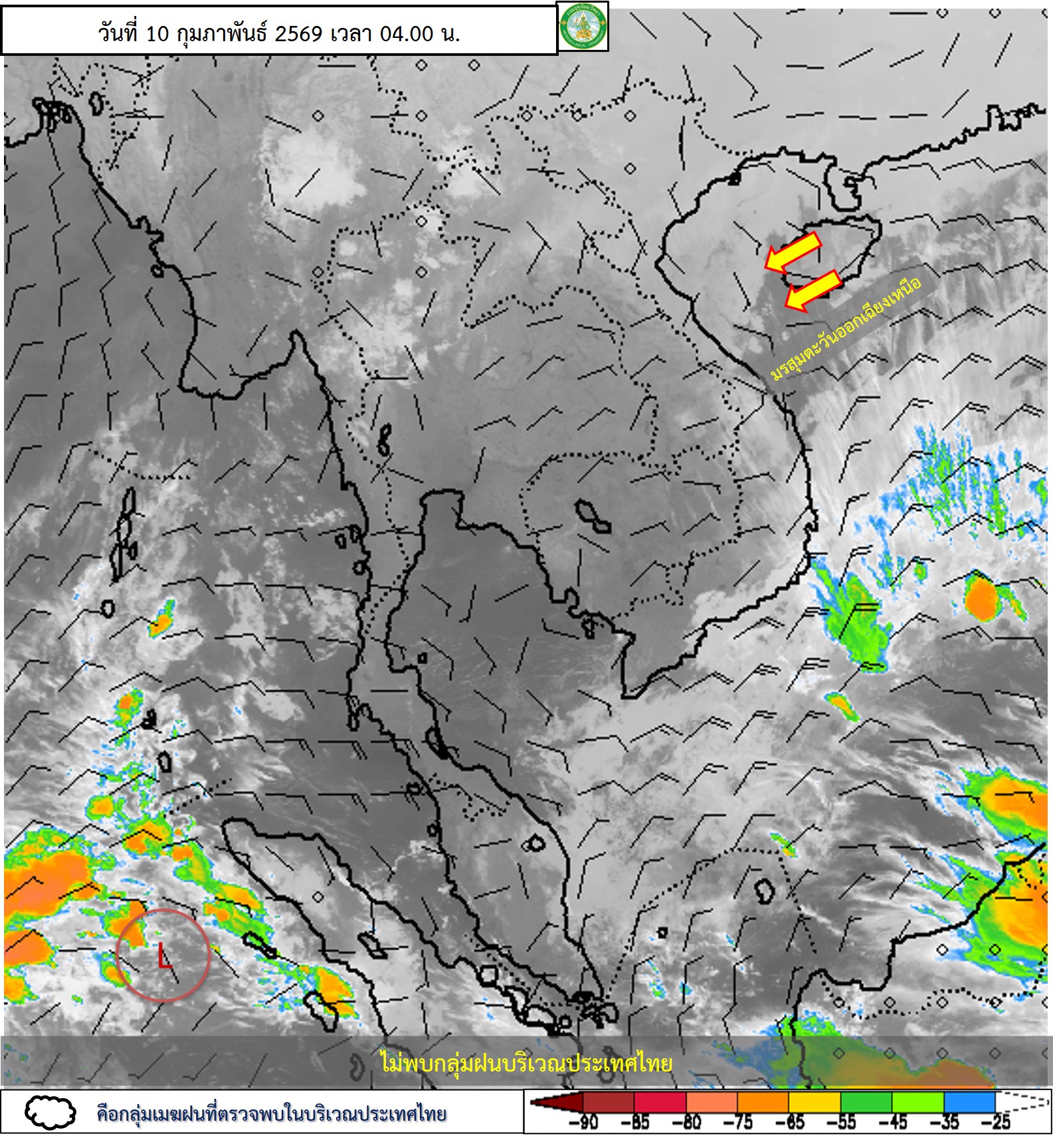 ลักษณะอากาศทั่วไป : พยากรณ์อากาศ 24 ชั่วโมงข้างหน้า ประเทศไทยตอนบนยังคงมีอากาศเย็นในตอนเช้า โดยมีฝนเล็กน้อยบางแห่งในภาคเหนือ เนื่องจากบริเวณความกดอากาศสูงหรือมวลอากาศเย็นกำลังปานกลางถึงค่อนข้างแรงจากประเทศจีนปกคลุมประเทศไทยตอนบน และทะเลจีนใต้ ในขณะที่มีลมตะวันออกเฉียงใต้พัดปกคลุมภาคเหนือ ขอให้ประชาชนบริเวณประเทศไทยตอนบนดูแลรักษาสุขภาพเนื่องจากสภาพอากาศที่เปลี่ยนแปลง ส่วนเกษตรกรในภาคเหนือควรเตรียมการป้องกันและระวังความเสียหายที่จะเกิดต่อผลผลิตทางการเกษตร เนื่องจากยังคงมีฝนในบางพื้นที่ สำหรับภาคใต้มีฝนฟ้าคะนองบางแห่ง เนื่องจากมรสุมตะวันออกเฉียงเหนือกำลังปานกลางพัดปกคลุมอ่าวไทย ภาคใต้ และทะเลอันดามัน ส่วนคลื่นลมบริเวณอ่าวไทยและห่างฝั่งทะเลอันดามันมีกำลังปานกลาง โดยอ่าวไทยตอนล่างมีคลื่นสูงประมาณ 2 เมตร อ่าวไทยตอนบนและห่างฝั่งทะเลอันดามันมีคลื่นสูง 1-2 เมตร บริเวณที่มีฝนฟ้าคะนองคลื่นสูงมากกว่า 2 เมตร ขอให้ชาวเรือบริเวณอ่าวไทยและทะเลอันดามันเดินเรือด้วยความระมัดระวัง และหลีกเลี่ยงการเดินเรือในบริเวณที่มีฝนฟ้าคะนองไว้ด้วย