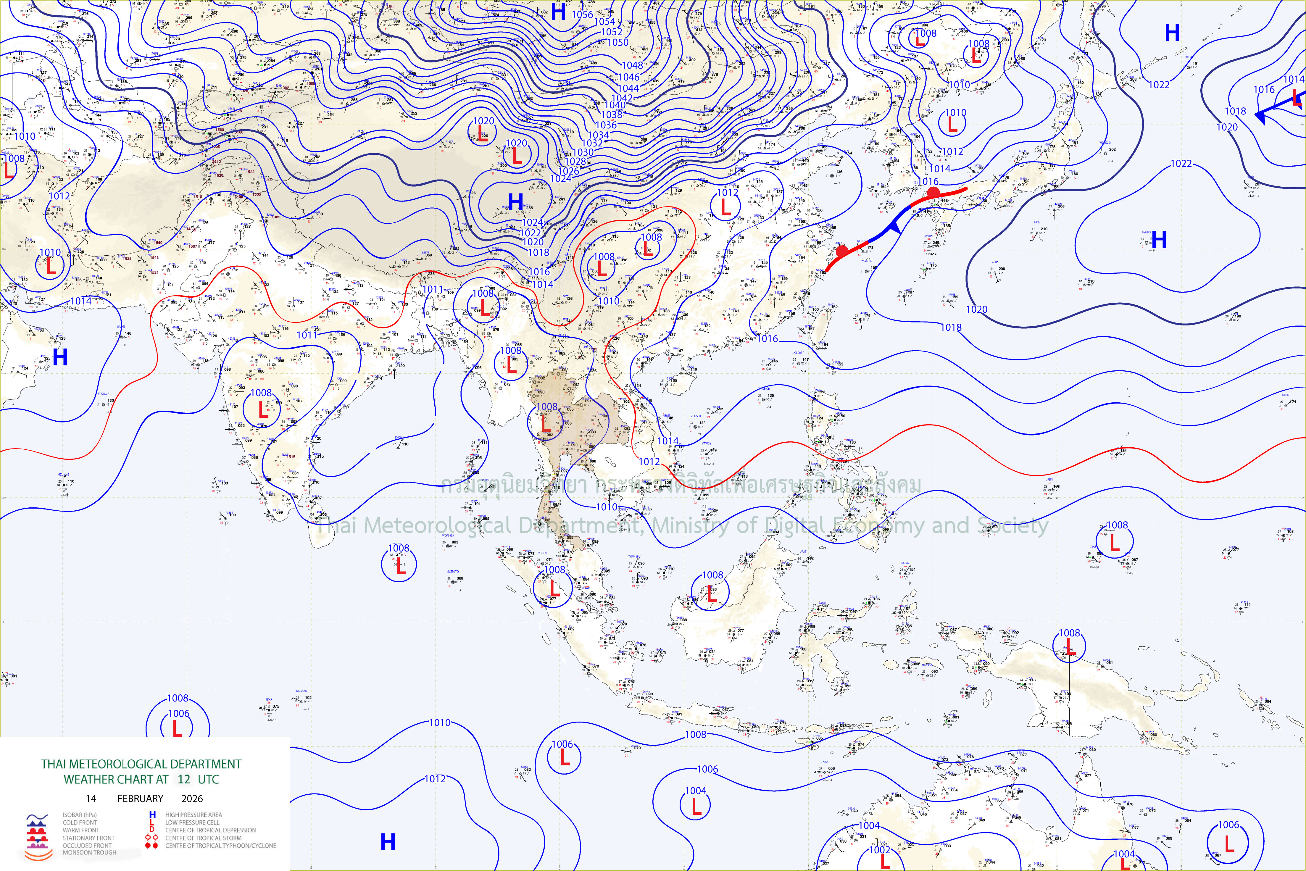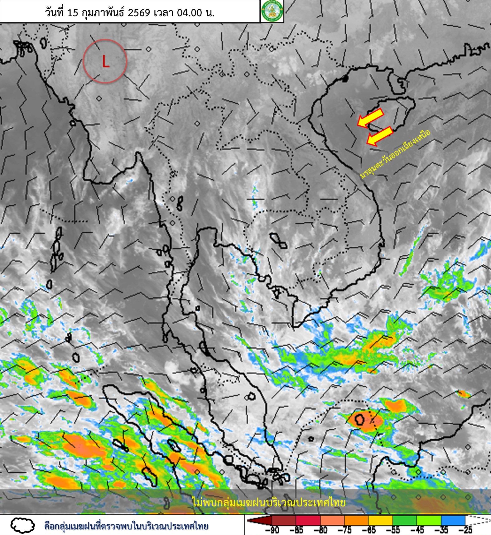 ลักษณะอากาศทั่วไป : พยากรณ์อากาศ 24 ชั่วโมงข้างหน้า ภาคเหนือและภาคตะวันออกเฉียงเหนือยังคงมีอากาศเย็นกับมีหมอกในตอนเช้า ส่วนภาคตะวันออก และภาคกลาง รวมทั้งกรุงเทพมหานครและปริมณฑลมีฝนฟ้าคะนองบางแห่ง เนื่องจากบริเวณความกดอากาศสูงหรือมวลอากาศเย็นกำลังอ่อนปกคลุมประเทศไทยตอนบน และทะเลจีนใต้ ส่งผลทำให้มีลมตะวันออกเฉียงใต้พัดนำความชื้นจากอ่าวไทยเข้ามาปกคลุมภาคตะวันออก และภาคกลาง รวมทั้งกรุงเทพมหานครและปริมณฑล ขอให้ประชาชนบริเวณประเทศไทยตอนบนดูแลรักษาสุขภาพเนื่องจากสภาพอากาศที่เปลี่ยนแปลง รวมทั้งเพิ่มความระมัดระวังในการสัญจรผ่านบริเวณที่มีหมอกไว้ด้วย