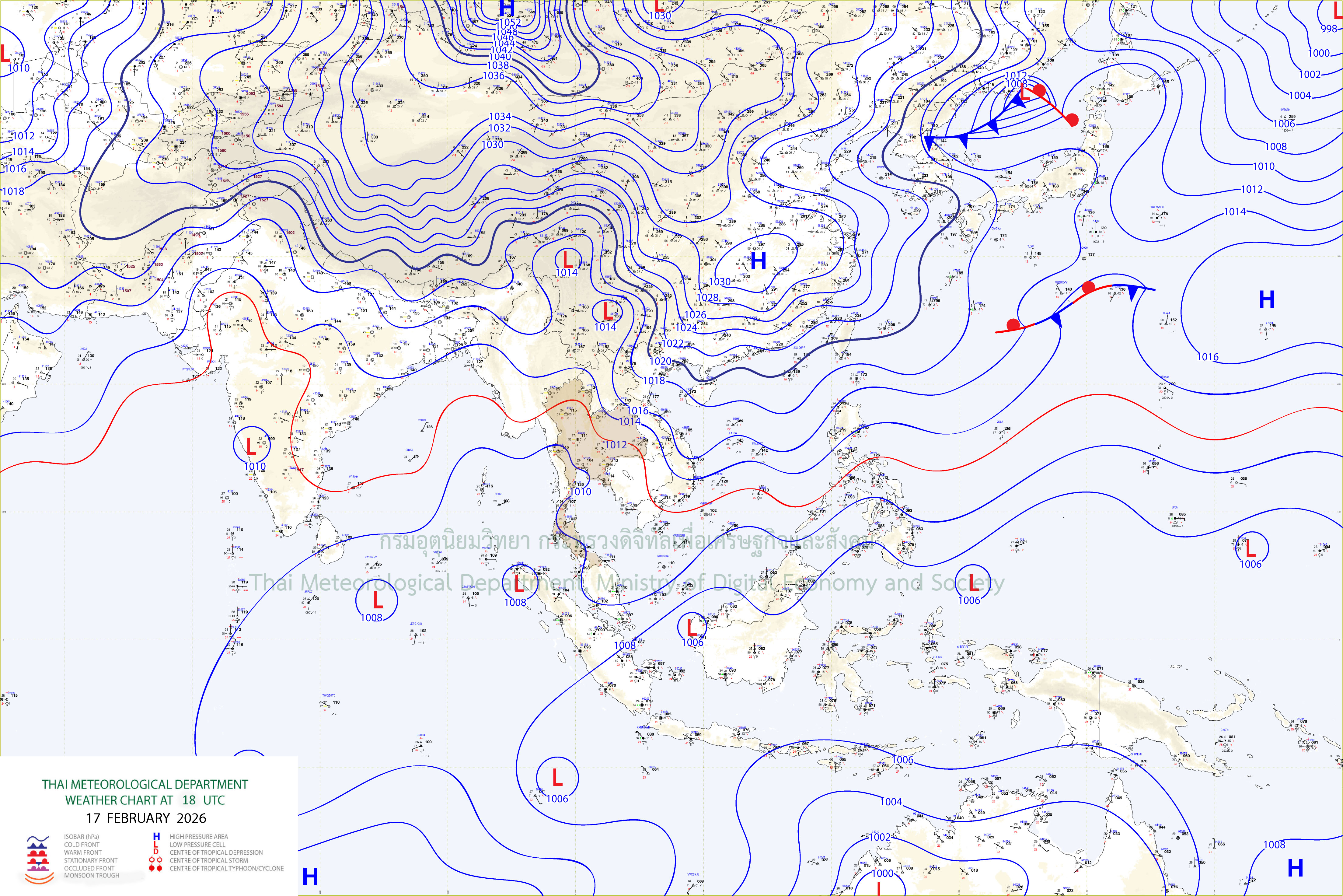 ลักษณะอากาศทั่วไป : พยากรณ์อากาศ 24 ชั่วโมงข้างหน้า ประเทศไทยตอนบนมีฝนฟ้าคะนองบางแห่ง เนื่องจากบริเวณความกดอากาศสูงหรือมวลอากาศเย็นกำลังปานกลางจากประเทศจีนปกคลุมภาคตะวันออกเฉียงเหนือ และทะเลจีนใต้ ส่งผลทำให้มีลมตะวันออกและลมตะวันออกเฉียงใต้พัดนำความชื้นจากอ่าวไทยเข้ามาปกคลุมประเทศไทยตอนบน ขอให้ประชาชนในบริเวณดังกล่าวดูแลรักษาสุขภาพเนื่องจากสภาพอากาศที่เปลี่ยนแปลง และระวังอันตรายจากฝนฟ้าคะนองที่อาจจะเกิดขึ้นในระยะนี้ไว้ด้วย สำหรับภาคใต้มีฝนฟ้าคะนองบางแห่ง เนื่องจากลมตะวันออกและลมตะวันออกเฉียงใต้พัดปกคลุมอ่าวไทย ภาคใต้ และทะเลอันดามัน ส่วนคลื่นลมบริเวณอ่าวไทยตอนล่างและห่างฝั่งทะเลอันดามันมีกำลังปานกลาง โดยมีคลื่นสูง 1–2 เมตร บริเวณที่มีฝนฟ้าคะนองคลื่นสูงมากกว่า 2 เมตร ขอให้ชาวเรือบริเวณอ่าวไทยและทะเลอันดามันเดินเรือด้วยความระมัดระวัง และหลีกเลี่ยงการเดินเรือในบริเวณที่มีฝนฟ้าคะนองไว้ด้วย