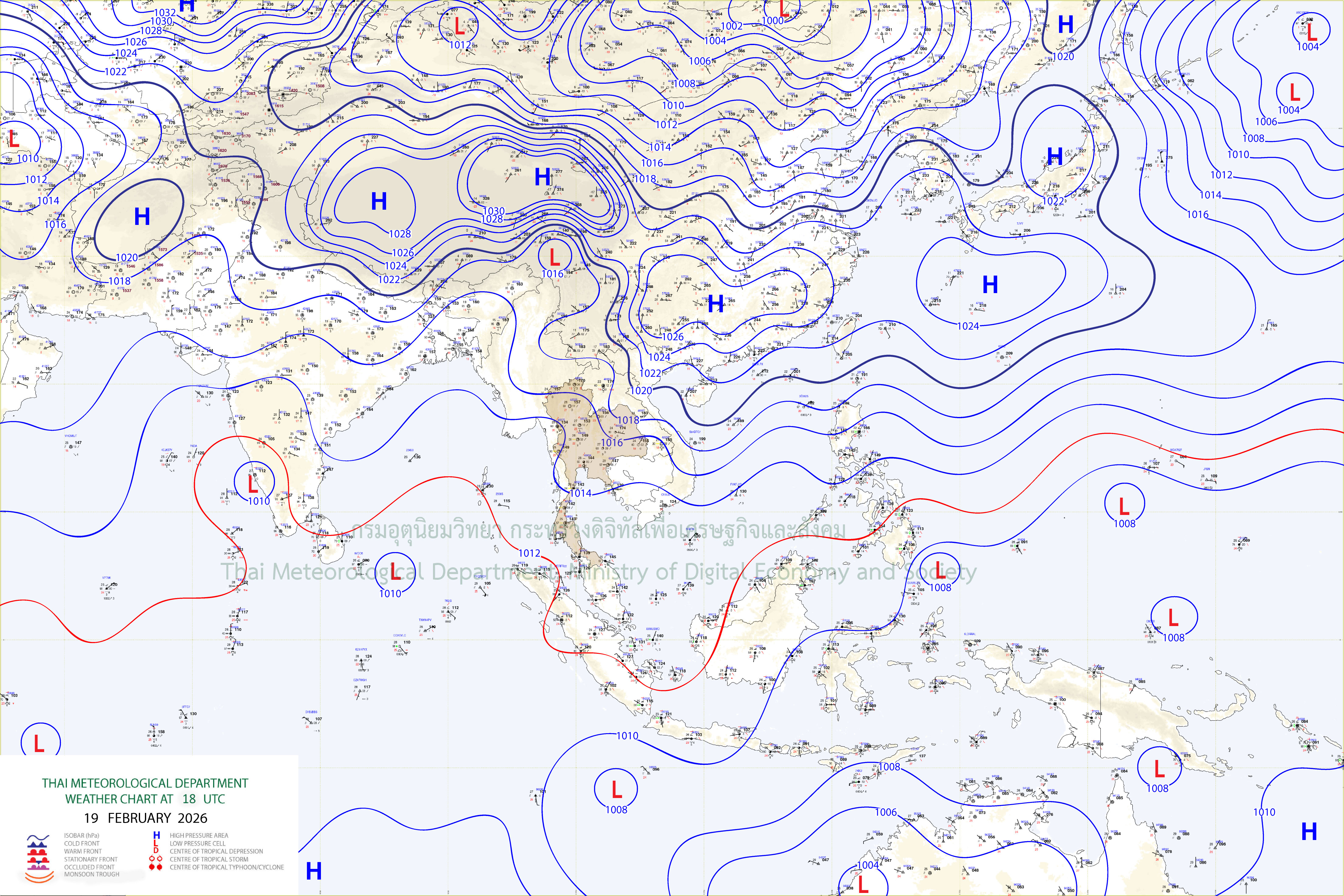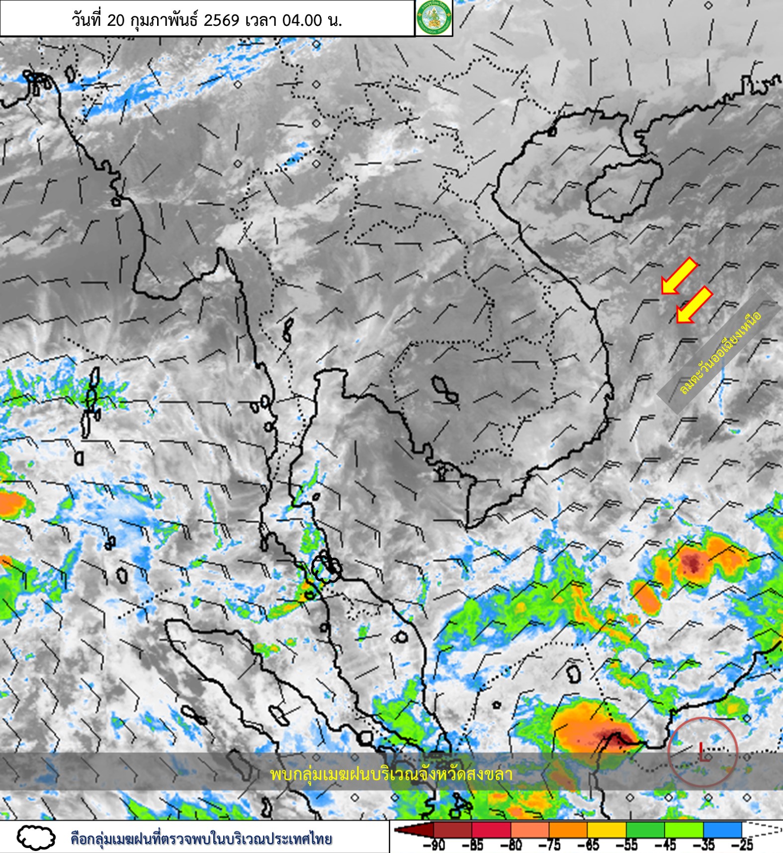 ลักษณะอากาศทั่วไป : พยากรณ์อากาศ 24 ชั่วโมงข้างหน้า ภาคเหนือมีฝนฟ้าคะนองบางแห่ง เนื่องจากมีแนวพัดสอบของลมตะวันออกเฉียงใต้และลมตะวันตกเฉียงใต้ปกคลุมบริเวณภาคเหนือตอนบน ในขณะที่บริเวณความกดอากาศสูงหรือมวลอากาศเย็นกำลังปานกลางปกคลุมภาคตะวันออกเฉียงเหนือ ทำให้ภาคตะวันออกเฉียงเหนือมีอากาศเย็นในตอนเช้า ส่วนภาคตะวันออก มีฝนฟ้าคะนองบางพื้นที่ เนื่องจากมีลมตะวันออกเฉียงใต้พัดปกคลุมบริเวณอ่าวไทย ขอให้ประชาชนในบริเวณภาคเหนือระวังอันตรายจากฝนฟ้าคะนองที่จะเกิดขึ้นในระยะนี้ ส่วนประชาชนบริเวณประเทศไทยตอนบนดูแลรักษาสุขภาพเนื่องจากสภาพอากาศที่เปลี่ยนแปลง สำหรับภาคใต้มีฝนฟ้าคะนองบางแห่ง เนื่องจากลมตะวันออกและลมตะวันออกเฉียงใต้พัดปกคลุมอ่าวไทย ภาคใต้ และทะเลอันดามัน ส่วนคลื่นลมบริเวณอ่าวไทยตอนล่างมีกำลังปานกลาง โดยมีคลื่นสูงประมาณ 2 เมตร บริเวณที่มีฝนฟ้าคะนองคลื่นสูงมากกว่า 2 เมตร ขอให้ชาวเรือบริเวณอ่าวไทยและทะเลอันดามันเดินเรือด้วยความระมัดระวัง และหลีกเลี่ยงการเดินเรือในบริเวณที่มีฝนฟ้าคะนองไว้ด้วย อนึ่ง ในช่วงวันที่ 23 – 25 ก.พ. 69 ประเทศไทยตอนบนมีพายุฤดูร้อนเกิดขึ้น โดยมีลักษณะของพายุฝนฟ้าคะนอง ลมกระโชกแรง ฟ้าผ่า รวมถึงลูกเห็บตกบางแห่ง เนื่องจากคลื่นกระแสลมฝ่ายตะวันตกเคลื่อนผ่านภาคเหนือและภาคตะวันออกเฉียงเหนือ ในขณะที่ประเทศไทยมีอากาศร้อน