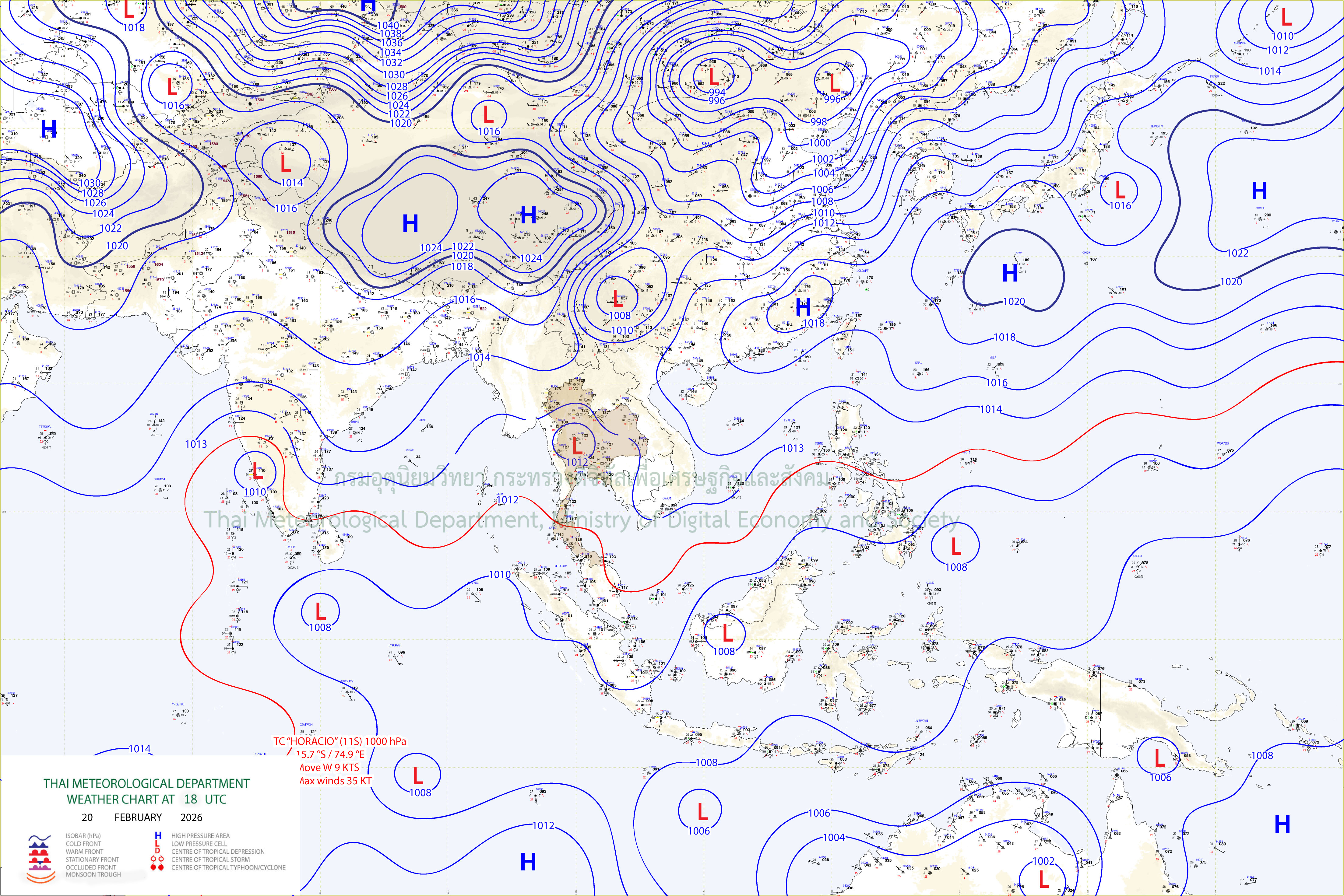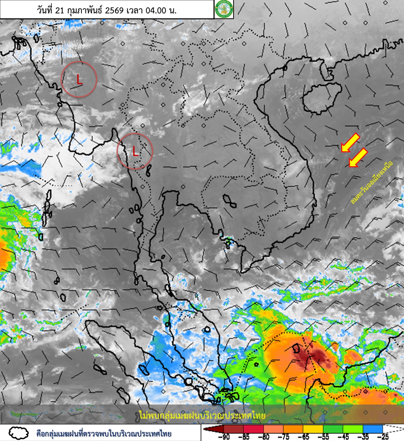 ลักษณะอากาศทั่วไป : พยากรณ์อากาศ 24 ชั่วโมงข้างหน้า ภาคเหนือมีฝนฟ้าคะนอง และมีลมกระโชกแรงบางแห่ง เนื่องจากมีแนวพัดสอบของลมตะวันออกเฉียงใต้และลมตะวันตกเฉียงใต้ปกคลุมบริเวณภาคเหนือตอนบน ในขณะที่บริเวณความกดอากาศสูงหรือมวลอากาศเย็นกำลังปานกลางปกคลุมภาคตะวันออกเฉียงเหนือ ทำให้ภาคตะวันออกเฉียงเหนือมีอากาศเย็นในตอนเช้า ส่วนภาคตะวันออก มีฝนบางพื้นที่ เนื่องจากมีลมตะวันออกพัดปกคลุมบริเวณอ่าวไทย ขอให้ประชาชนในบริเวณภาคเหนือระวังอันตรายจากฝนฟ้าคะนองที่จะเกิดขึ้นในระยะนี้ ส่วนประชาชนบริเวณประเทศไทยตอนบนดูแลรักษาสุขภาพเนื่องจากสภาพอากาศที่เปลี่ยนแปลง สำหรับภาคใต้มีฝนฟ้าคะนองบางแห่ง เนื่องจากลมตะวันออกและลมตะวันออกเฉียงใต้พัดปกคลุมอ่าวไทย ภาคใต้ และทะเลอันดามัน ส่วนคลื่นลมบริเวณอ่าวไทยตอนล่างมีกำลังปานกลาง โดยมีคลื่นสูงประมาณ 2 เมตร บริเวณที่มีฝนฟ้าคะนองคลื่นสูงมากกว่า 2 เมตร ขอให้ชาวเรือบริเวณอ่าวไทยและทะเลอันดามันเดินเรือด้วยความระมัดระวัง และหลีกเลี่ยงการเดินเรือในบริเวณที่มีฝนฟ้าคะนองไว้ด้วย อนึ่ง ในช่วงวันที่ 23–25 ก.พ. 69 ประเทศไทยตอนบนมีพายุฤดูร้อนเกิดขึ้น โดยมีลักษณะของพายุฝนฟ้าคะนอง ลมกระโชกแรง ฟ้าผ่า รวมถึงลูกเห็บตกบางแห่ง เนื่องจากคลื่นกระแสลมฝ่ายตะวันตกเคลื่อนผ่านภาคเหนือและภาคตะวันออกเฉียงเหนือ ในขณะที่ประเทศไทยมีอากาศร้อน