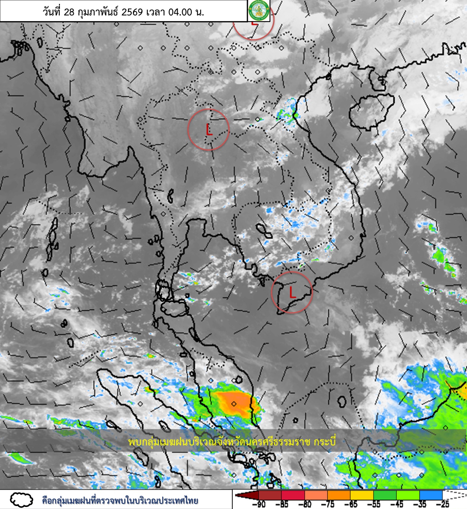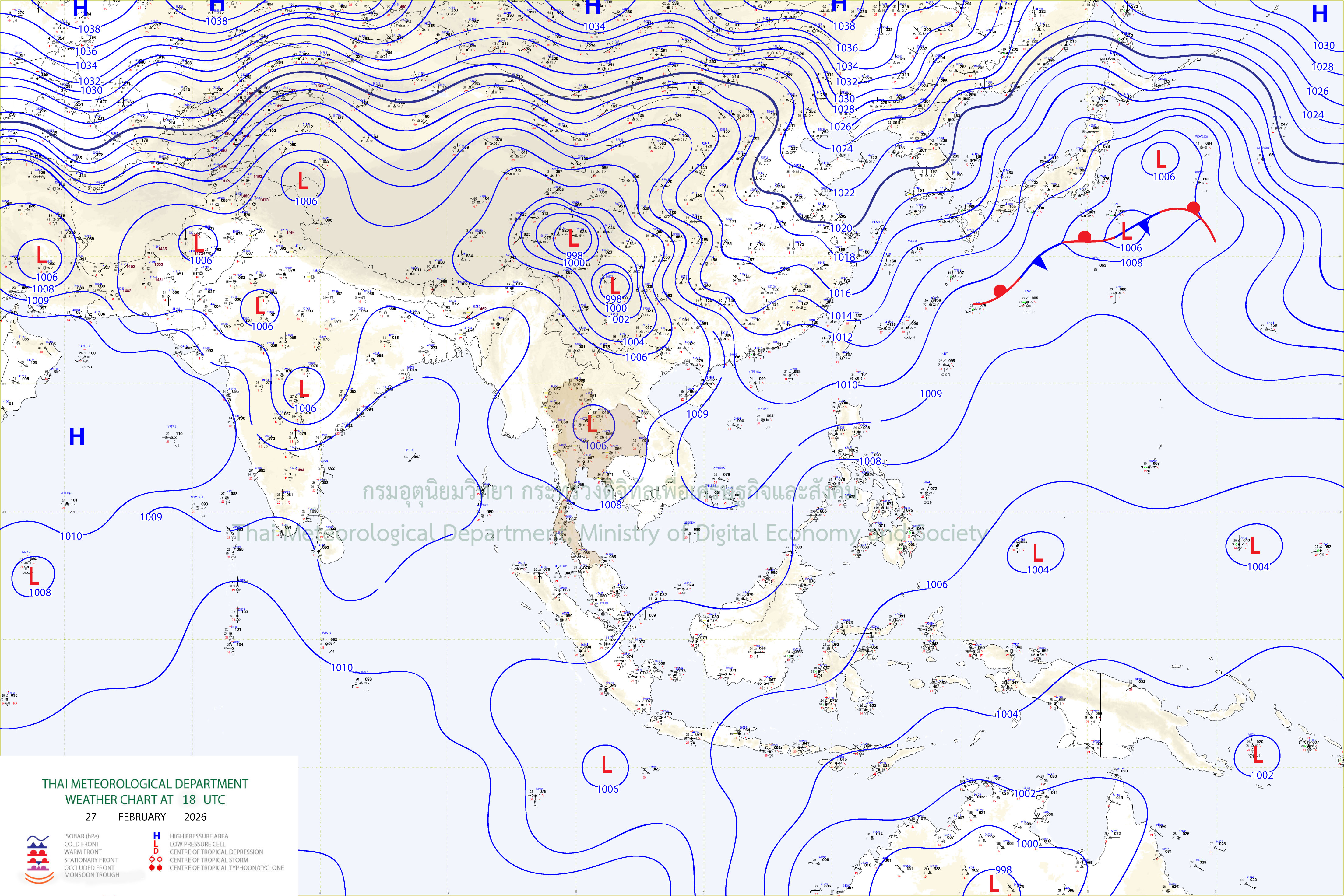 ลักษณะอากาศทั่วไป : พยากรณ์อากาศ 24 ชั่วโมงข้างหน้า ประเทศไทยตอนบนจะมีฝนลดลงกับมีอากาศร้อนขึ้นในตอนกลางวัน แต่ยังมีฝนฟ้าคะนองและลมกระโชกแรงเกิดขึ้นได้บางพื้นที่ บริเวณภาคกลางตอนล่าง รวมทั้งกรุงเทพมหานคร ภาคตะวันออก และภาคตะวันออกเฉียงเหนือ เนื่องจากมีลมตะวันตกเฉียงใต้พัดนำความชื้นเข้ามาปกคลุมบริเวณดังกล่าว ในขณะที่มีความกดอากาศต่ำเนื่องจากความร้อนปกคลุมประเทศไทยตอนบน ขอให้ประชาชนบริเวณดังกล่าวระวังอันตรายจากฝนฟ้าคะนองและลมกระโชกแรงที่จะเกิดขึ้น โดยหลีกเลี่ยงการอยู่ในที่โล่งแจ้ง ใต้ต้นไม้ใหญ่สิ่งปลูกสร้าง และป้ายโฆษณาที่ไม่แข็งแรง รวมทั้งดูแลรักษาสุขภาพเนื่องจากสภาพอากาศที่เปลี่ยนแปลงไว้ด้วย สำหรับภาคใต้มีฝนฟ้าคะนองบางพื้นที่ เนื่องจากลมตะวันตกพัดปกคลุมทะเลอันดามัน ภาคใต้ และอ่าวไทย ส่วนบริเวณอ่าวไทยทะเลมีคลื่นสูงประมาณ 1 เมตร บริเวณที่มีฝนฟ้าคะนองคลื่นสูงมากกว่า 2 เมตร ขอให้ชาวเรือบริเวณอ่าวไทยและทะเลอันดามันเดินเรือด้วยความระมัดระวัง และหลีกเลี่ยงการเดินเรือในบริเวณที่มีฝนฟ้าคะนองไว้ด้วย อนึ่ง ในช่วงวันที่ 3–6 มี.ค. 69 บริเวณประเทศไทยตอนบนจะมีพายุฤดูร้อนเกิดขึ้น โดยเริ่มจากภาคตะวันออกเฉียงเหนือก่อน ส่วนภาคตะวันออก ภาคกลาง กรุงเทพมหานครและปริมณฑล รวมทั้งภาคเหนือ จะได้รับผลกระทบในระยะต่อไป โดยจะมีลักษณะของพายุฝนฟ้าคะนอง ลมกระโชกแรง ลูกเห็บตก และฝนตกหนักบางแห่ง รวมถึงฟ้าผ่าที่อาจเกิดขึ้นได้บางพื้นที่ ทั้งนี้เนื่องจากจะมีบริเวณความกดอากาศสูงหรือมวลอากาศเย็นจากประเทศจีนเคลื่อนเข้าปกคลุมภาคตะวันออกเฉียงเหนือและทะเลจีนใต้ ในขณะที่ประเทศไทยตอนบนมีอากาศร้อน ประกอบกับคลื่นกระแสลมฝ่ายตะวันตกจะเคลื่อนผ่านภาคเหนือและภาคตะวันออกเฉียงเหนือตอนบน