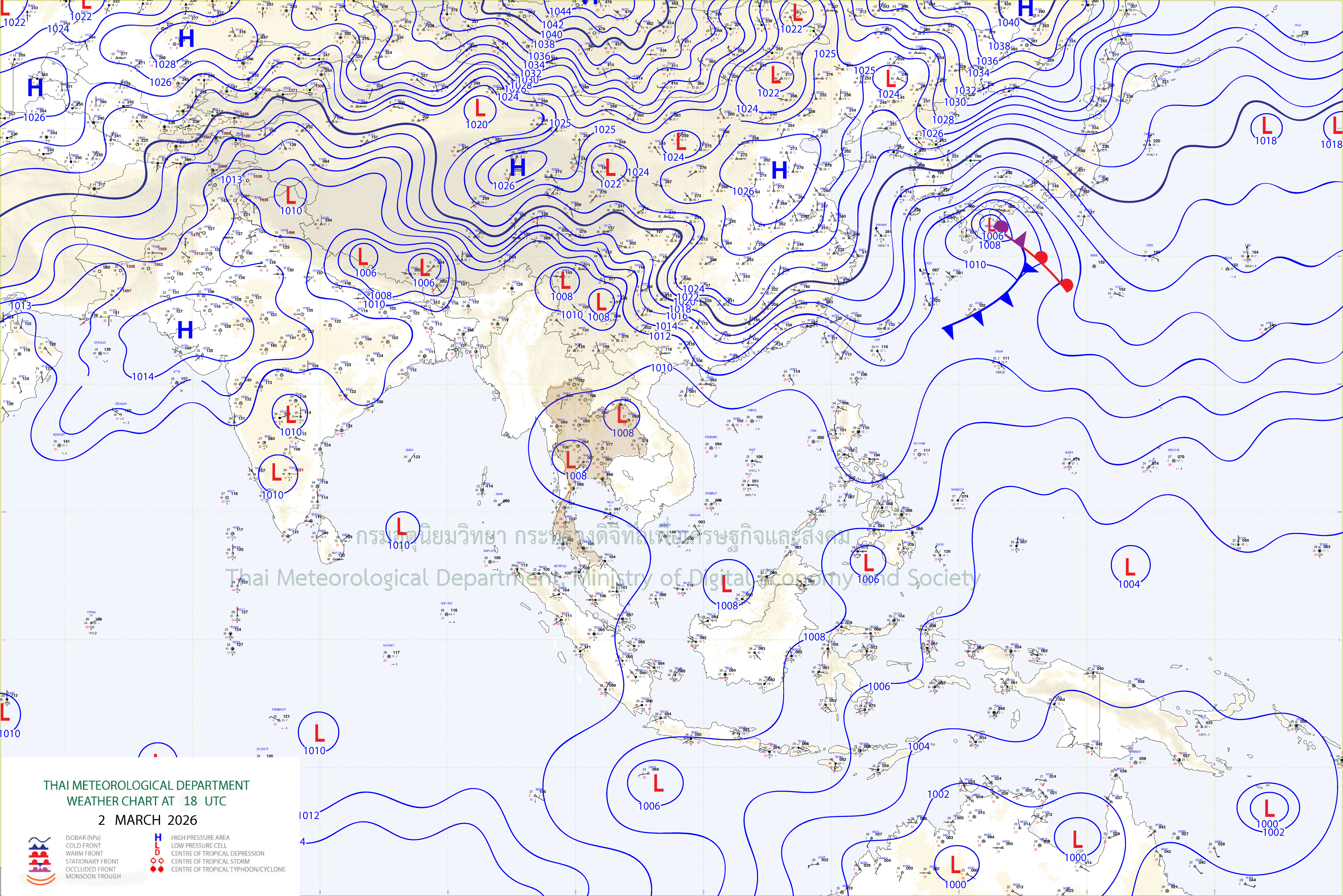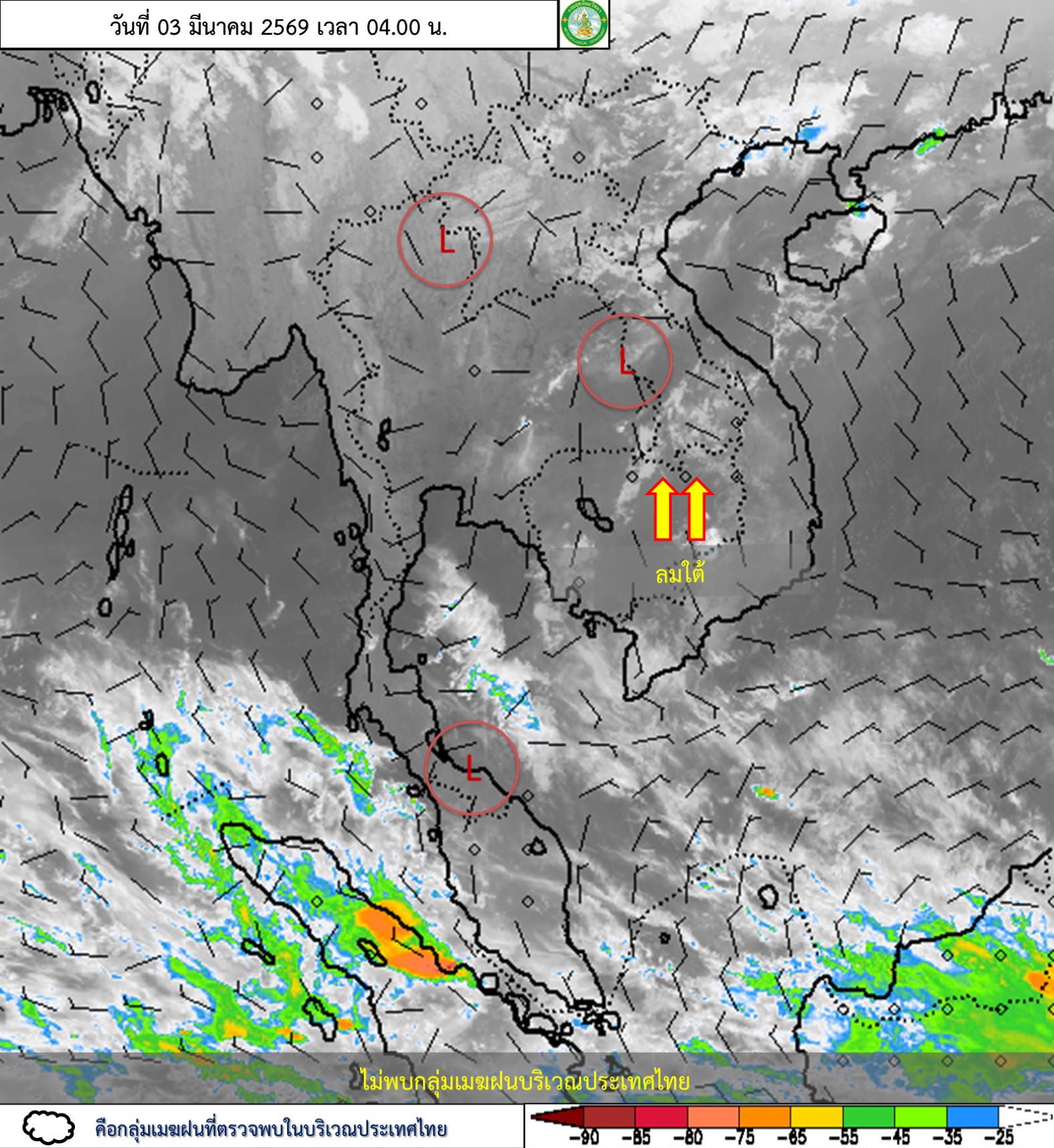 ลักษณะอากาศทั่วไป : ภาคตะวันออกเฉียงเหนือจะมีพายุฤดูร้อนเกิดขึ้น โดยมีลักษณะของพายุฝนฟ้าคะนอง ลมกระโชกแรง รวมถึงฟ้าผ่าที่อาจเกิดขึ้นได้บางพื้นที่ ทั้งนี้เนื่องจากบริเวณความกดอากาศสูงหรือมวลอากาศเย็นจากประเทศจีนแผ่ปกคลุมประเทศจีนตอนใต้แล้ว คาดว่าจะเคลื่อนเข้าปกคลุมภาคตะวันออกเฉียงเหนือและทะเลจีนใต้ในคืนวันนี้ (3 มี.ค. 69) ส่งผลทำให้มีลมใต้และลมตะวันออกเฉียงใต้พัดนำความชื้นจากทะเลจีนใต้เข้าปกคลุมภาคตะวันออกเฉียงเหนือ ในขณะที่ประเทศไทยตอนบนมีอากาศร้อน ขอให้ประชาชนบริเวณดังกล่าวระวังอันตรายจากพายุฤดูร้อน โดยหลีกเลี่ยงการอยู่ในที่โล่งแจ้ง ใต้ต้นไม้ใหญ่ สิ่งปลูกสร้าง และป้ายโฆษณาที่ไม่แข็งแรง สำหรับเกษตรกรควรเสริมความแข็งแรงให้ไม้ผล และเตรียมการป้องกันความเสียหายที่อาจเกิดขึ้นกับผลผลิตทางการเกษตรและสัตว์เลี้ยง รวมทั้งดูแลรักษาสุขภาพในช่วงที่สภาพอากาศที่ร้อนไว้ด้วย